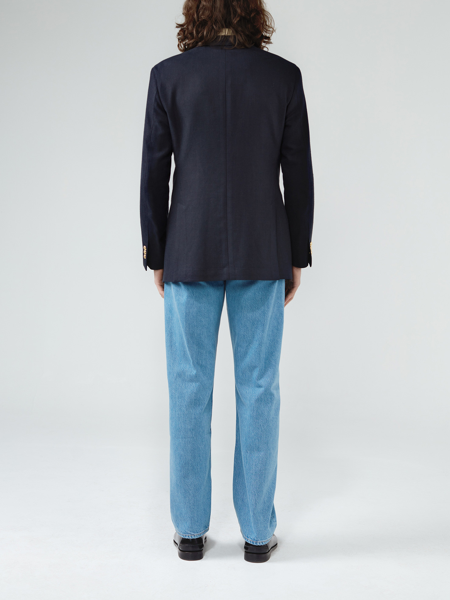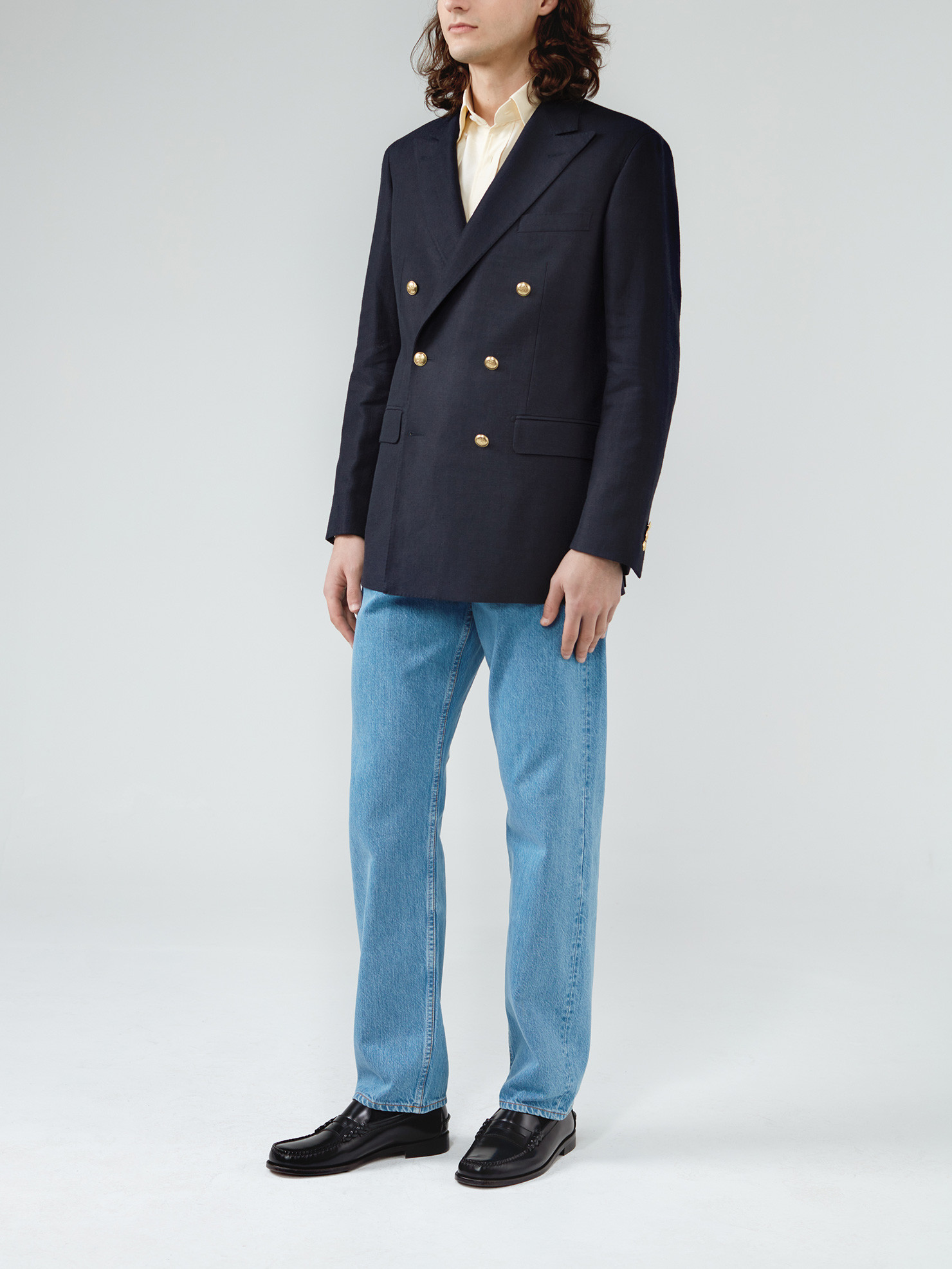 Navy linen double-breasted blazer, classical notch lapel, soft shoulder, classical chest pocket, straight flap side pockets, two back slits, gold blazer buttons.