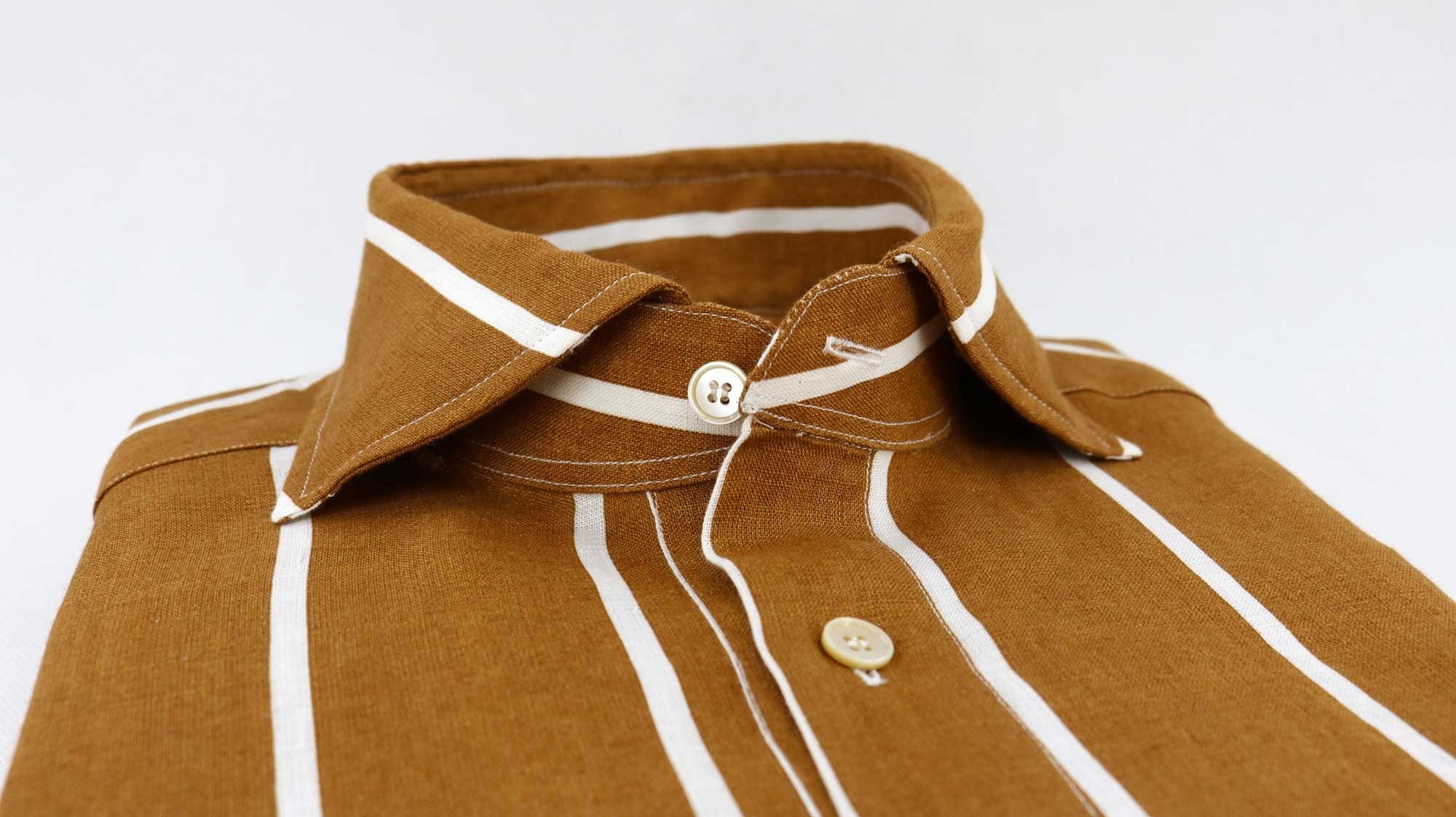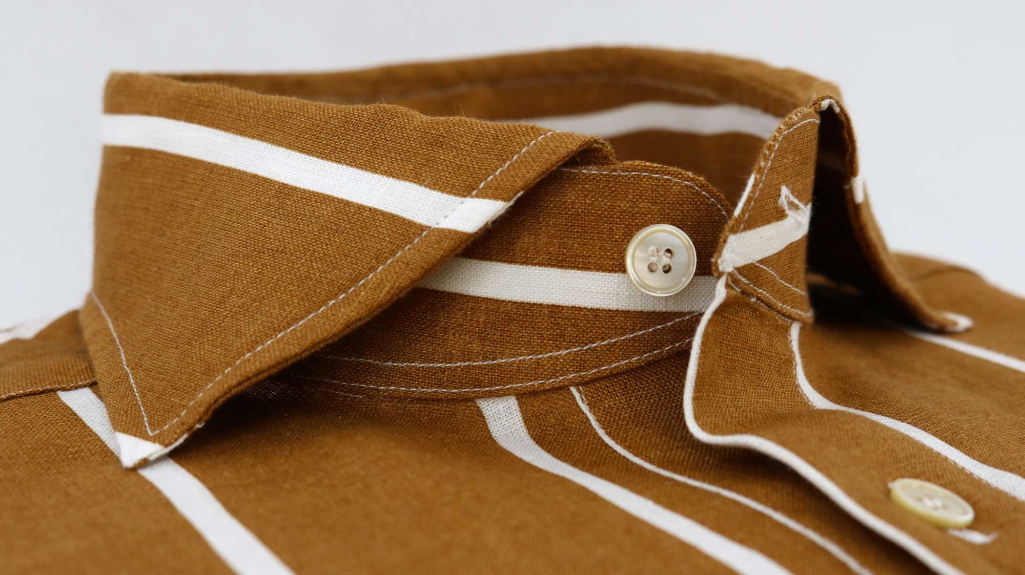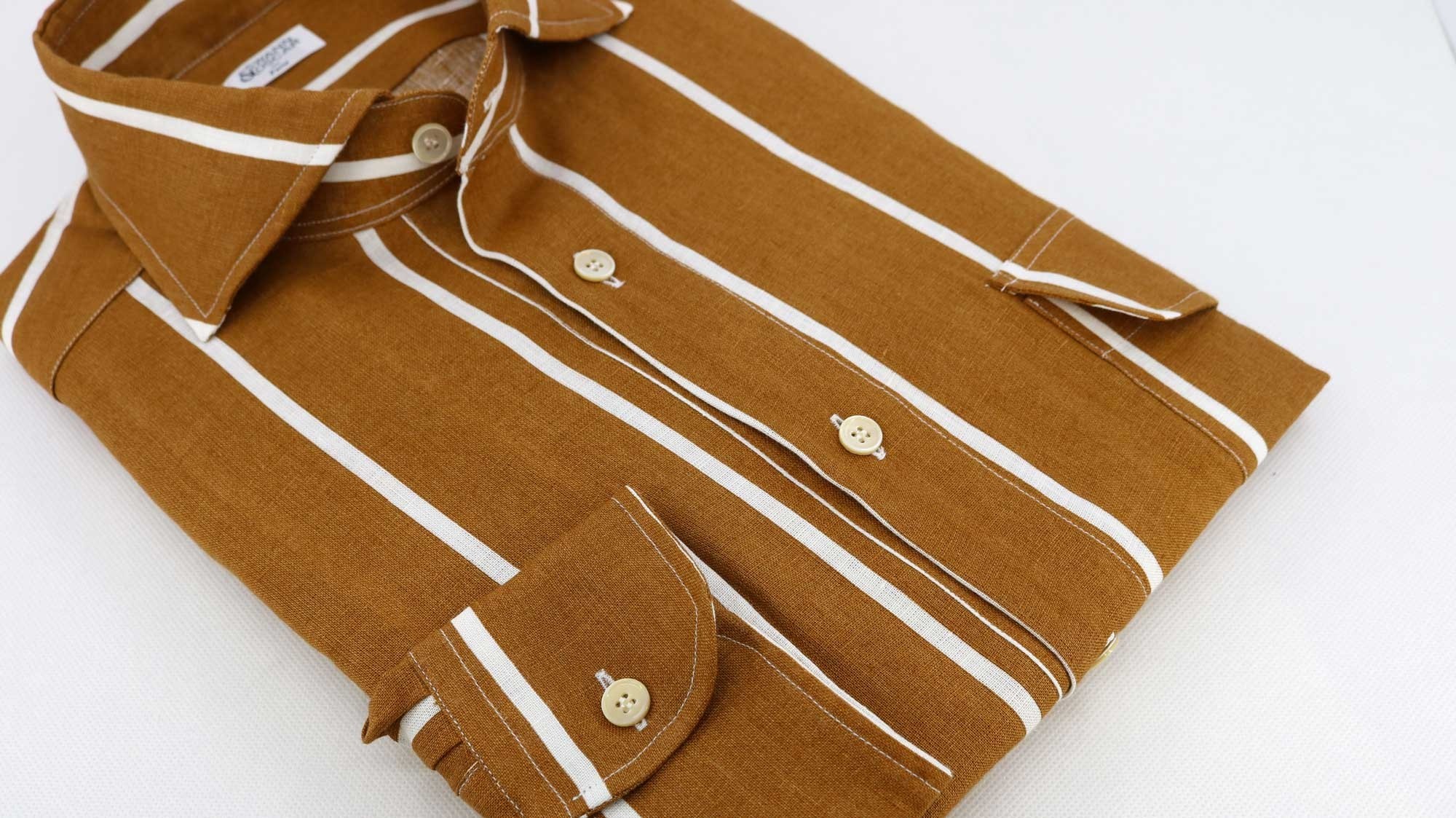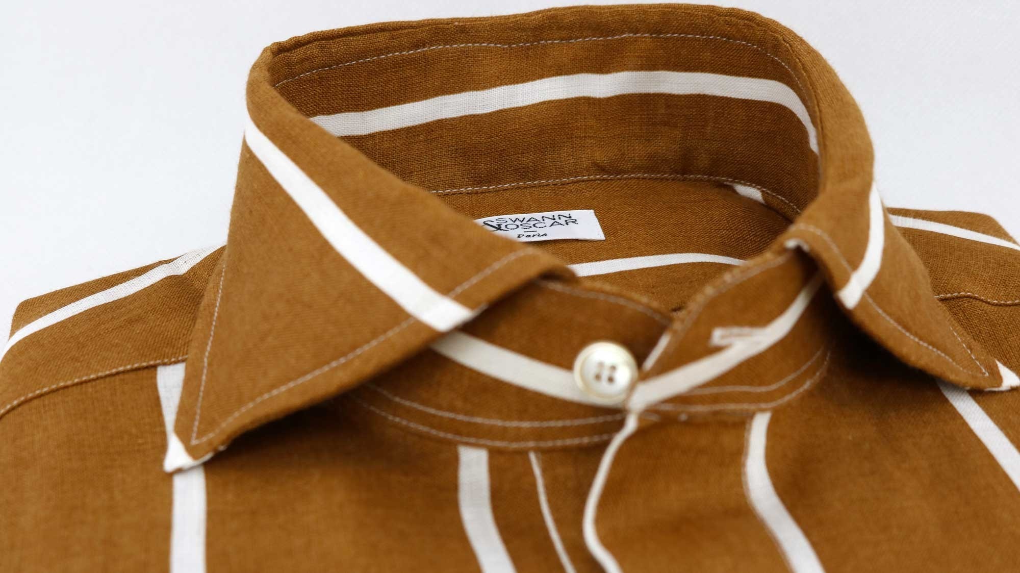 Albini striped linen, sublime, warm and intense ochre colour. A shirt for the beach, the bar or a summer dinner. Camp collar or ultra-soft classic collar because the weather's hot and you're good-looking.