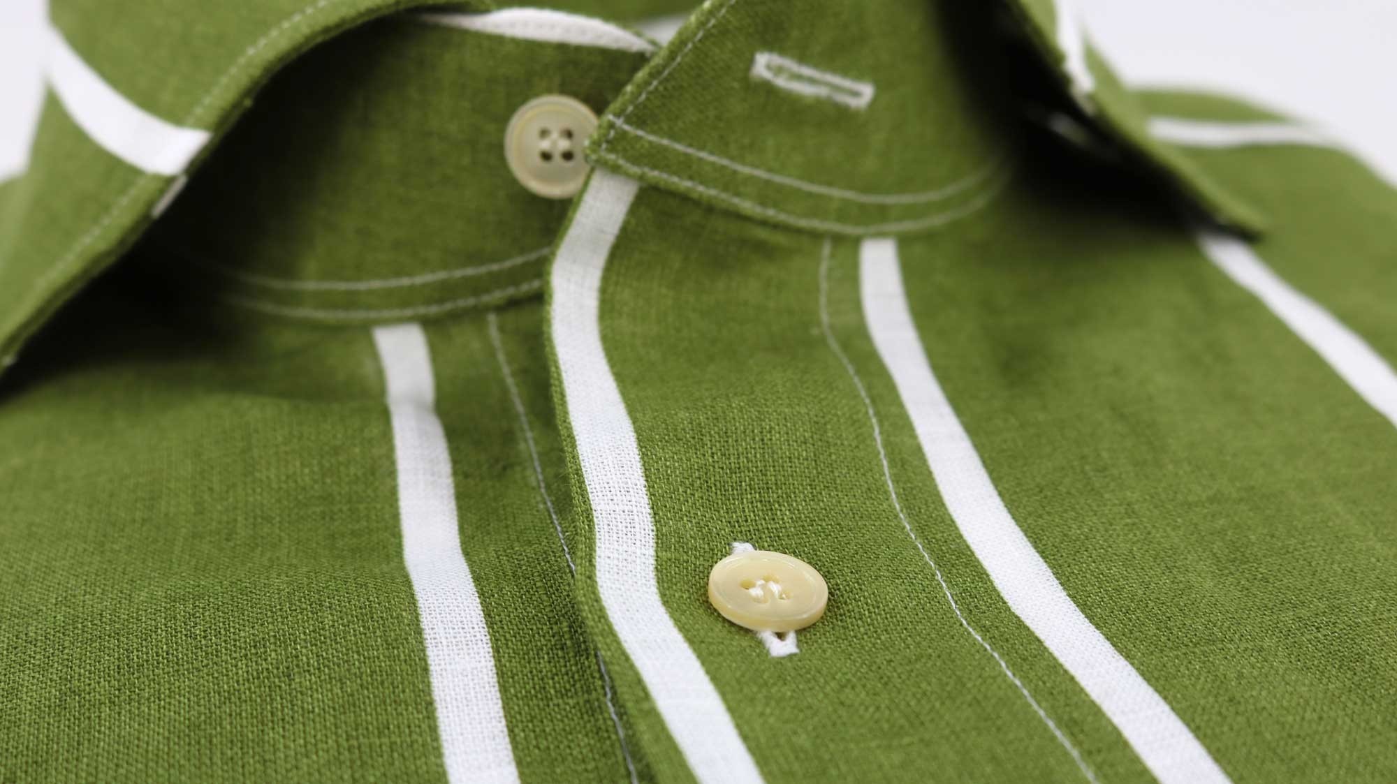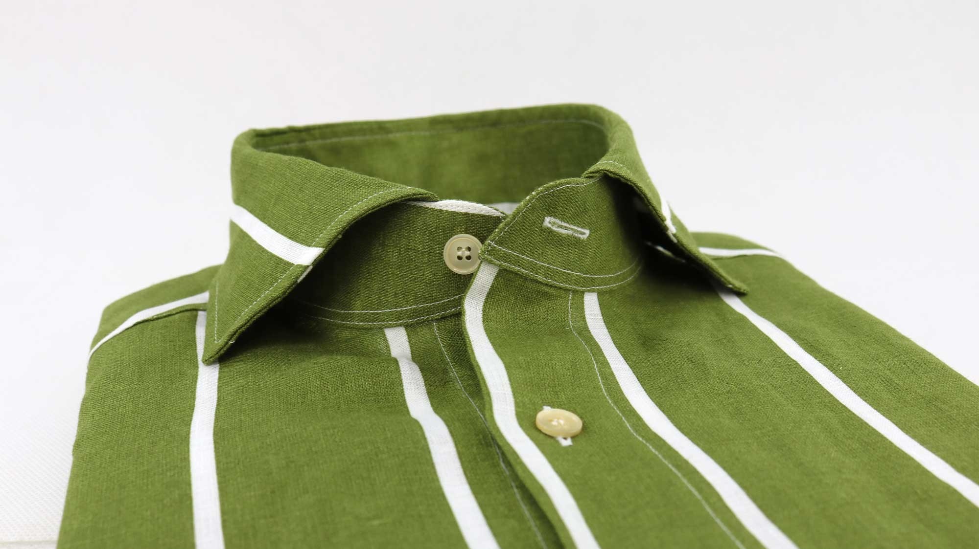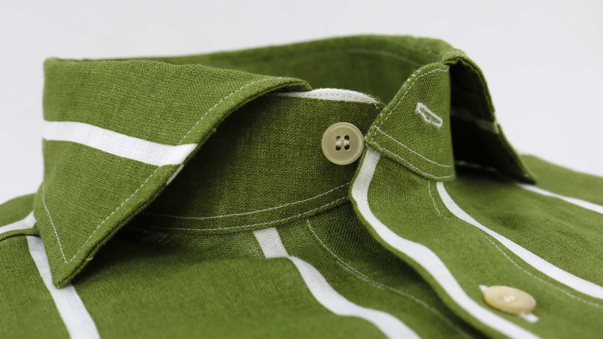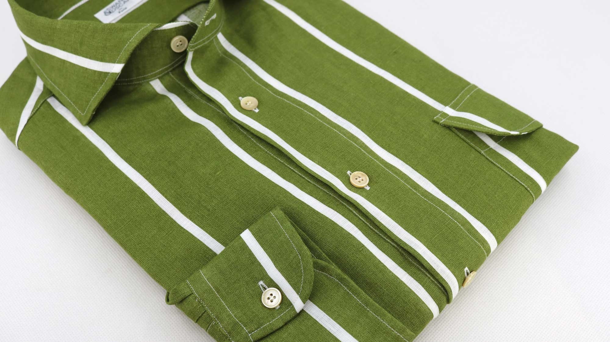 Albini striped linen, sublime intense green. A shirt for the beach, the bar or a summer dinner. Camp collar or ultra-soft classic collar because the weather's hot and you're good-looking.