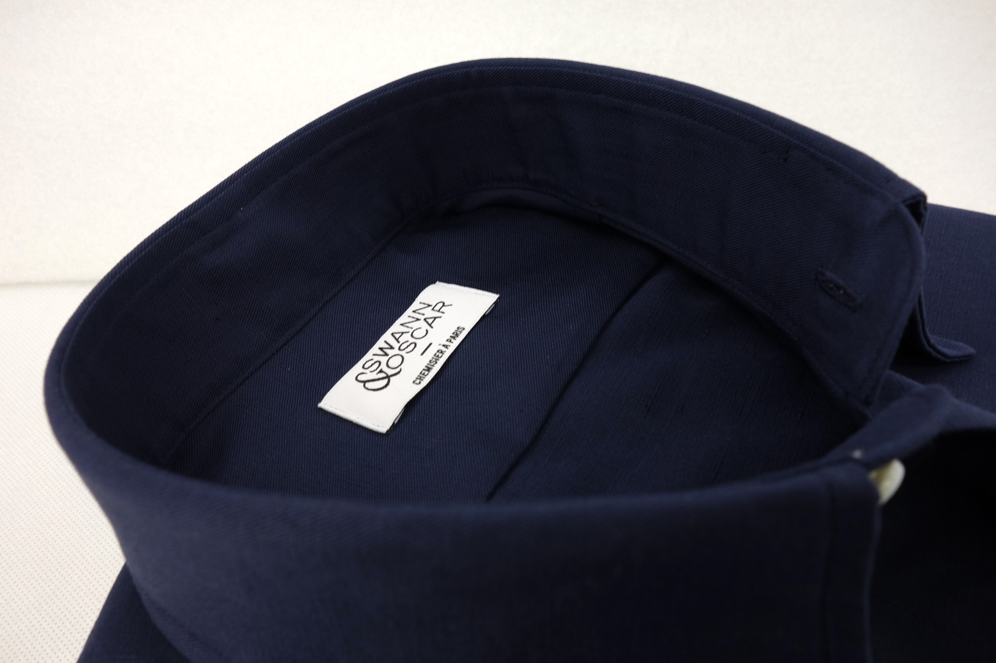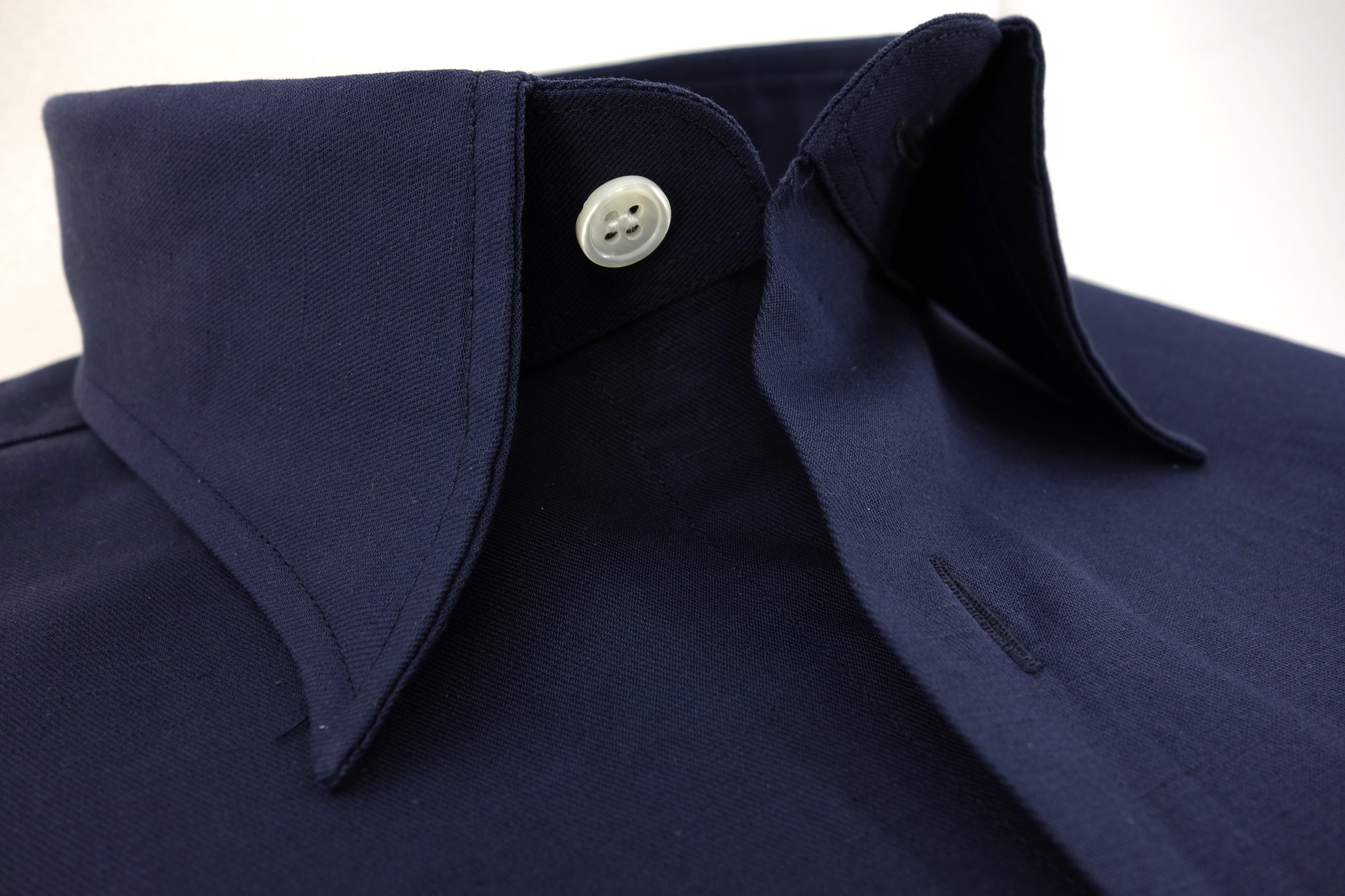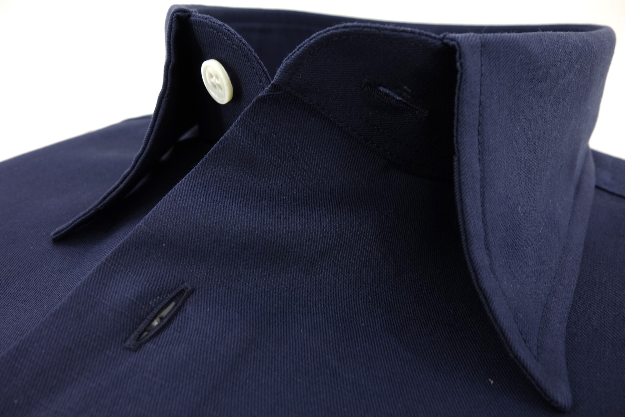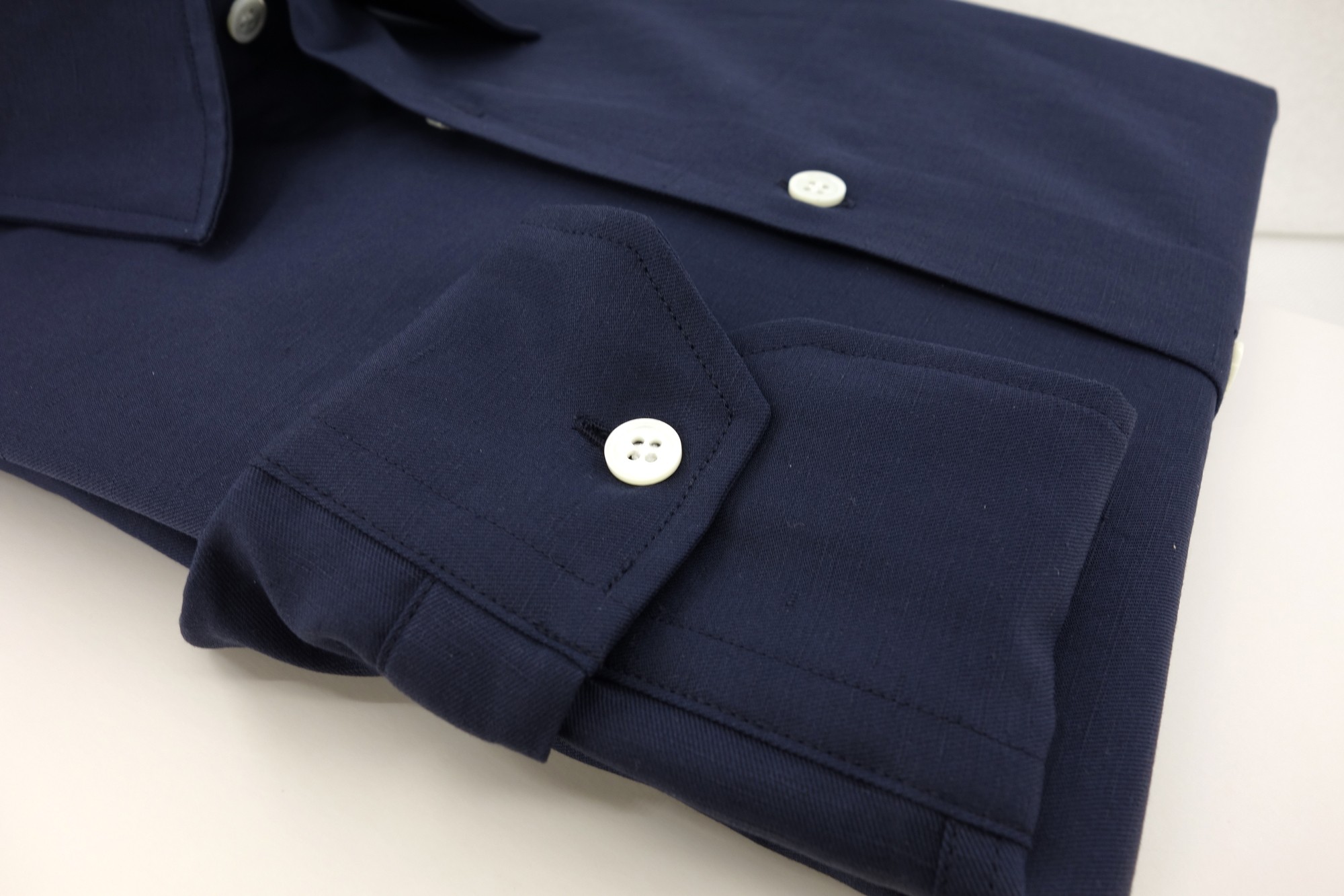 Navy blue cotton gabardine and linen. An ideal fabric for desert-wear shirts with patch pockets with flaps; ideal for summers on the beach or winters on the dunes of the Sahel.