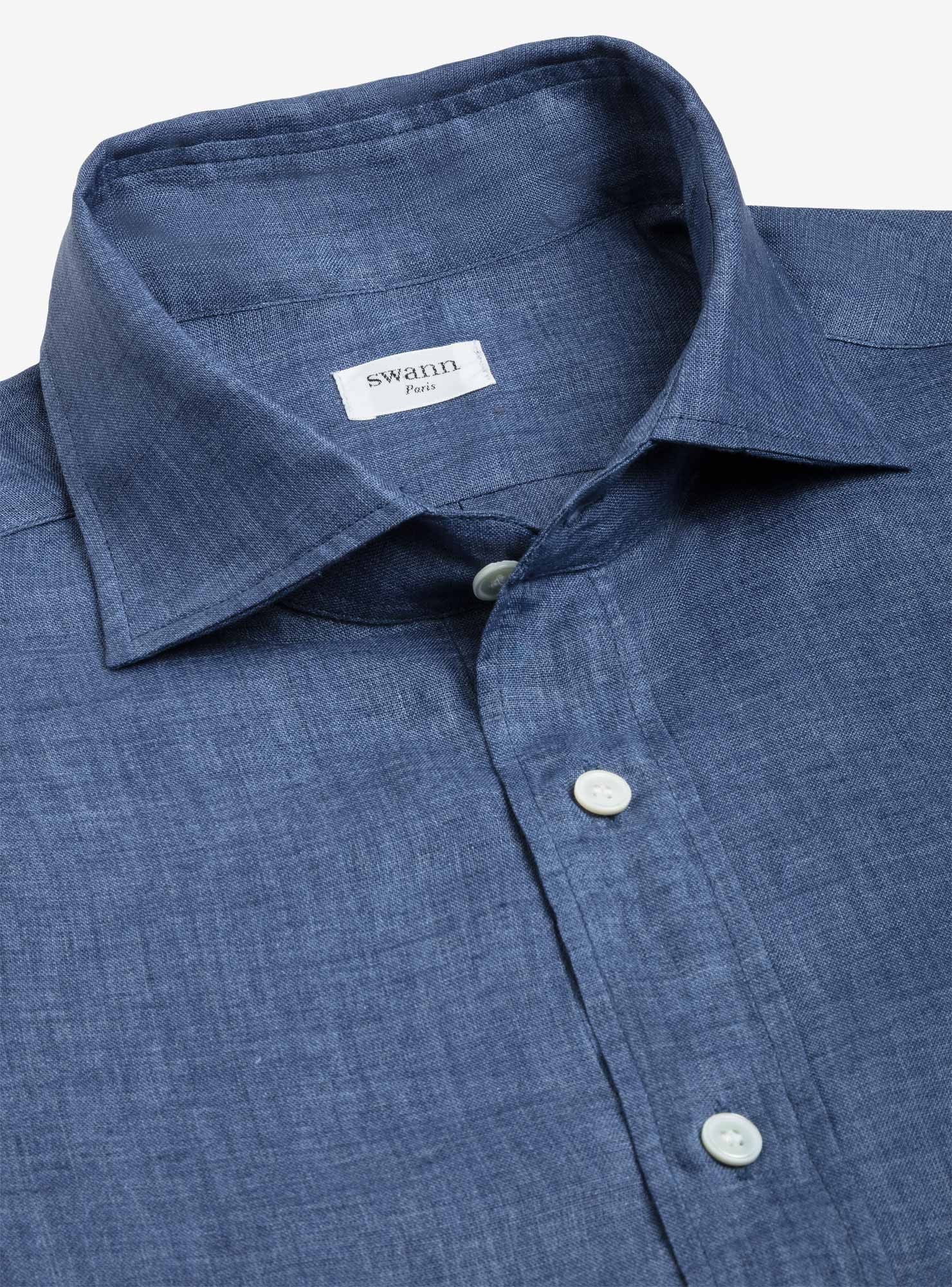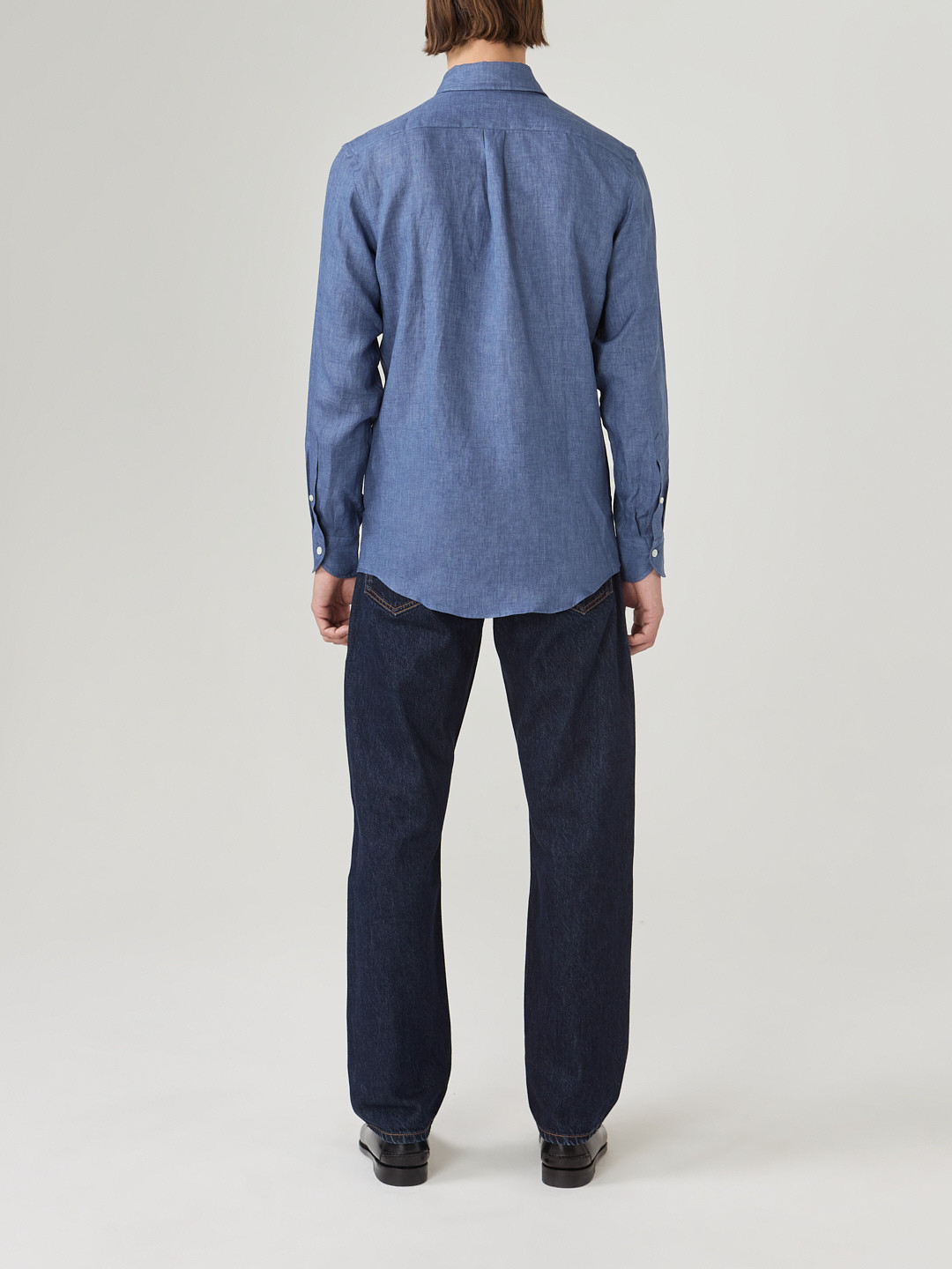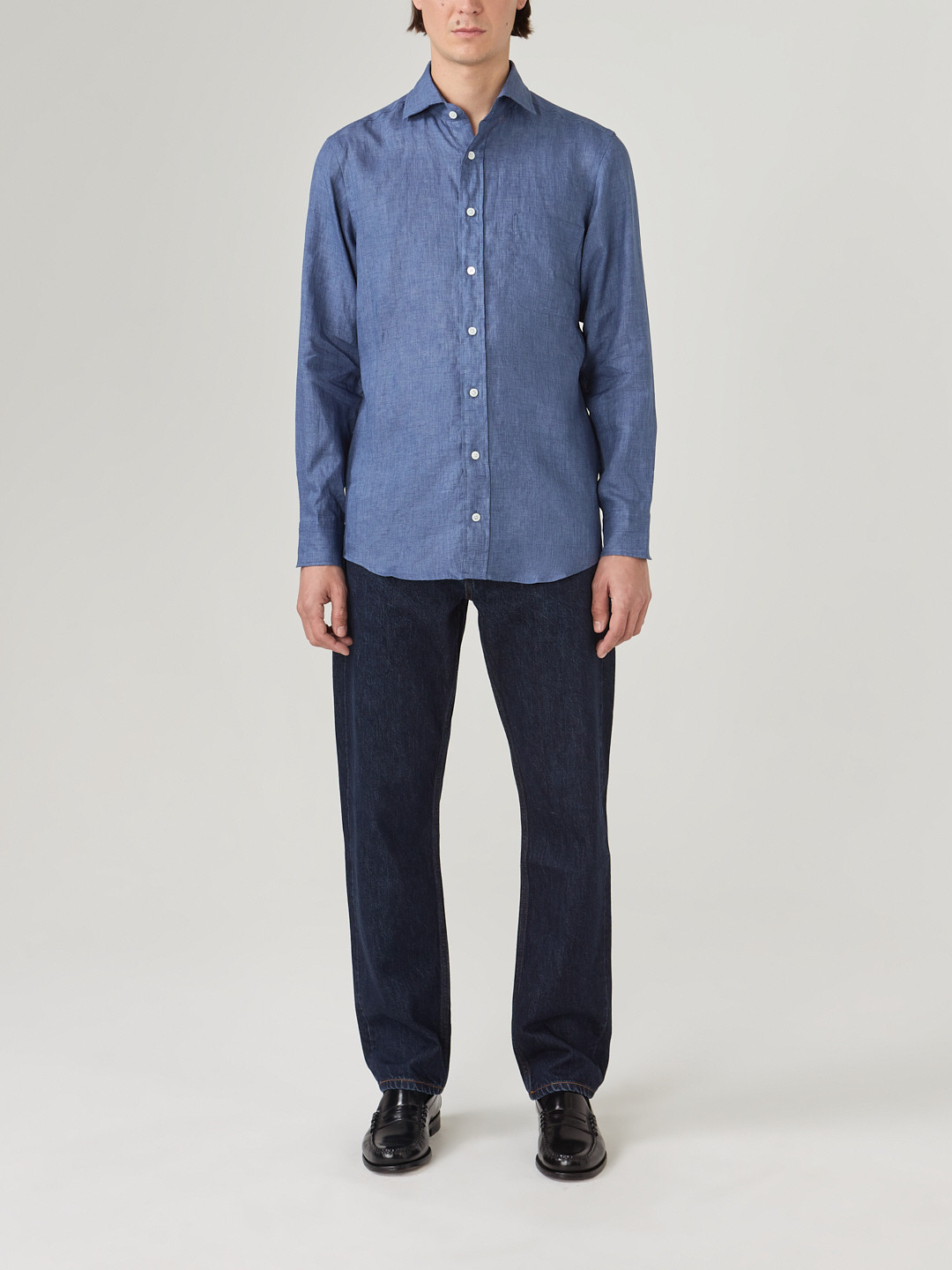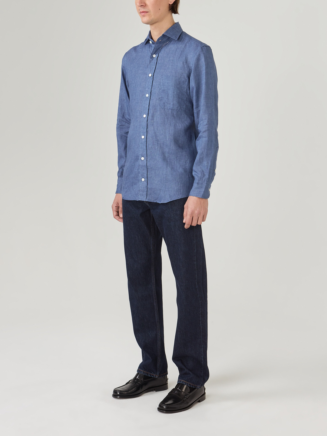 Thomas Mason faded linen, plain blue. Supple and comfortable, it will continue to fade and patina over time.