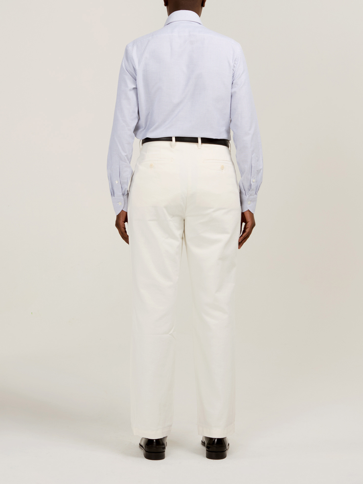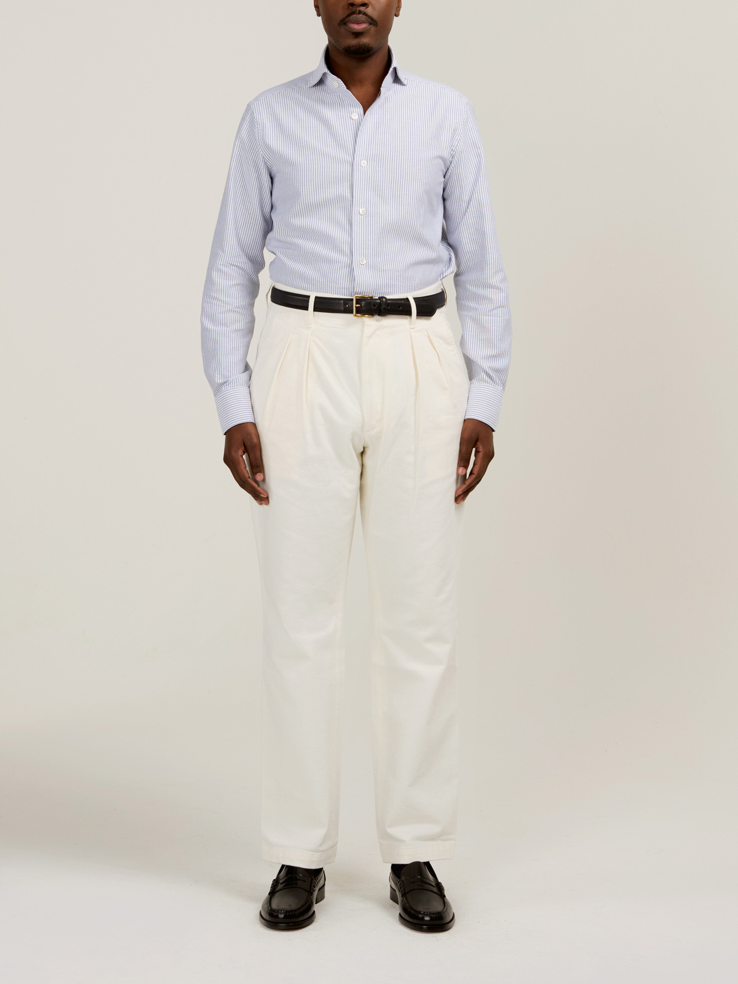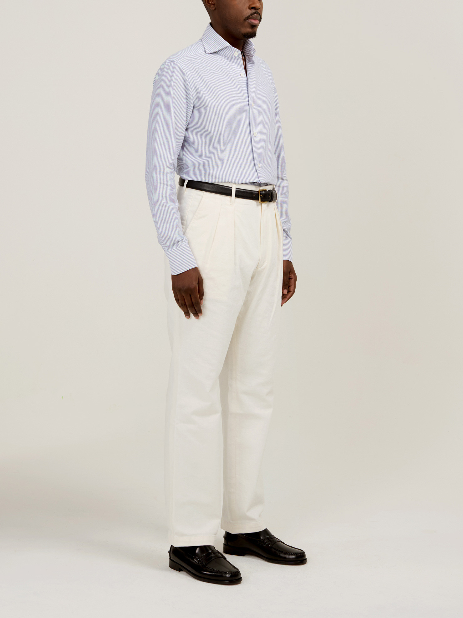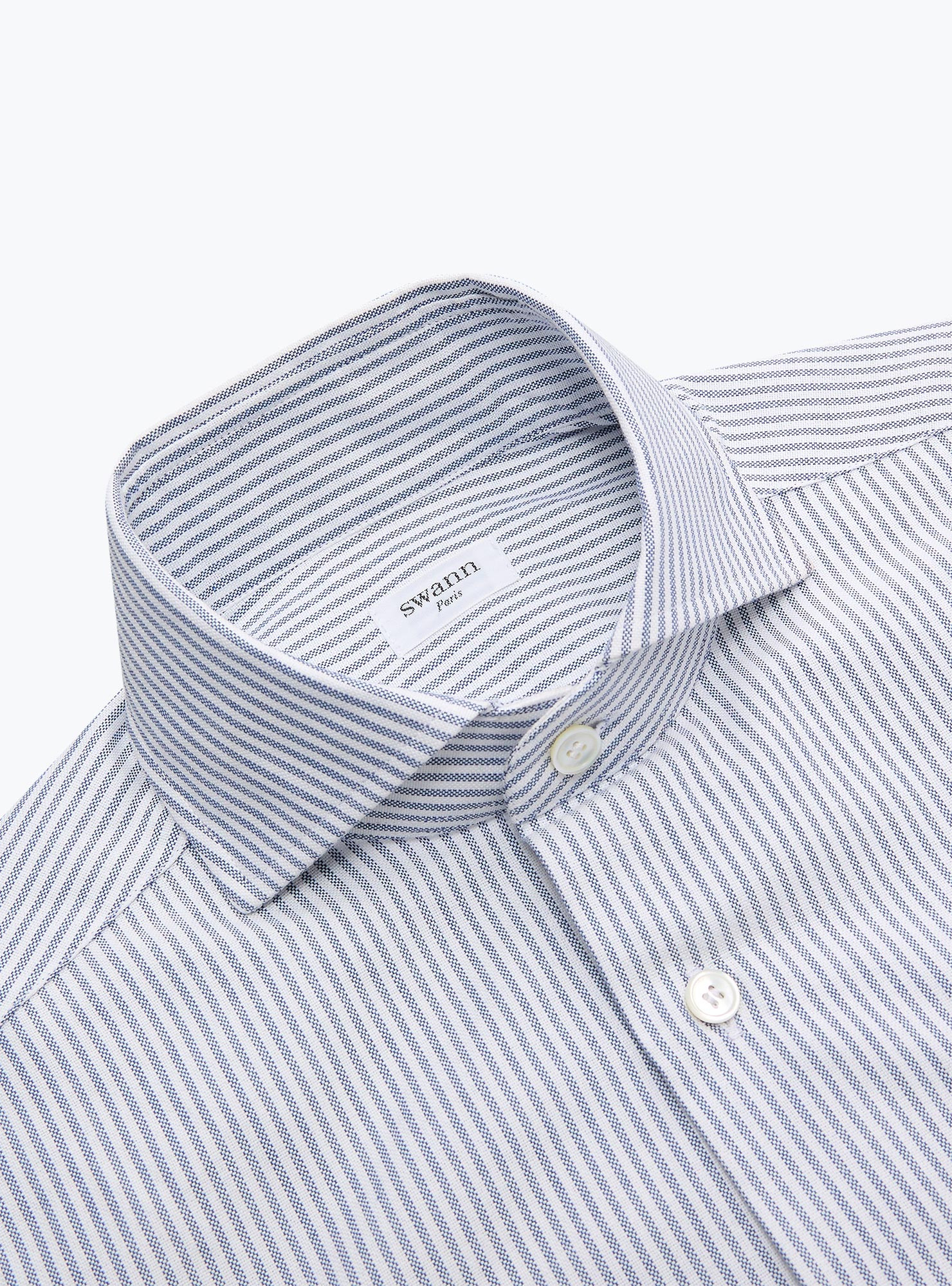 Thick blue striped oxford, a rustic and soft fabric, perfect for sporty OCBD shirts. The Ivy shirt with button-down collar.