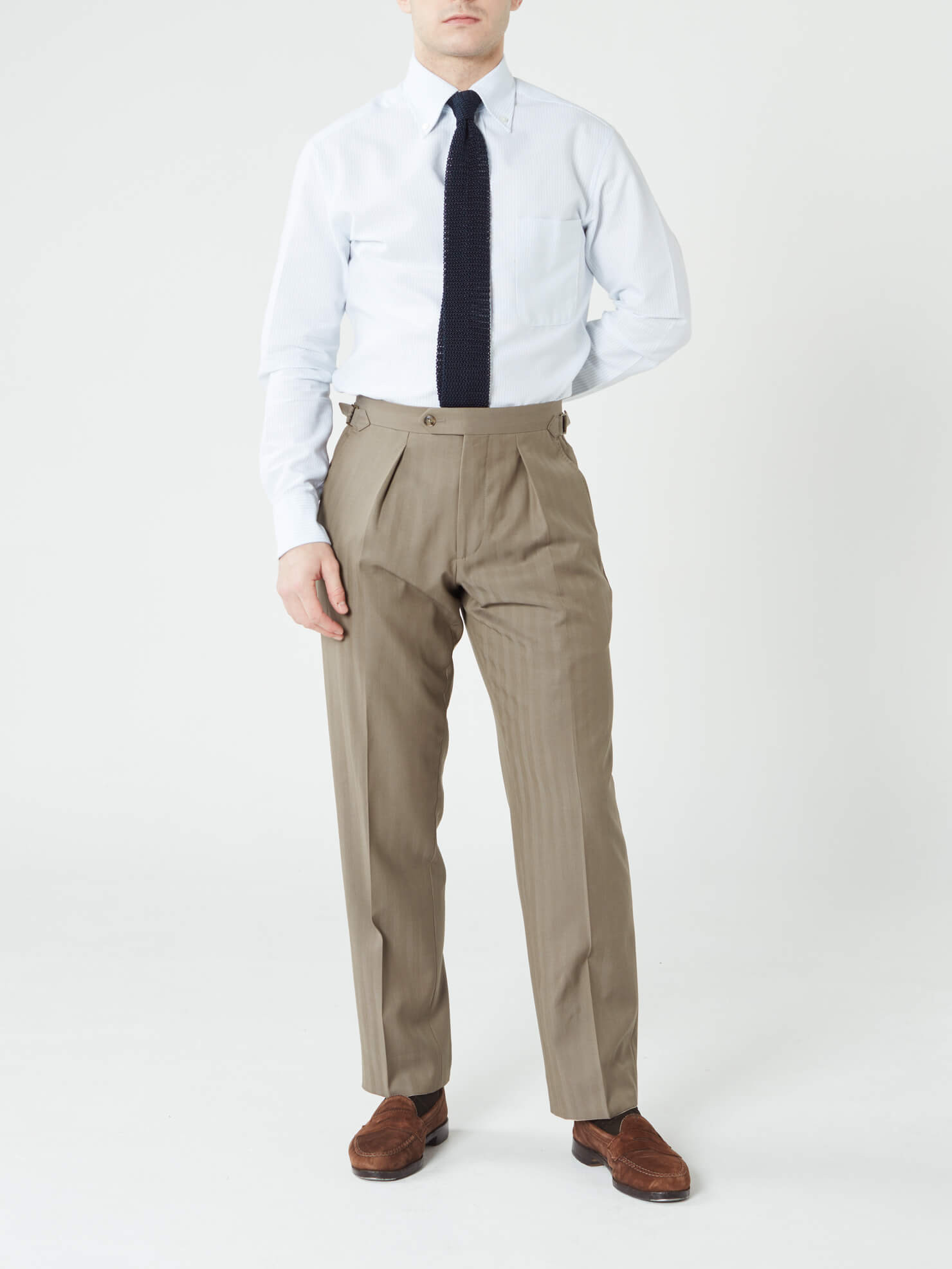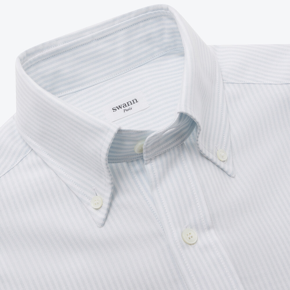 Thick, light blue striped oxford, a rustic, soft fabric perfect for sporty OCBD shirts. The Ivy shirt with button-down collar.