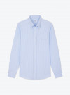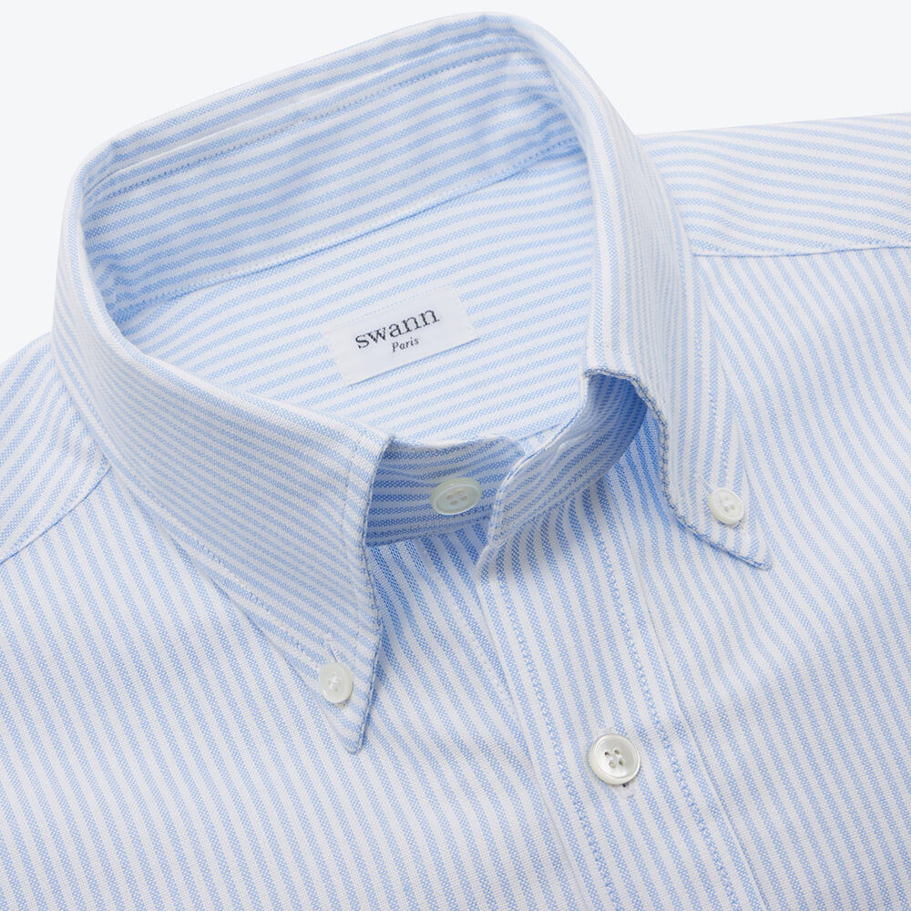 Thick sky blue striped oxford, a rustic and soft fabric, perfect for sporty OCBD shirts. The Ivy shirt with button-down collar.