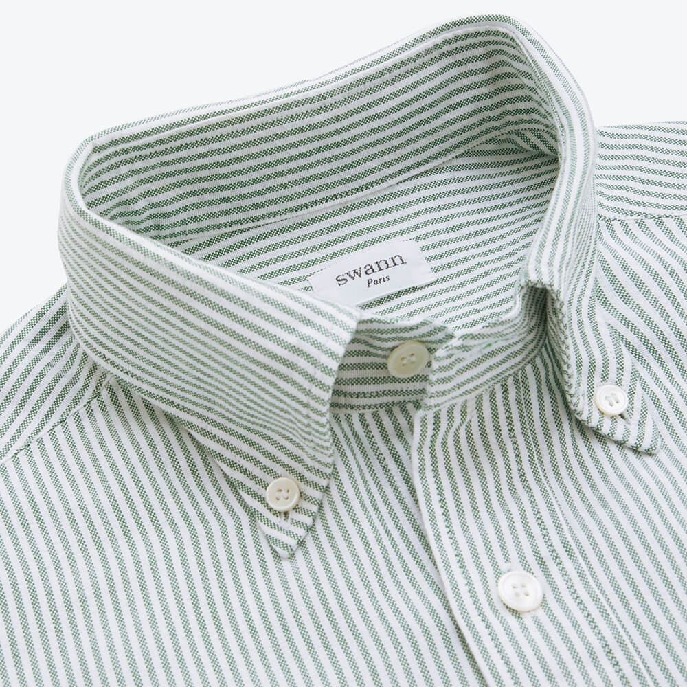Thick green striped oxford, a rustic and soft fabric, perfect for sporty OCBD shirts. The Ivy shirt with button-down collar.