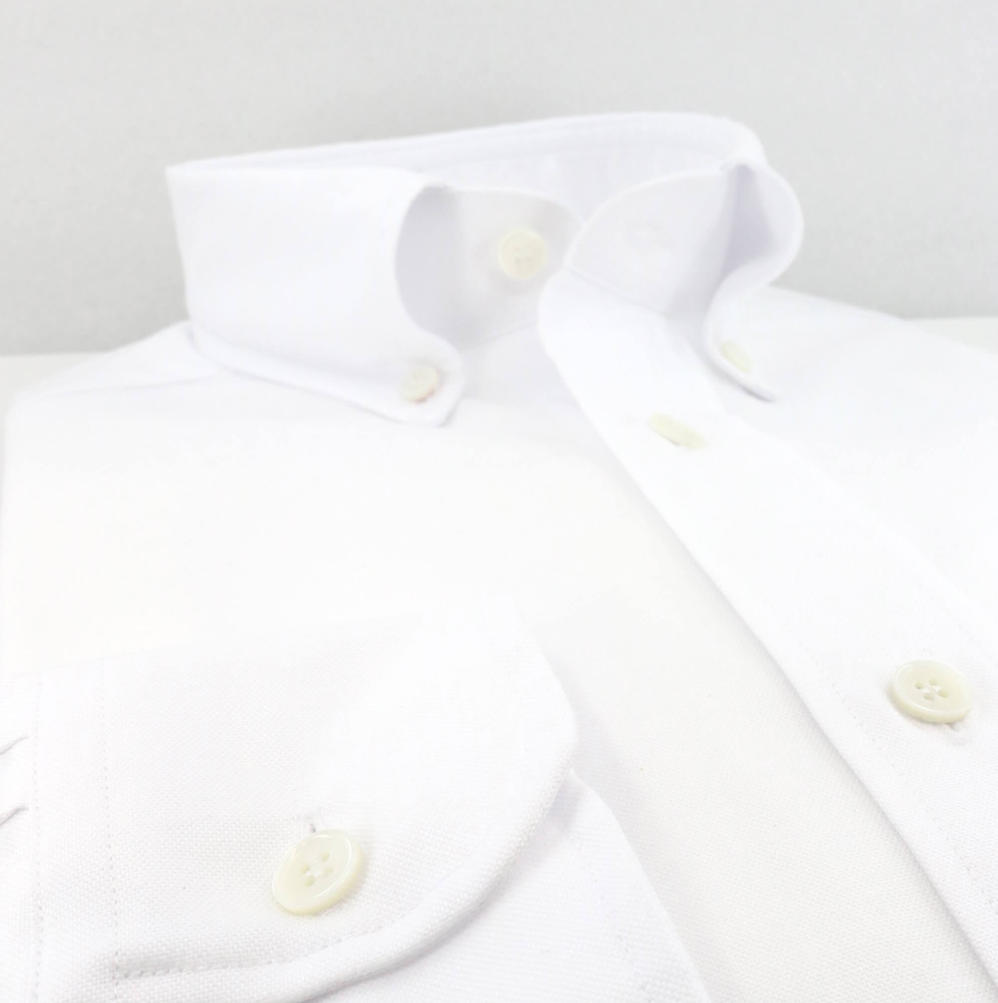 Single ply solid white Oxford weave by Mileta. A thick fabric for a great fit to make this a staple of your wardrobe. We recommend that you pair it with a button-down collar, a visible button placket and a pocket for an authentic college shirt.