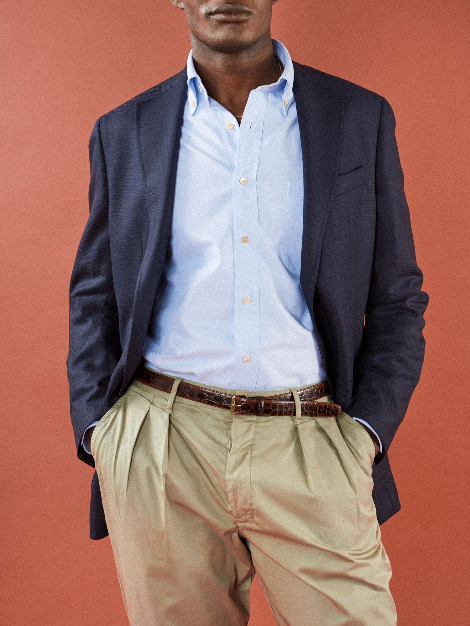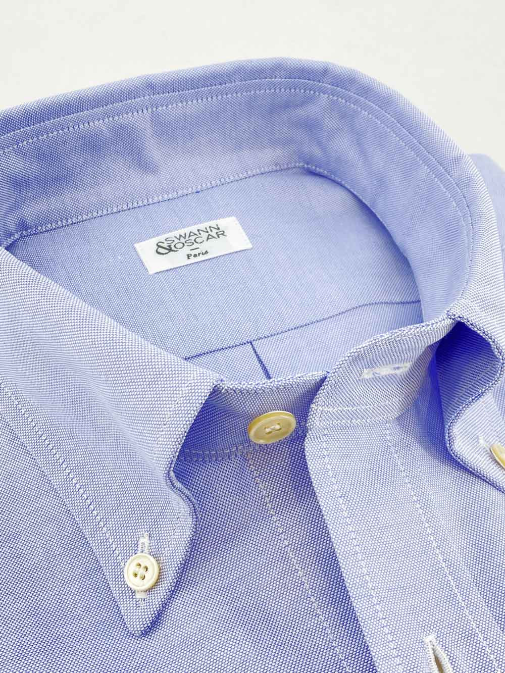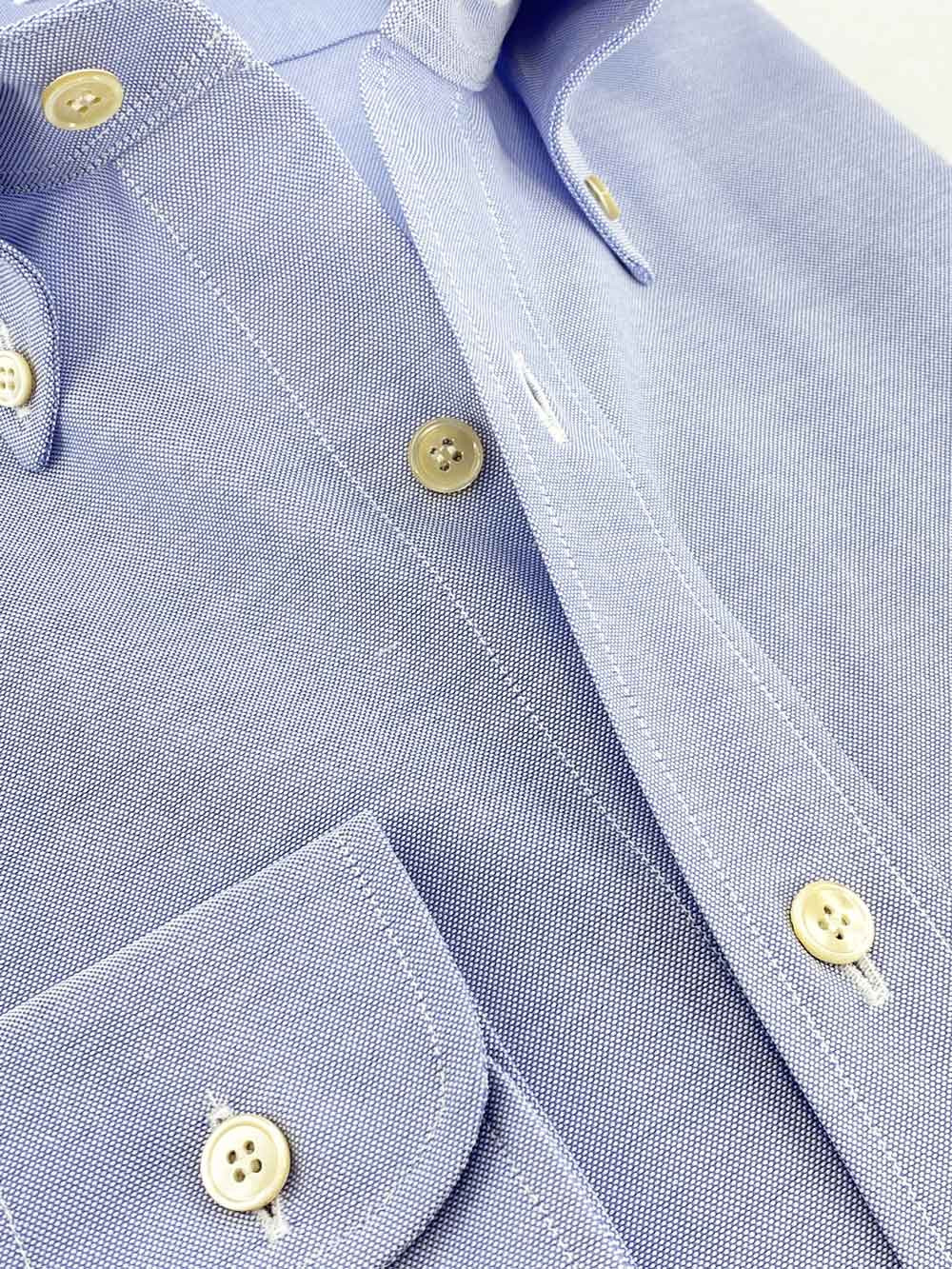 Albini blue plain oxford. A great classic, a solid construction to be worn in winter and summer that will become patinated and gain in comfort over time. Probably our best quality of thick oxford.