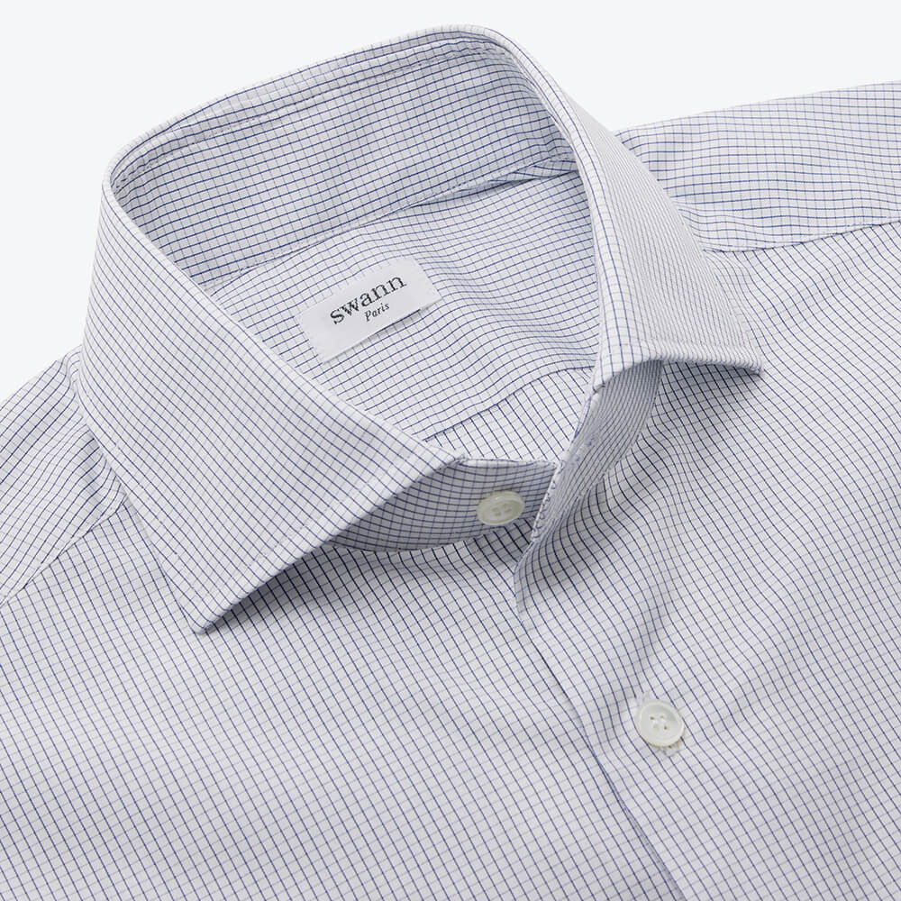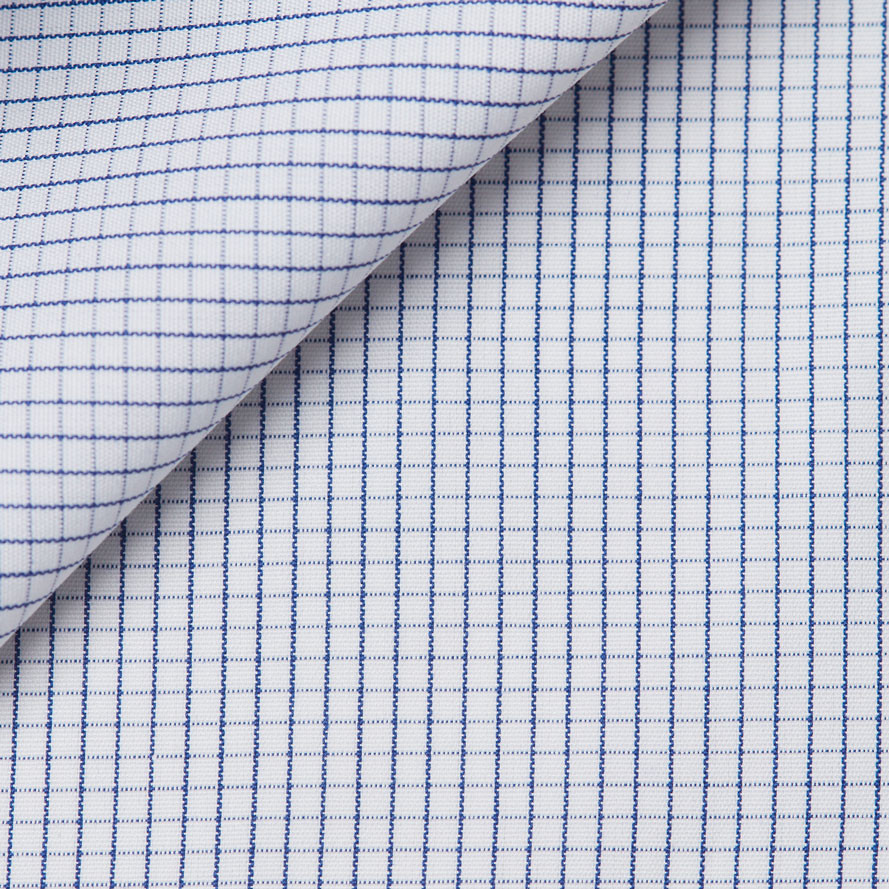 Poplin blue check two-ply, a classic. Ideal for classic dress shirts or button-down collars.