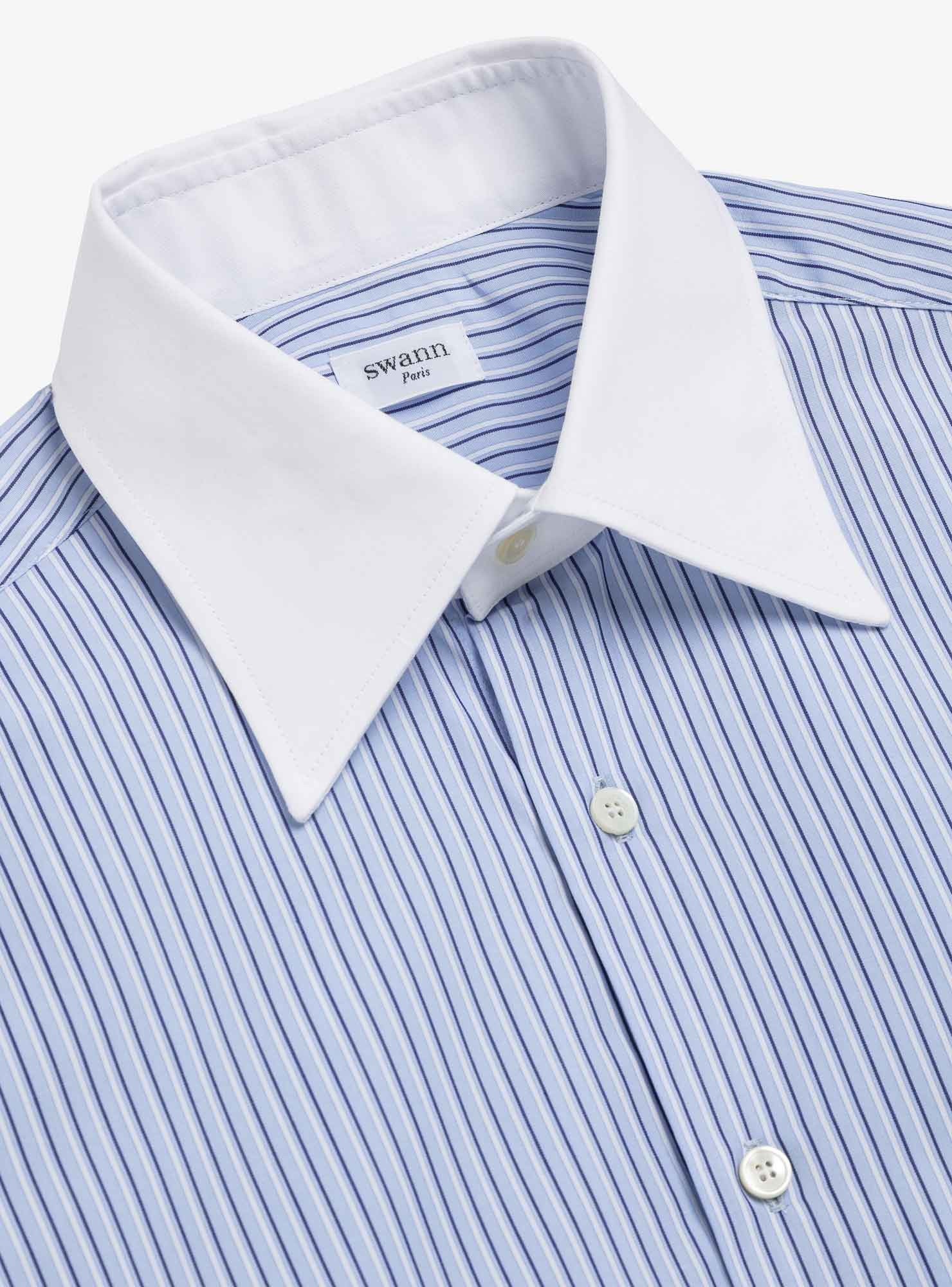 Popeline 120/2 Thomas Mason double stripes blue and white. Woven in Italy, the fabric is then washed for a soft, supple matte finish.