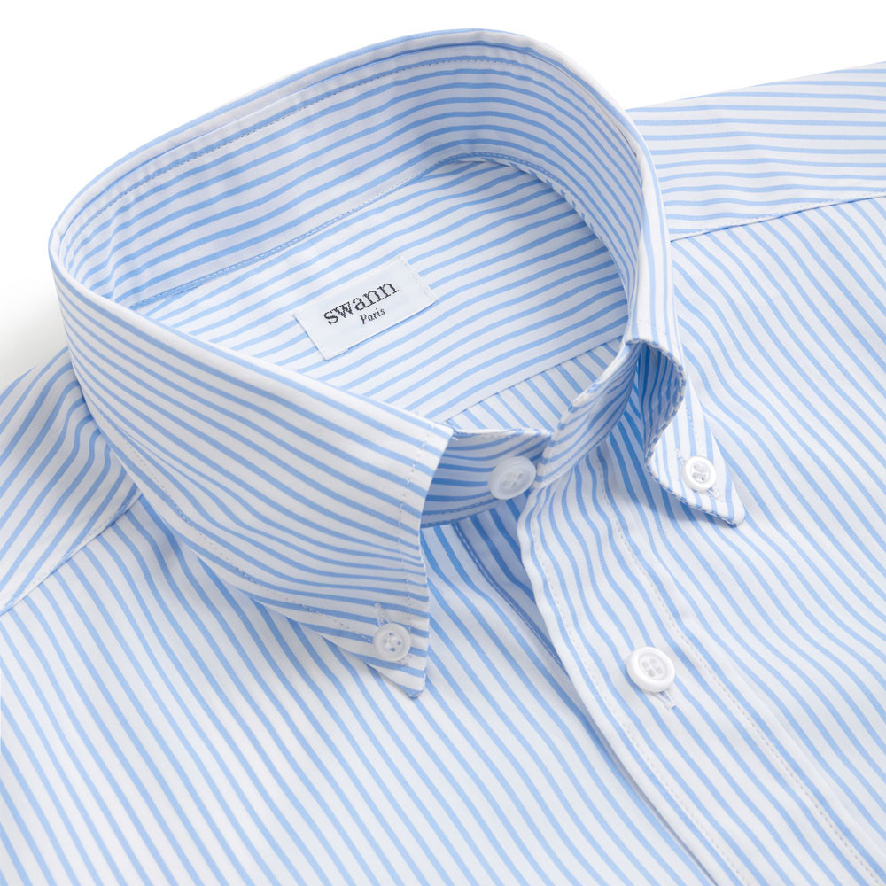 Blue striped poplin 120's two ply. Wide stripes, ideal for an elegant summer shirt under a blazer or very casual with a very soft button down collar.