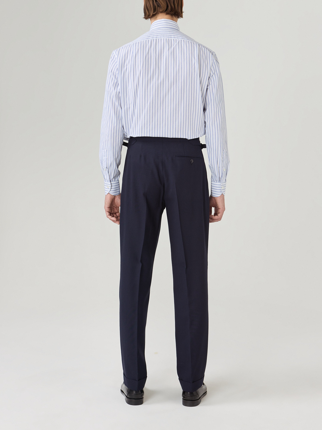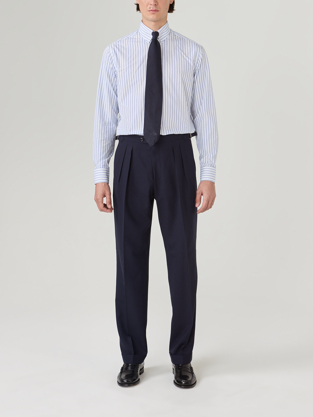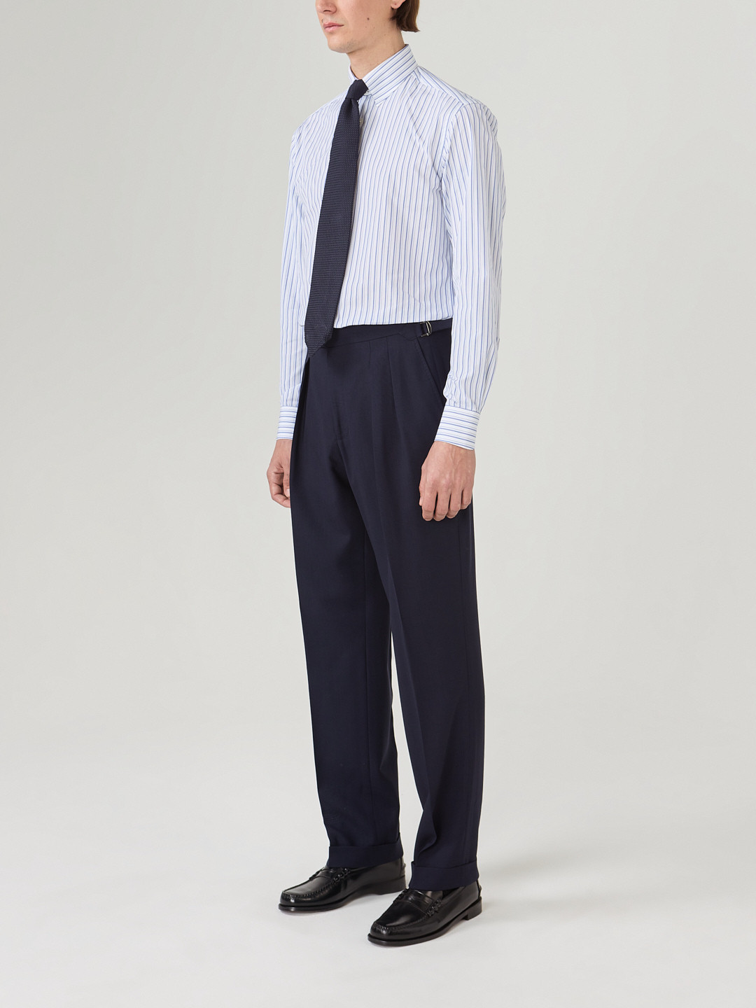 Popeline 120/2 Thomas Mason double stripes blue and white. Woven in Italy, the fabric is then washed for a soft, supple matte finish.