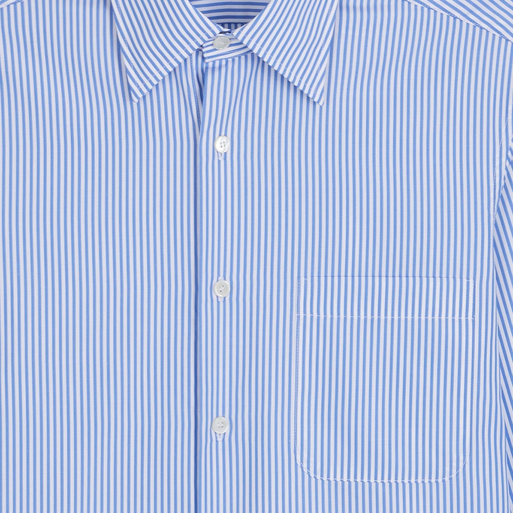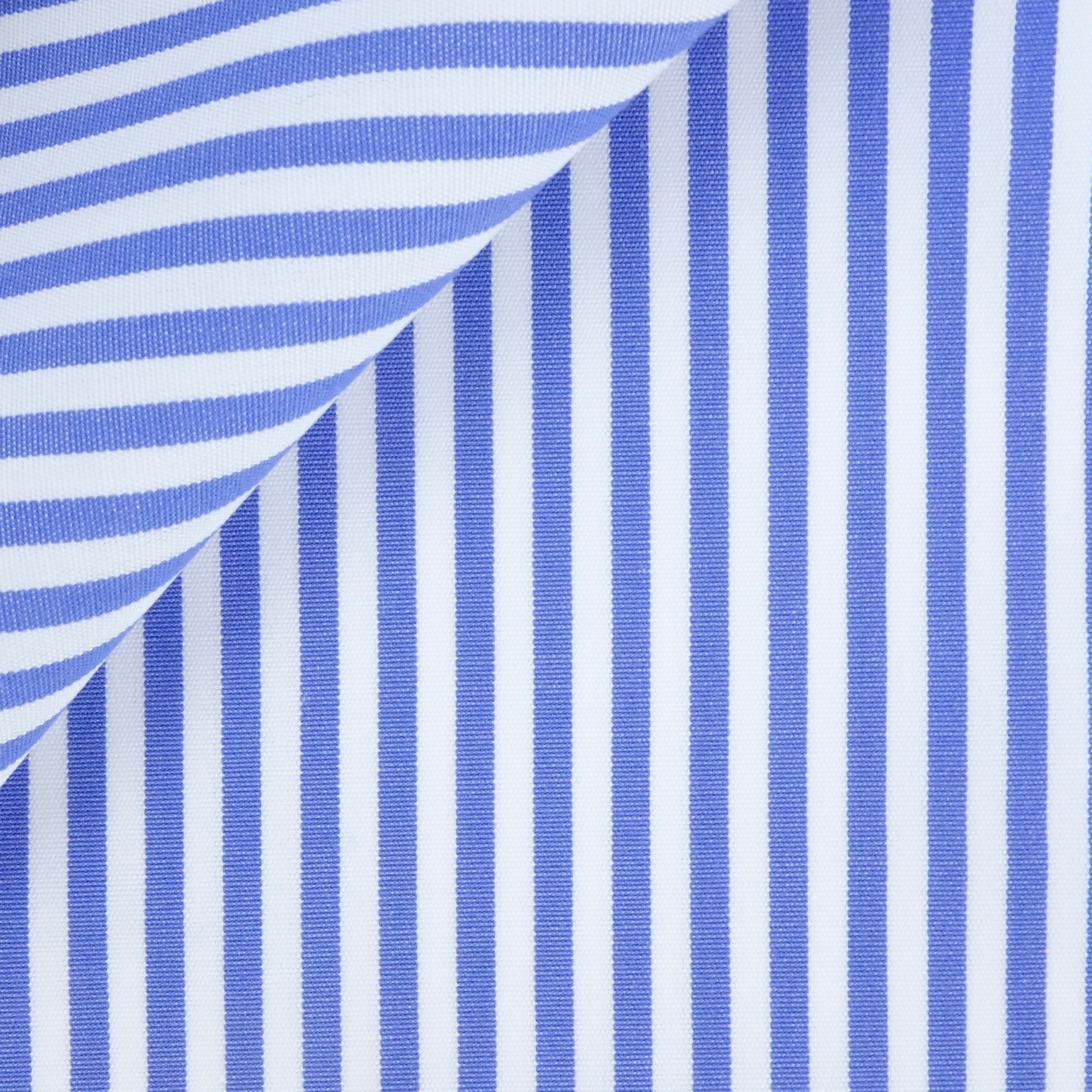 Chemise en popeline double retors, rayé bleu, col hirondelle, 1 poche. Tissu Easy Care facile à repasser. Cette chemise est un permanent chez nous, un modèle classique indémodable de notre collection héritage. Rayure bleue qui se marie aussi bien avec les costumes marine que les costumes gris.