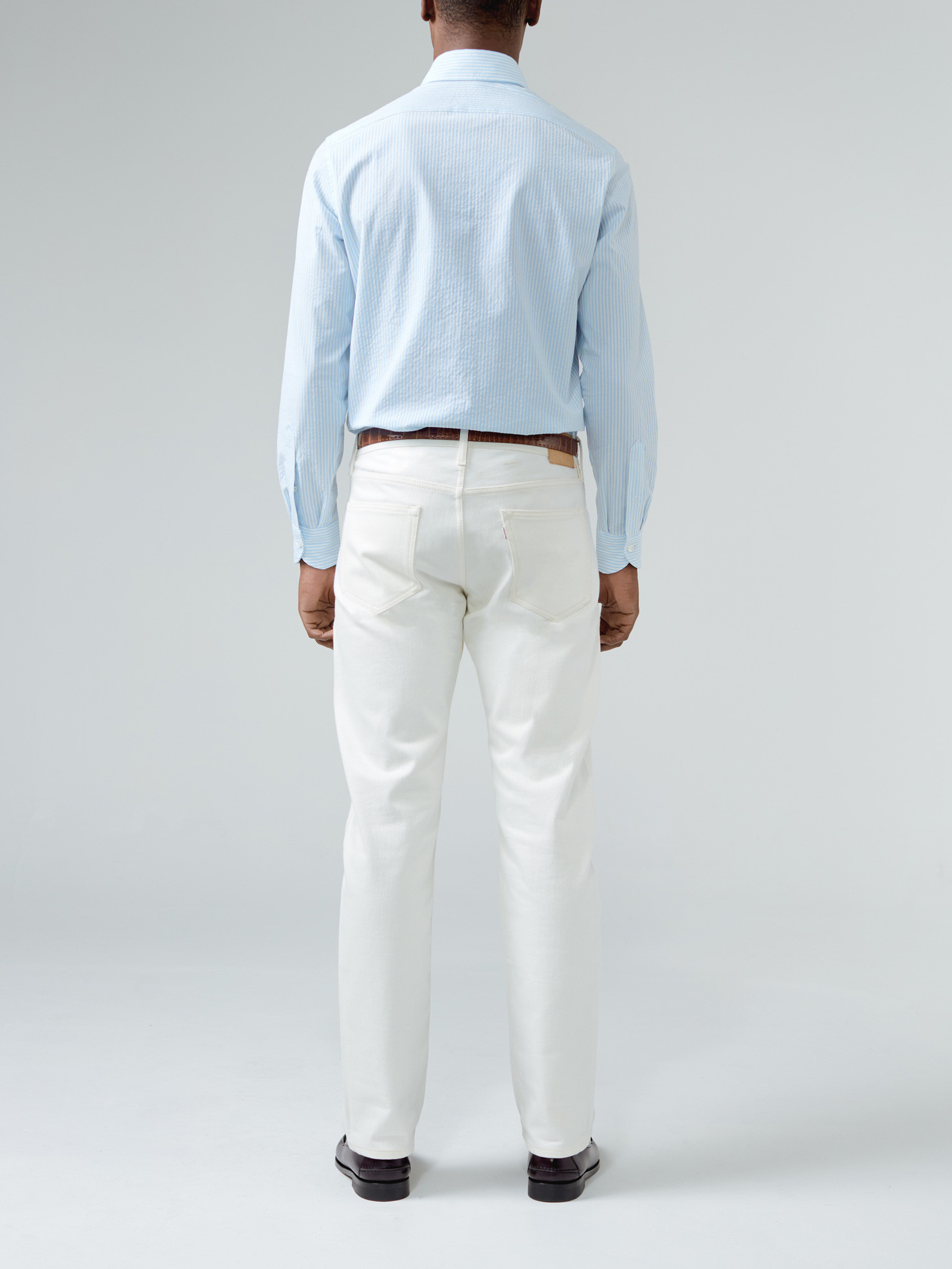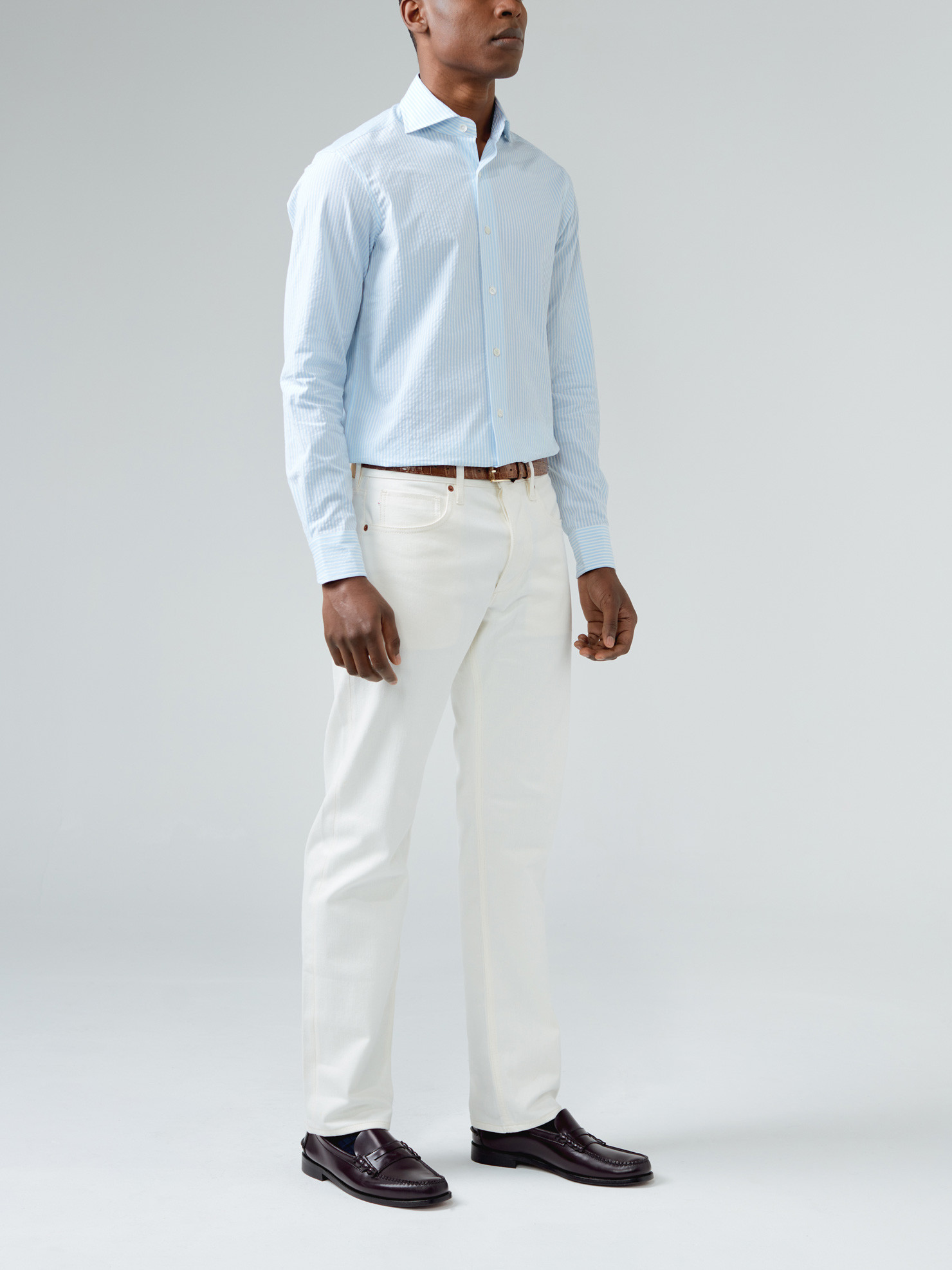 Blue striped seersucker, Thomas Mason. Seersucker has little wrinkling, it is a comfortable fabric and very pleasant to wear even when temperatures are high. It can be worn under a cotton or cold wool suit or very casually.
