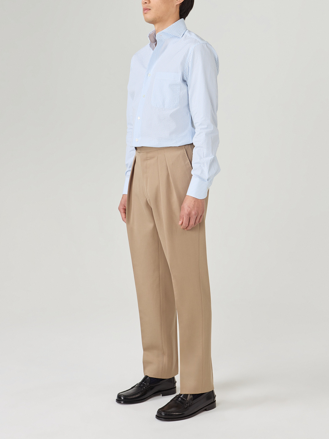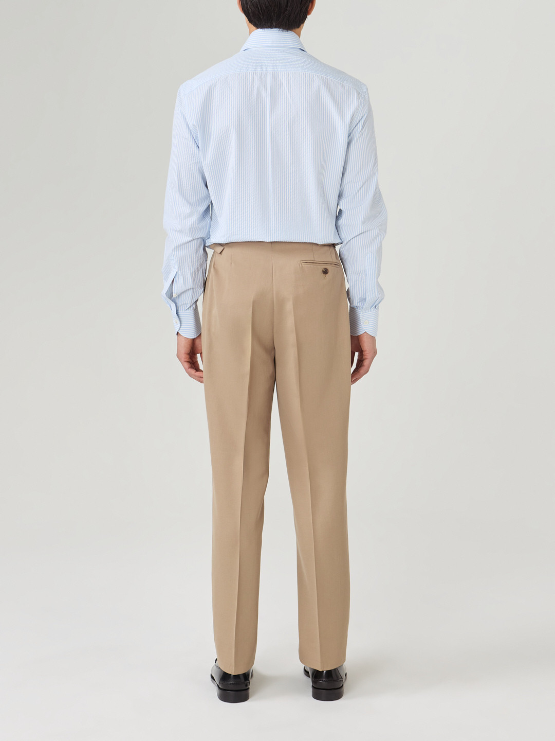 Blue striped seersucker, Thomas Mason. Seersucker has little wrinkling, it is a comfortable fabric and very pleasant to wear even when temperatures are high. It can be worn under a cotton or cold wool suit or very casually.
