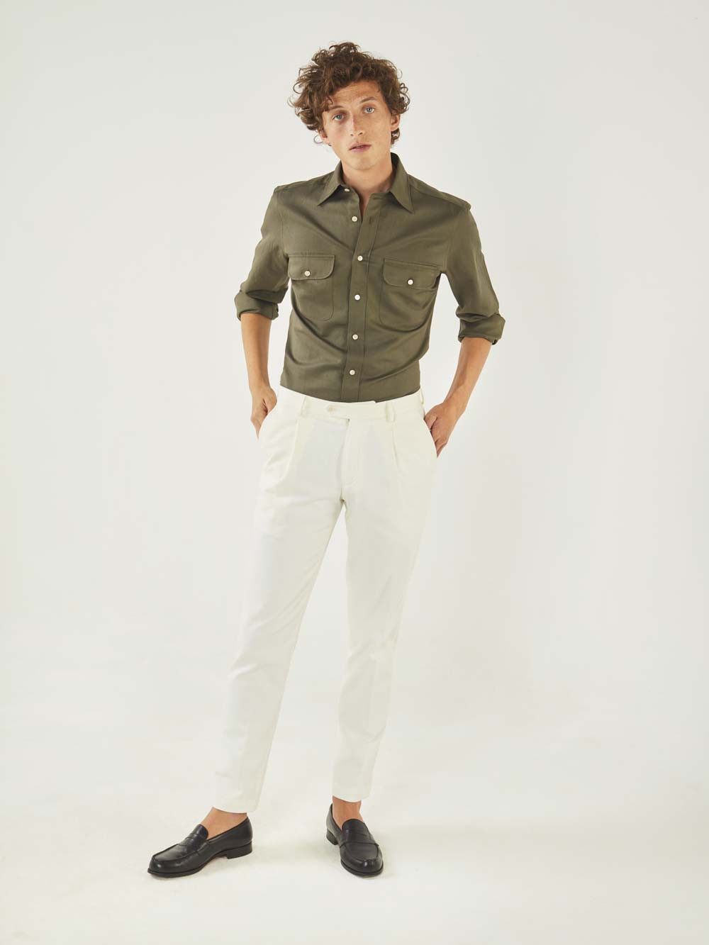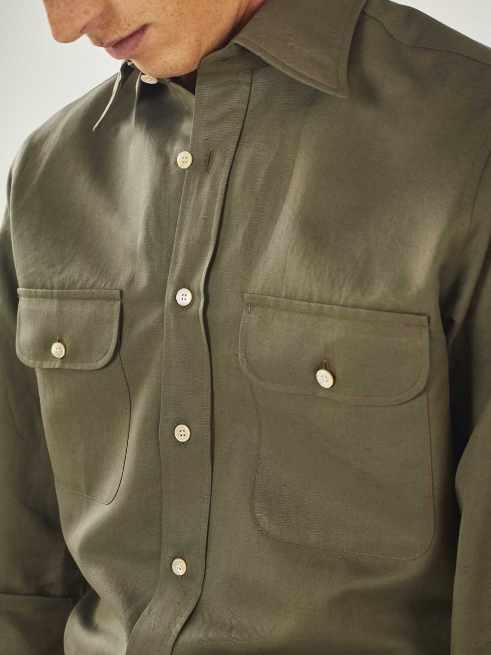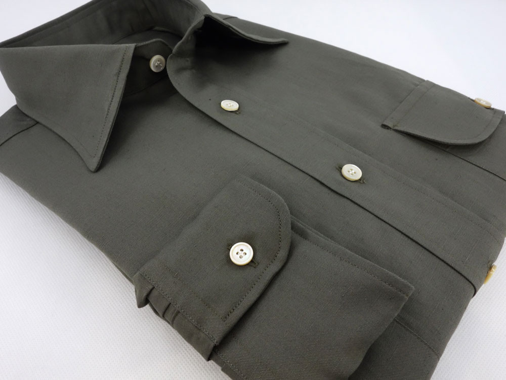 Thick Thomas Mason gabardine, cotton and dark green linen mix. It is an ideal fabric for summer shirts with a soft collar, or a safari jacket with double flap pockets. The irregular aspect of the linen yarn reinforces the sporty side of the fabric.