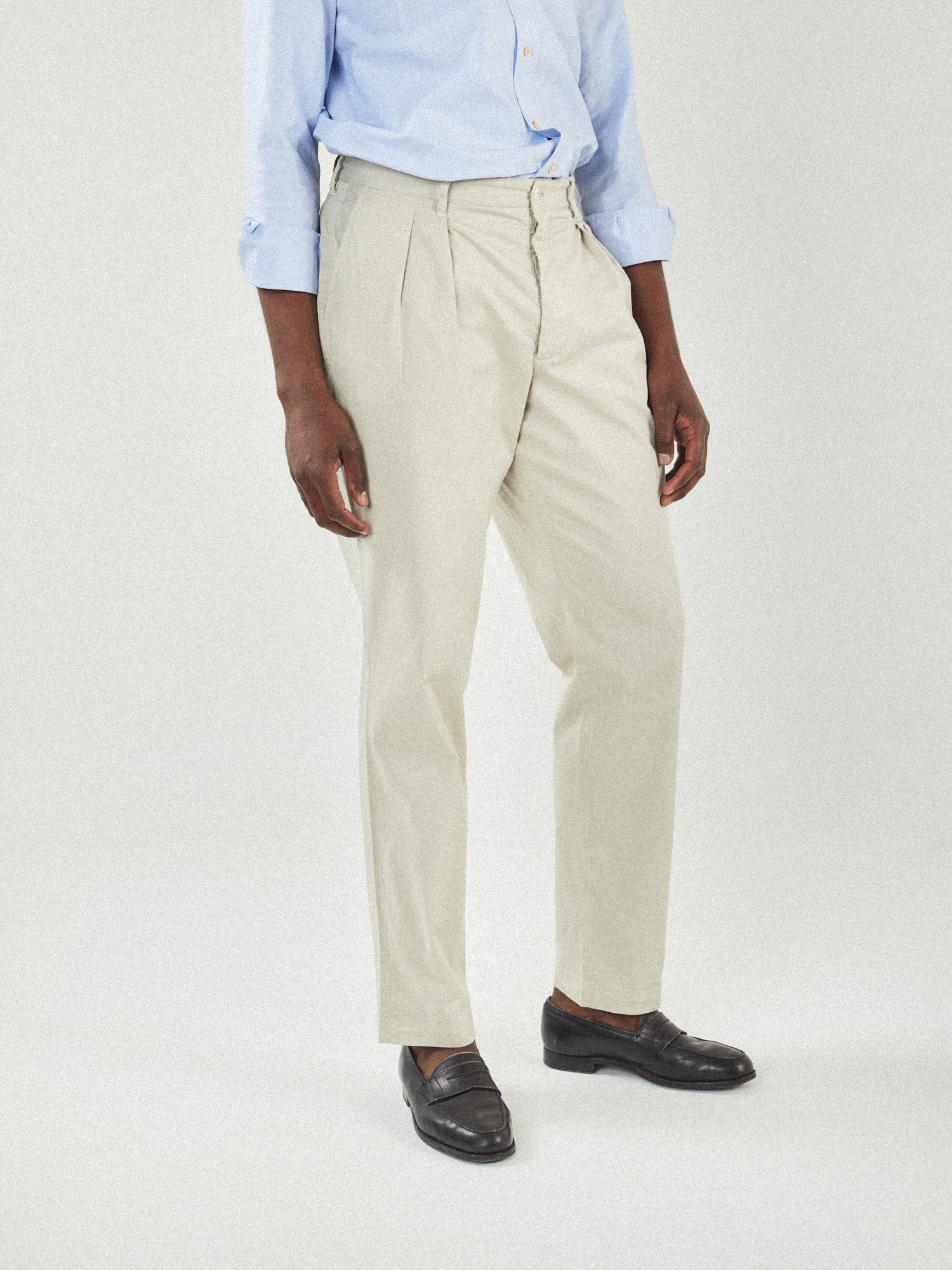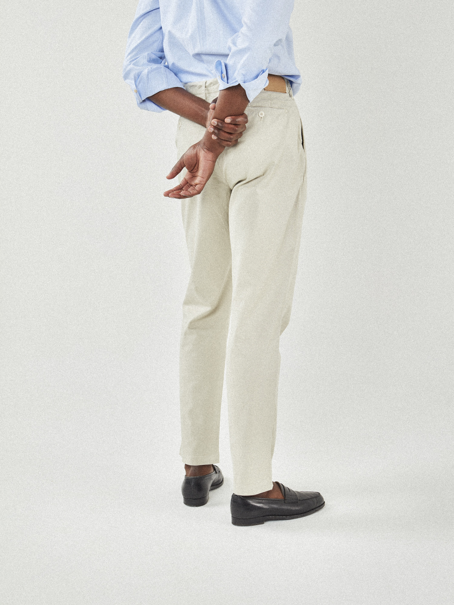 Summer canvas chino with two inside darts and classic straight waistband. Very sporty pants inspired by British army chinos. To be worn in the city with a blazer and an oxford shirt, or on weekends with a polo shirt or a chambray shirt.