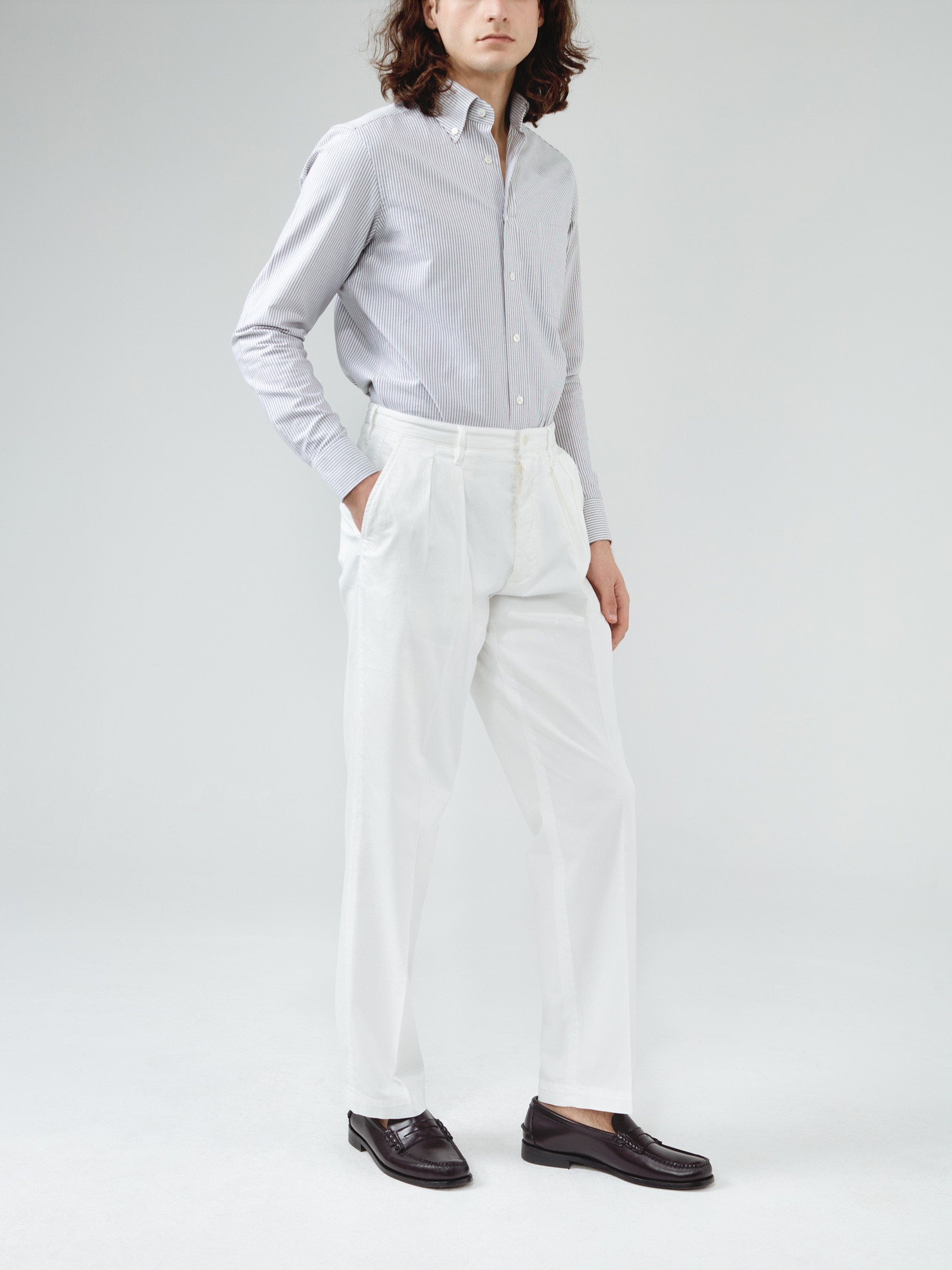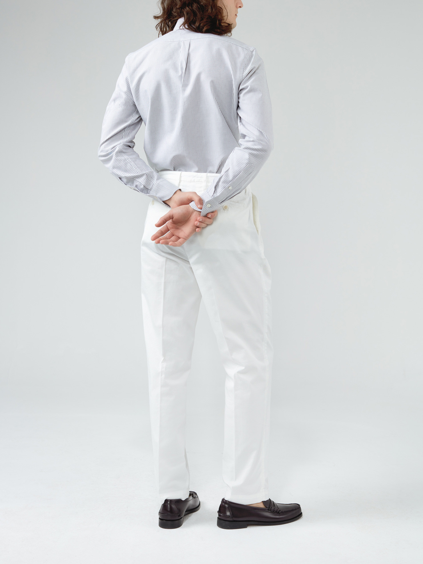 Classic chino, summer canvas, double inside pleats, slanted side pockets, welt and button back pocket, corozo buttons, plain hem.