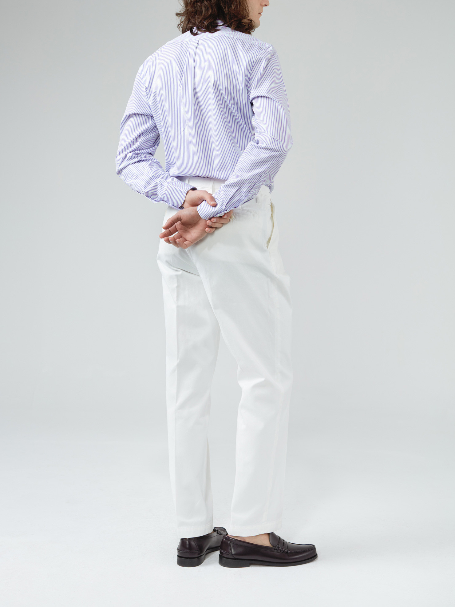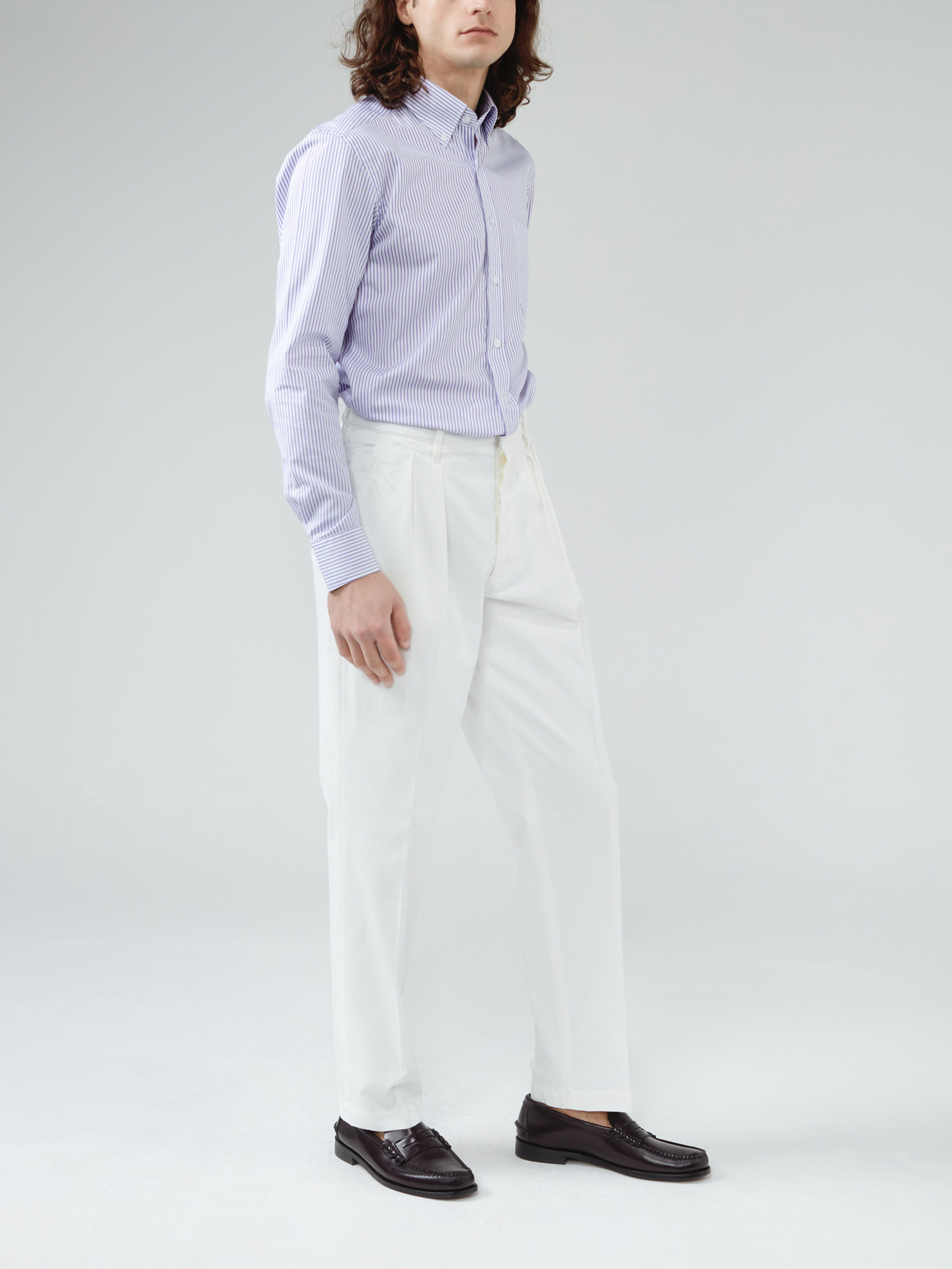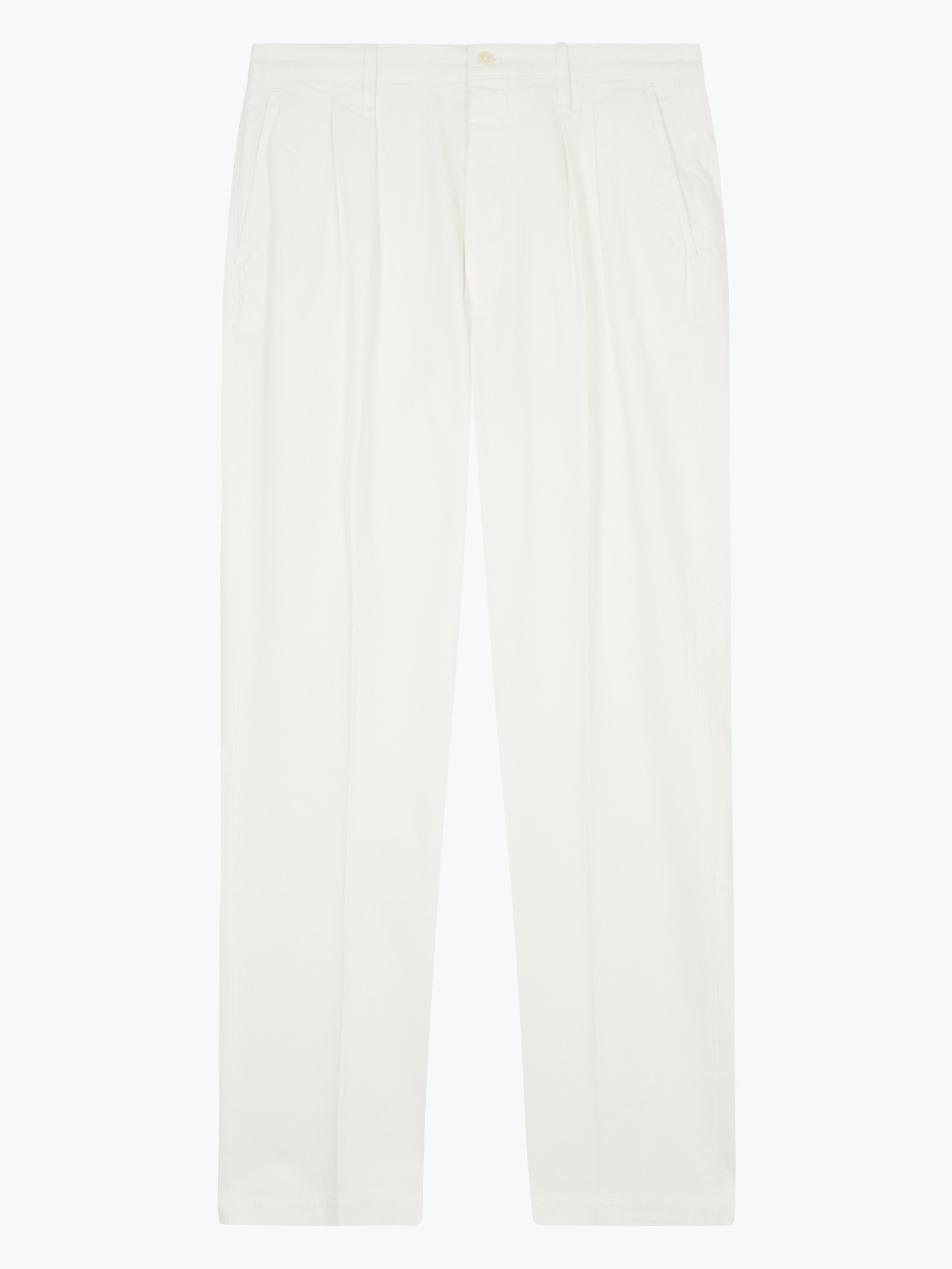 Classic chino, broken twill, double inside pleats, slanted side pockets, back welt and buttoned pocket, corozo buttons, plain hem.