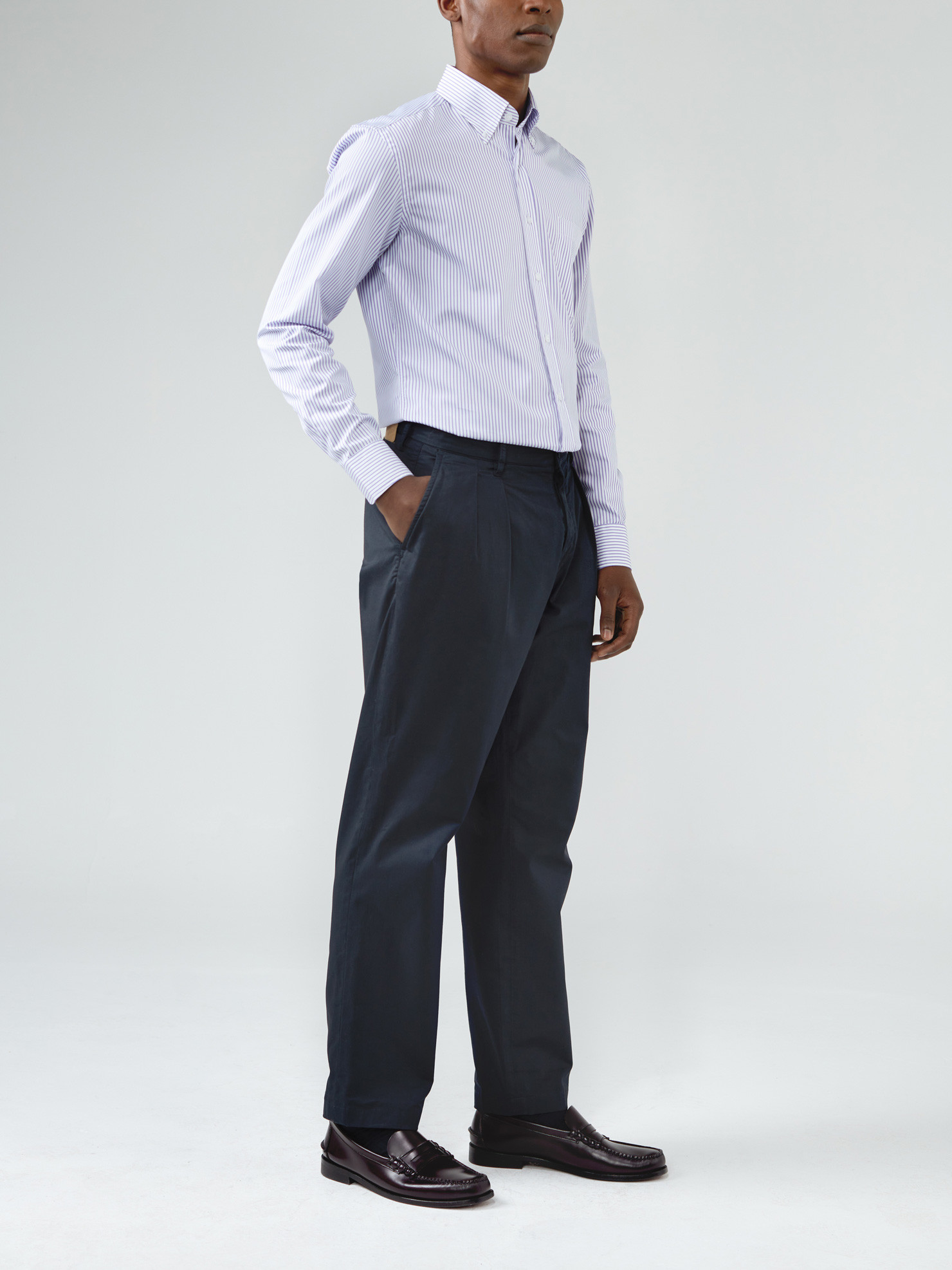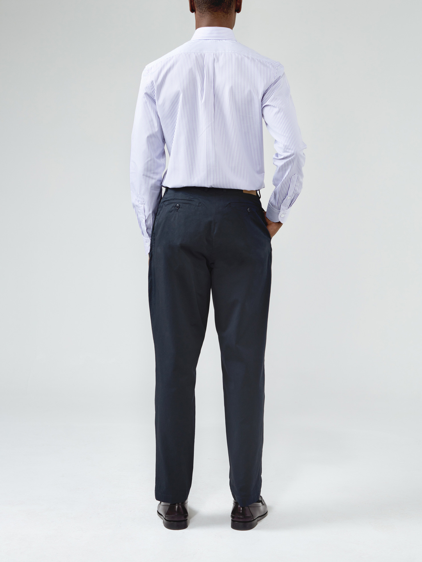 Classic chino, summer canvas, double inside pleats, slanted side pockets, welt and button back pocket, corozo buttons, plain hem.