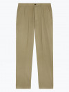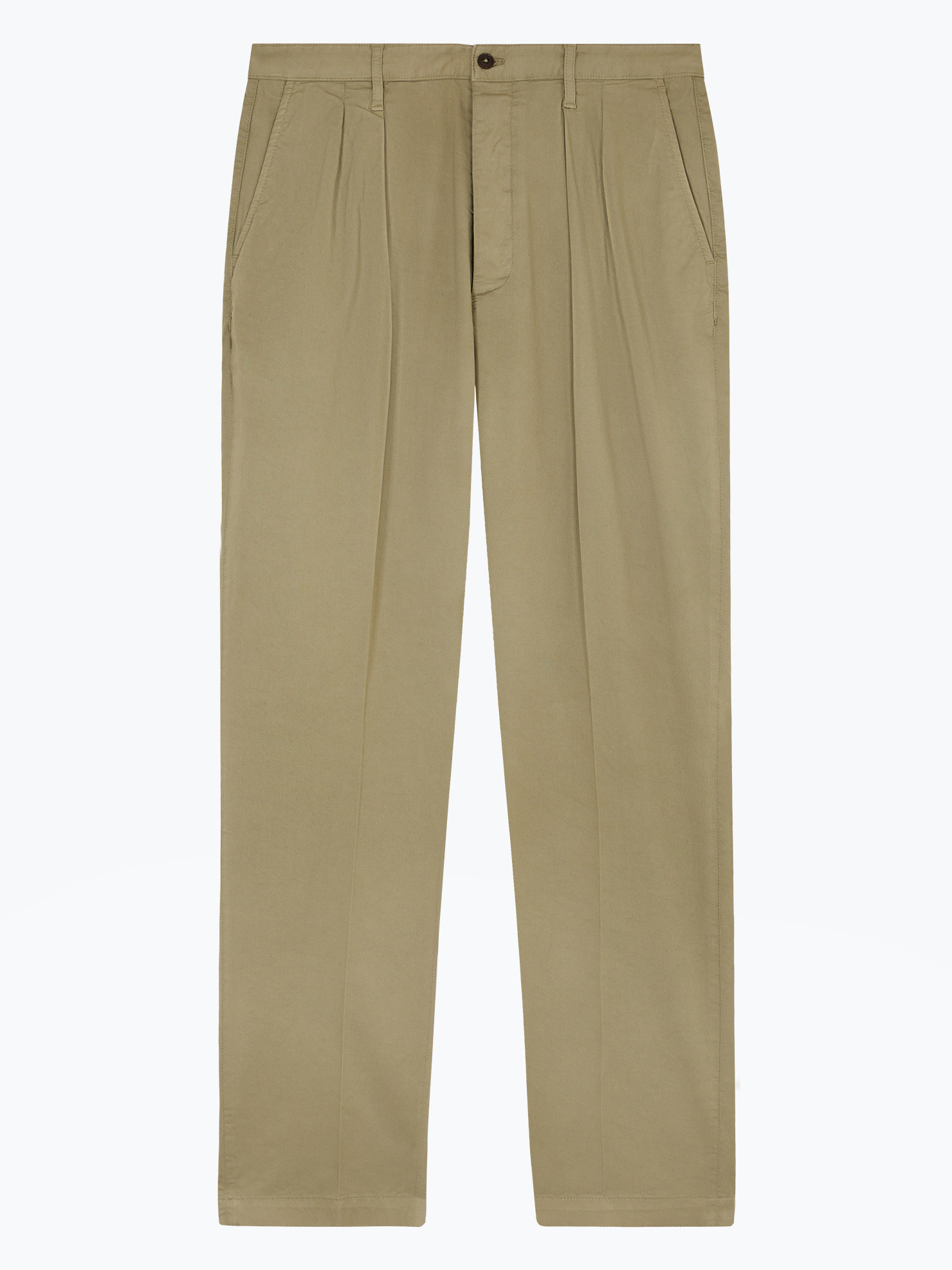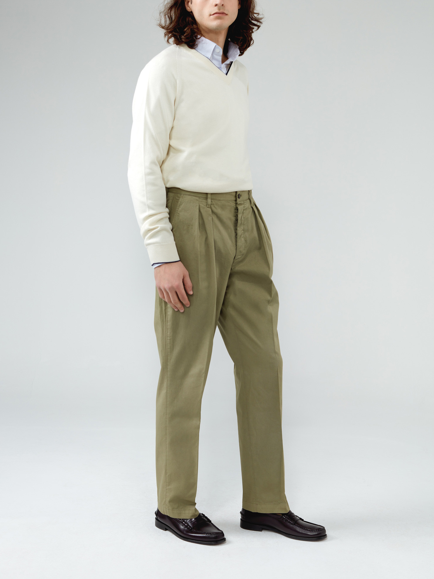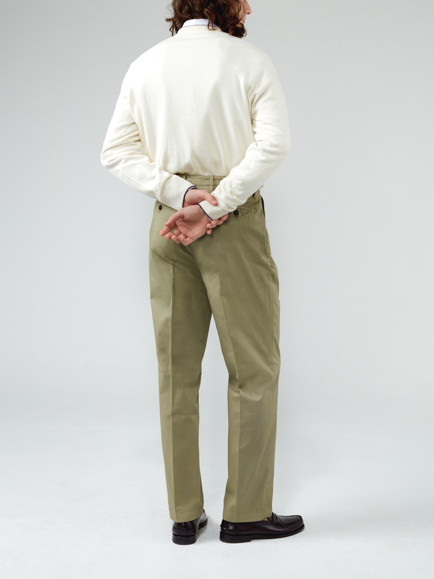 Classic chino, summer canvas, double inside pleats, slanted side pockets, welt and button back pocket, corozo buttons, plain hem.