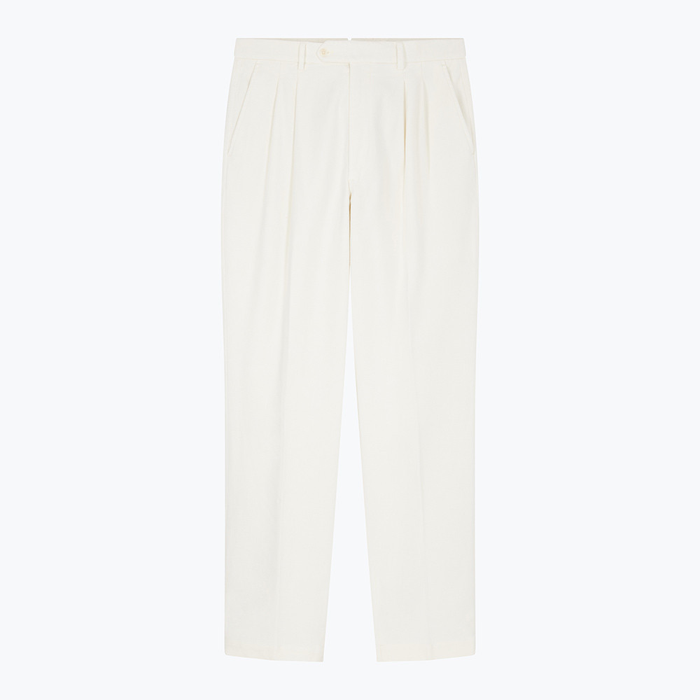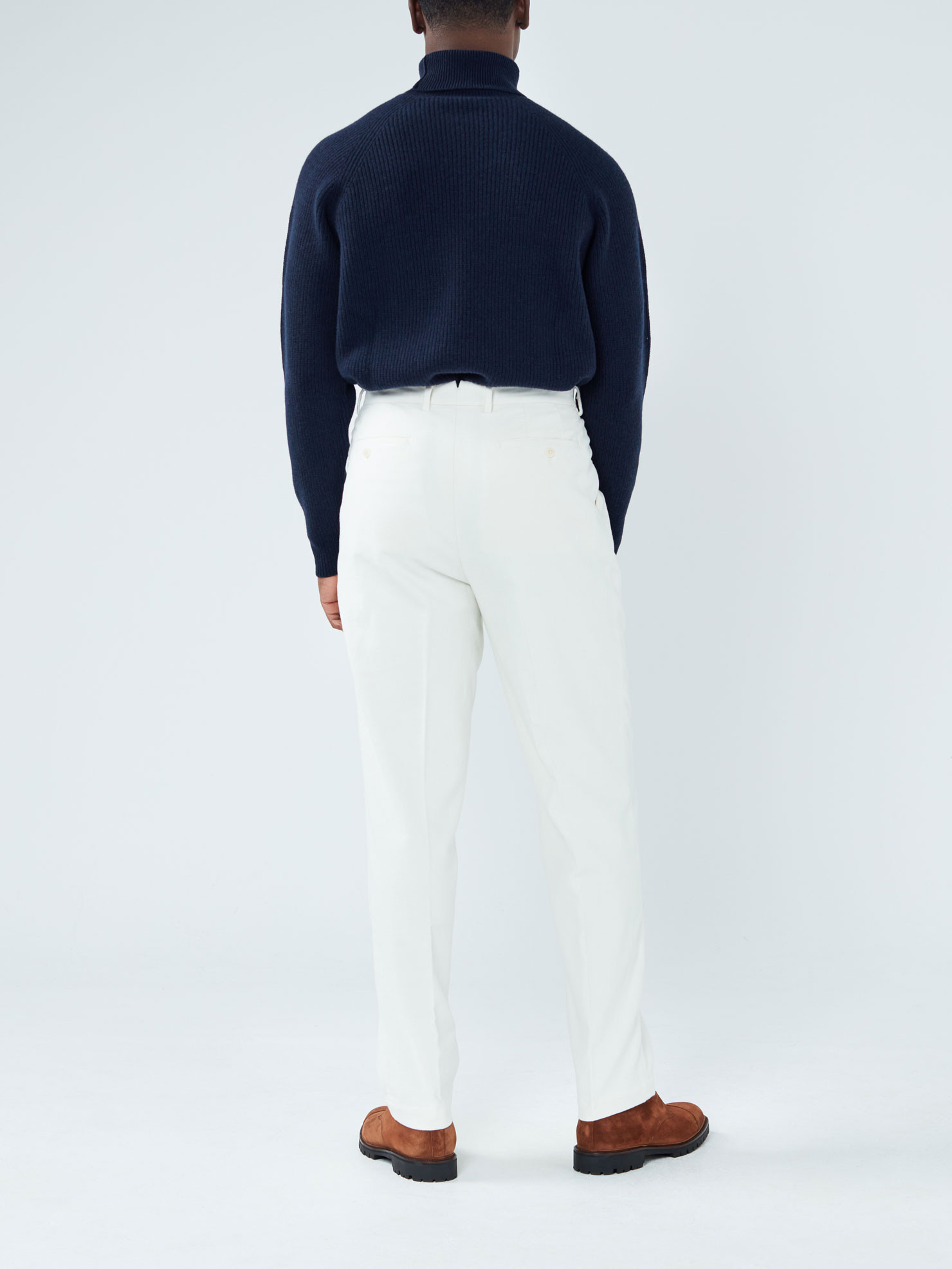 Moleskin chino with pleats, more formal and dressy than the classic chino it brings a retro touch to a silhouette that can be qualified as sporty chic. Ideal to replace a pair of classic pants at the office with a blazer or a sport jacket, it is also particularly appreciated on weekends and during more country events (golf, polo or casual wedding). The moleskin will be very pleasant to wear during the cooler seasons.