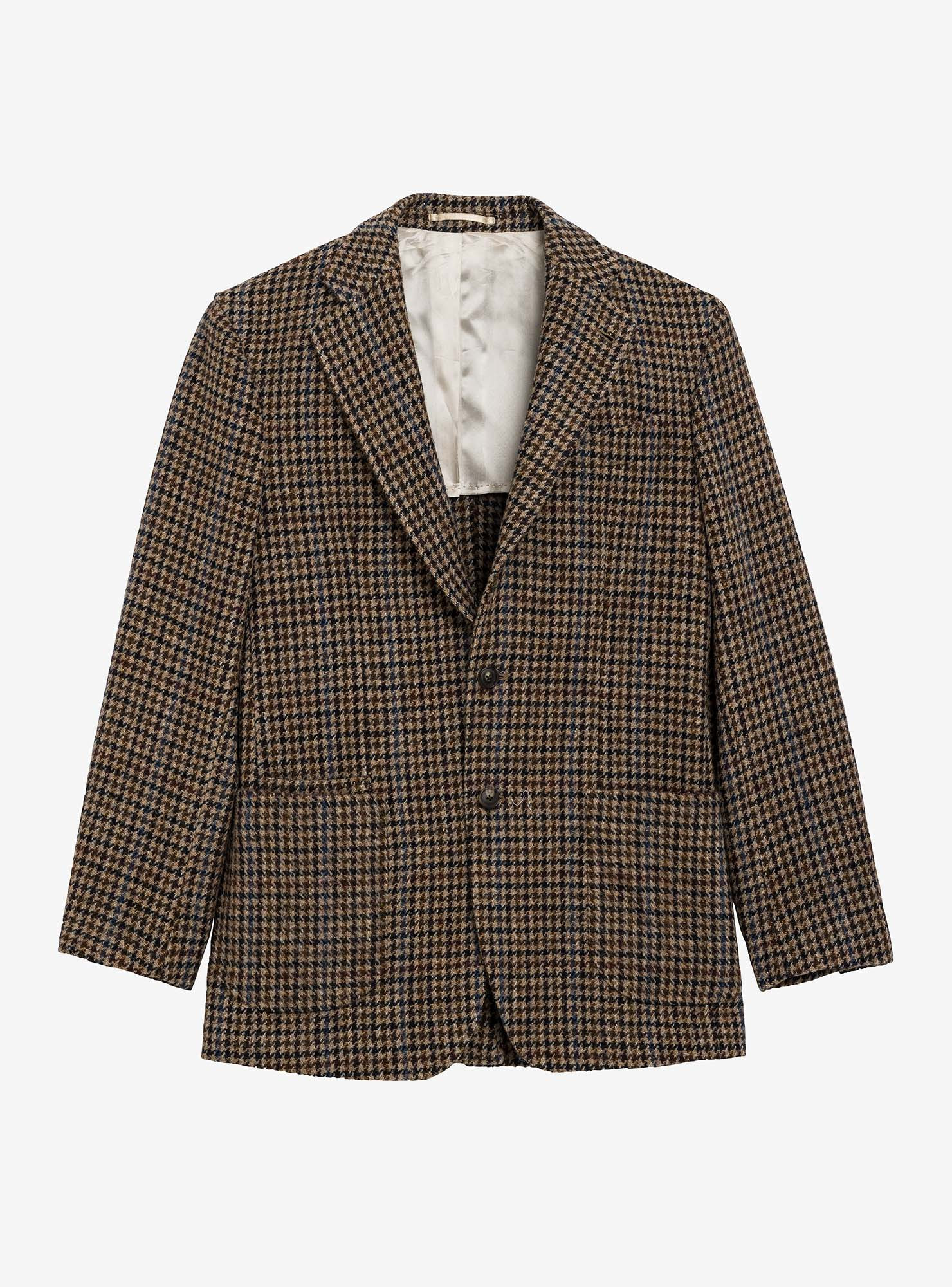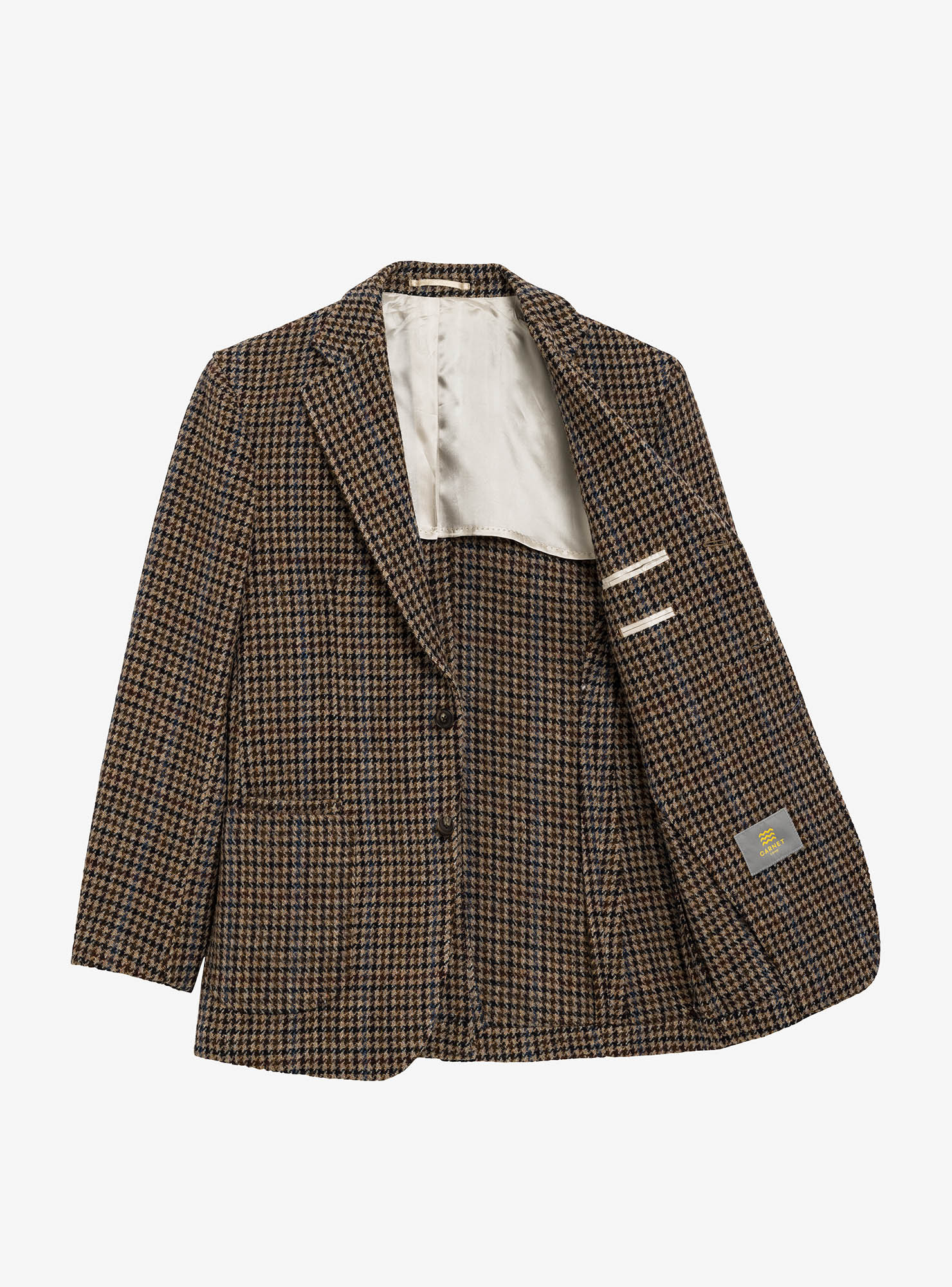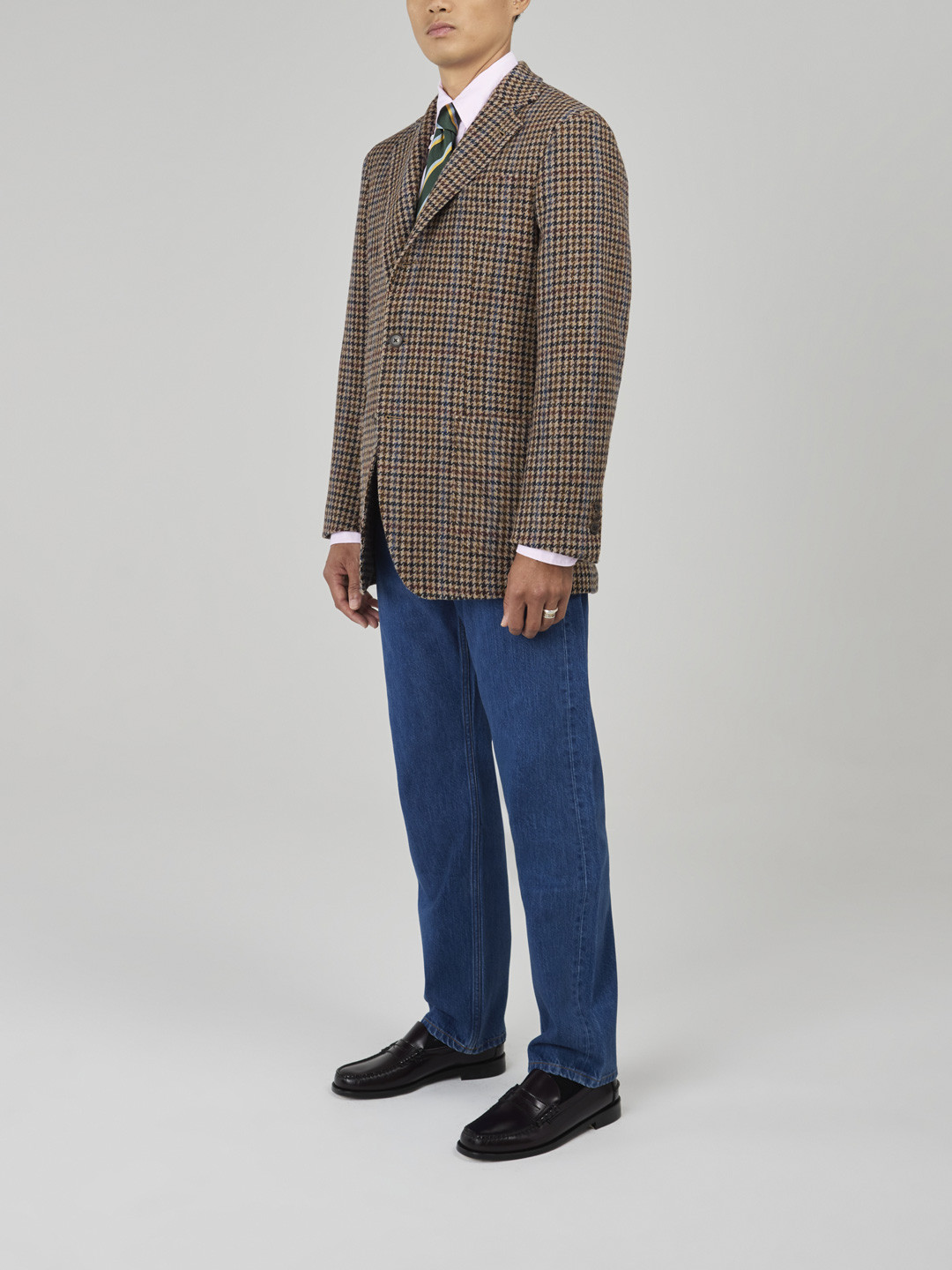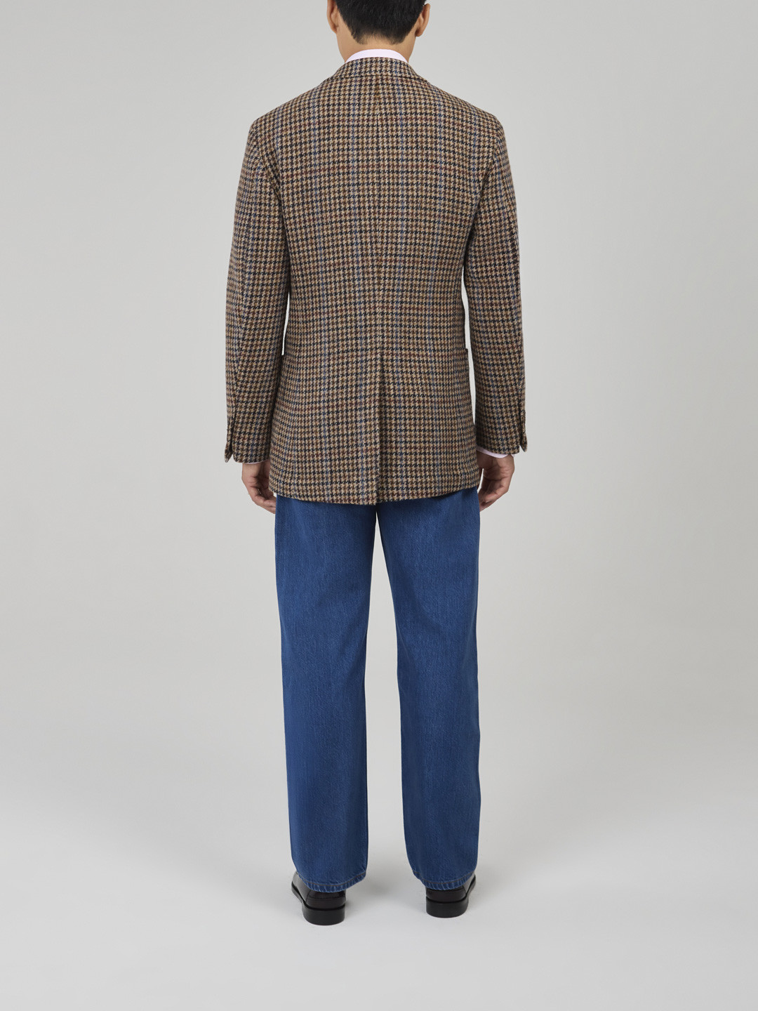 Single-Breasted 2.5-Button Beige Jacket in Gun Club Pattern Harris Tweed. Unstructured, unpadded shoulders, patch side pockets, single rear vent, fully lined interior.