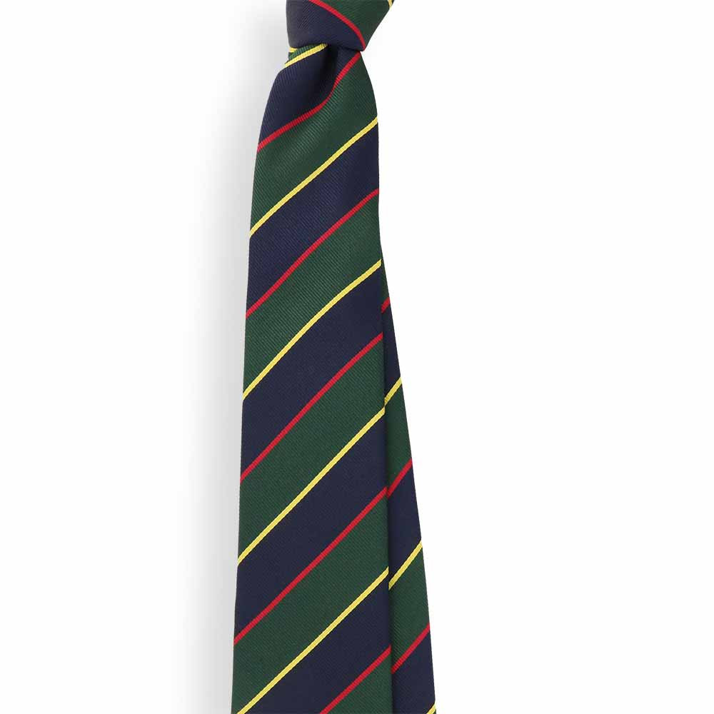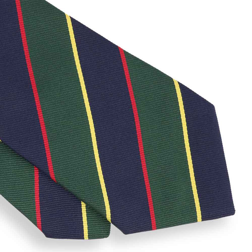 Green and blue club tie with yellow and red lineret. Very elegant, inspired by the "regimental" ties of the English army corps. It is manufactured in Paris by a century-old manufacturer.
