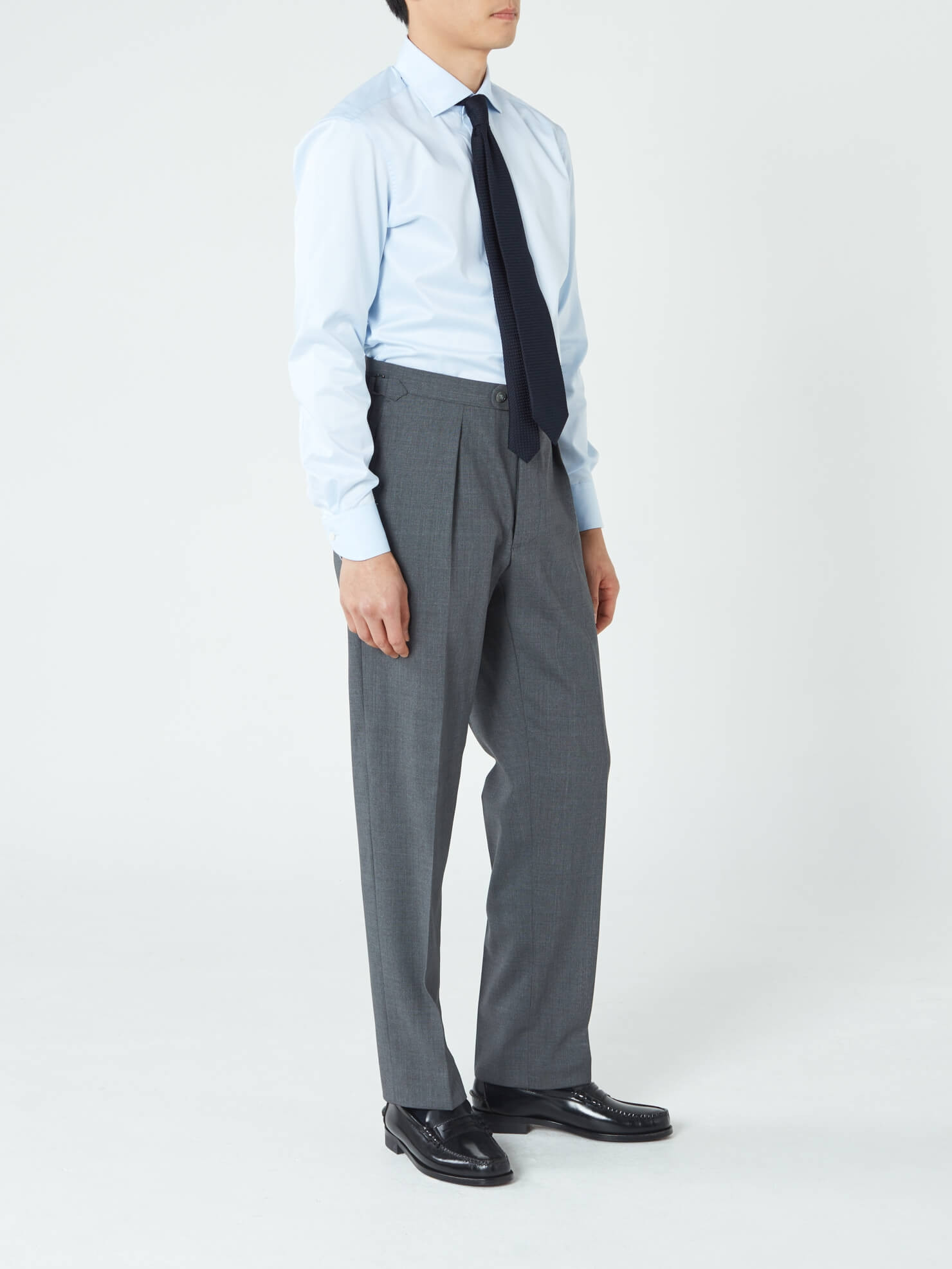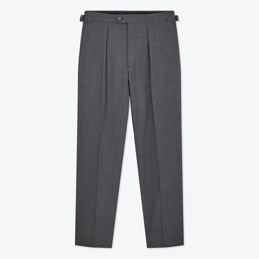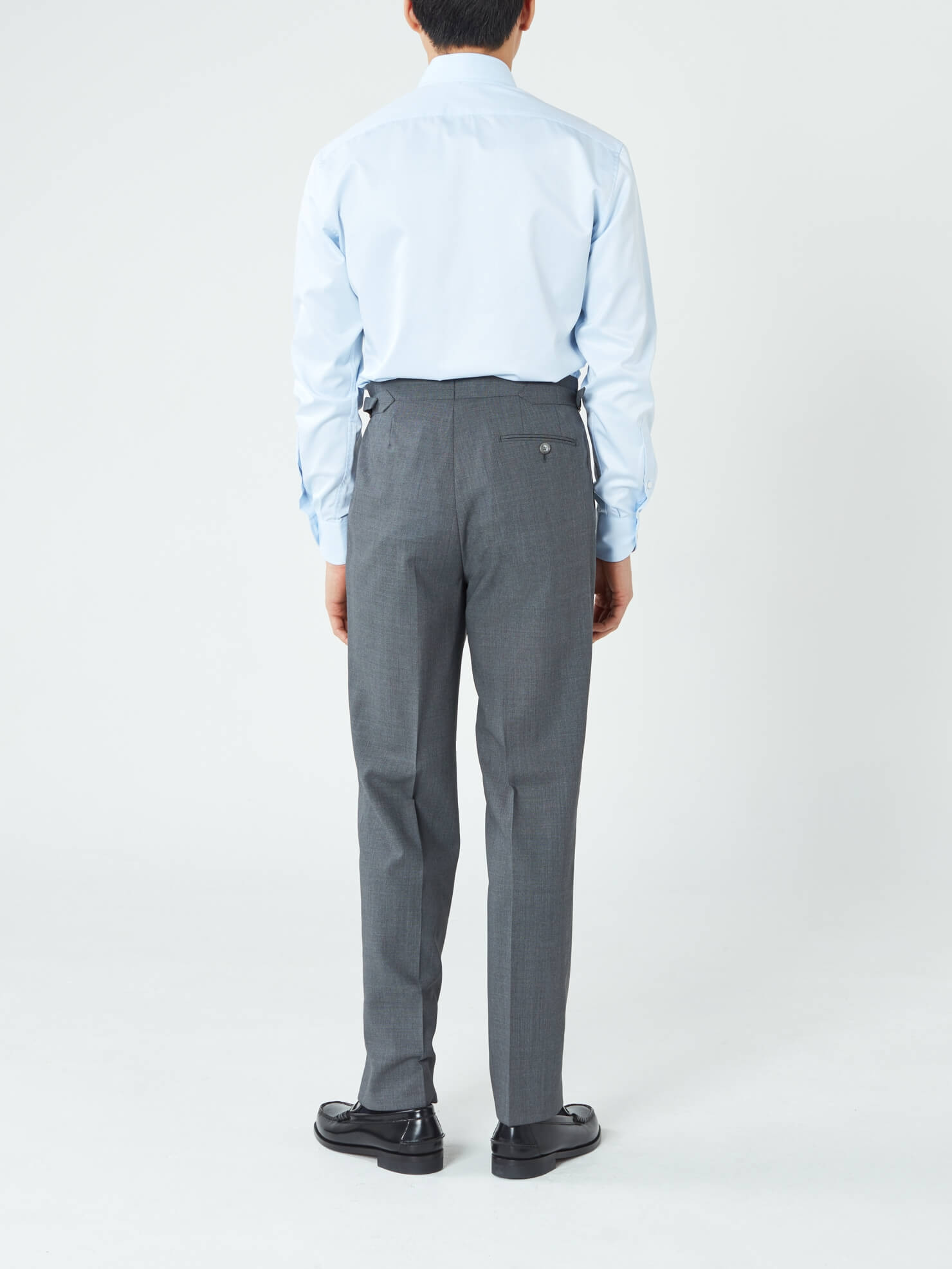 Classic pants with one inside placket, tabs, slanted side pockets, one welt pocket with button on the back, simple bottom without lapel