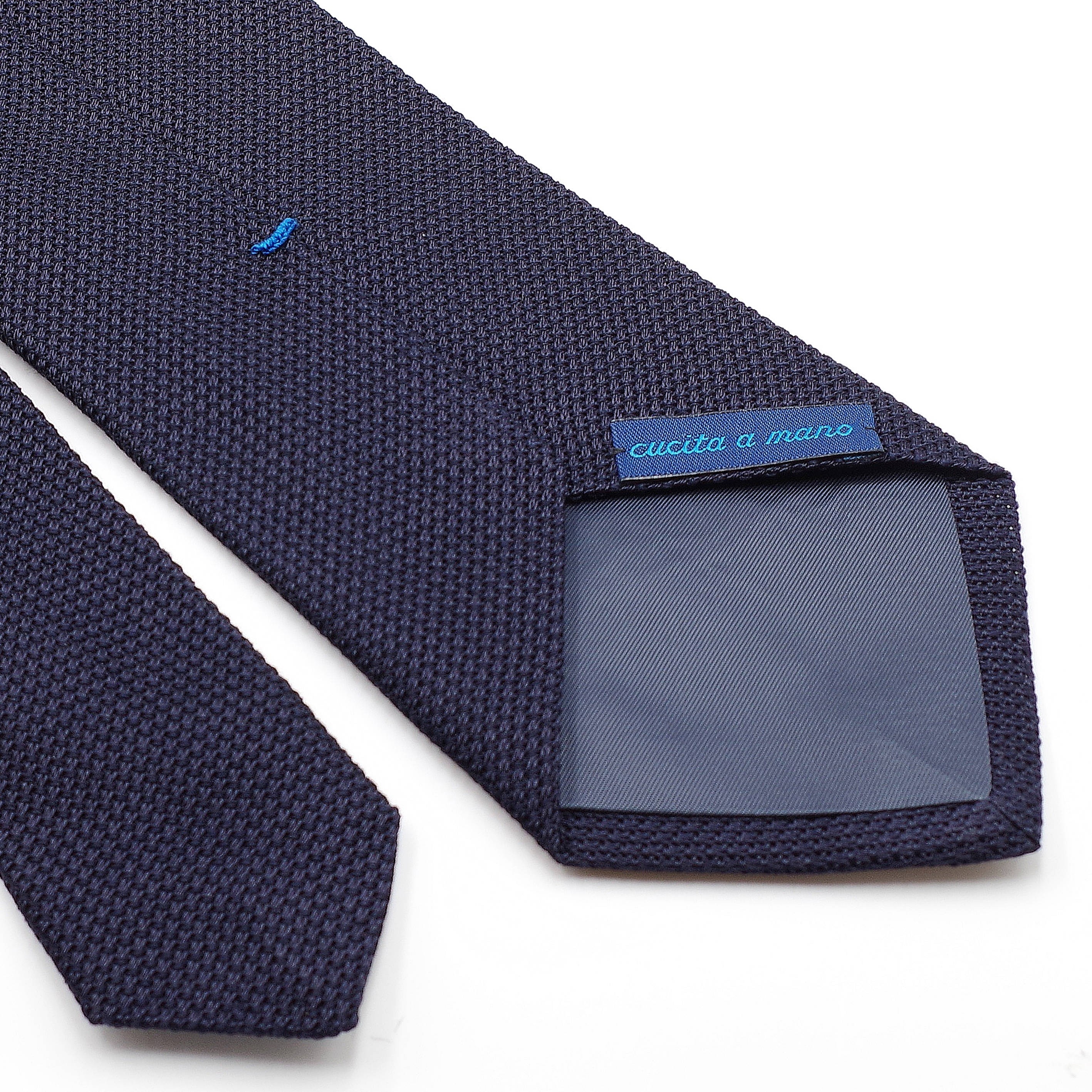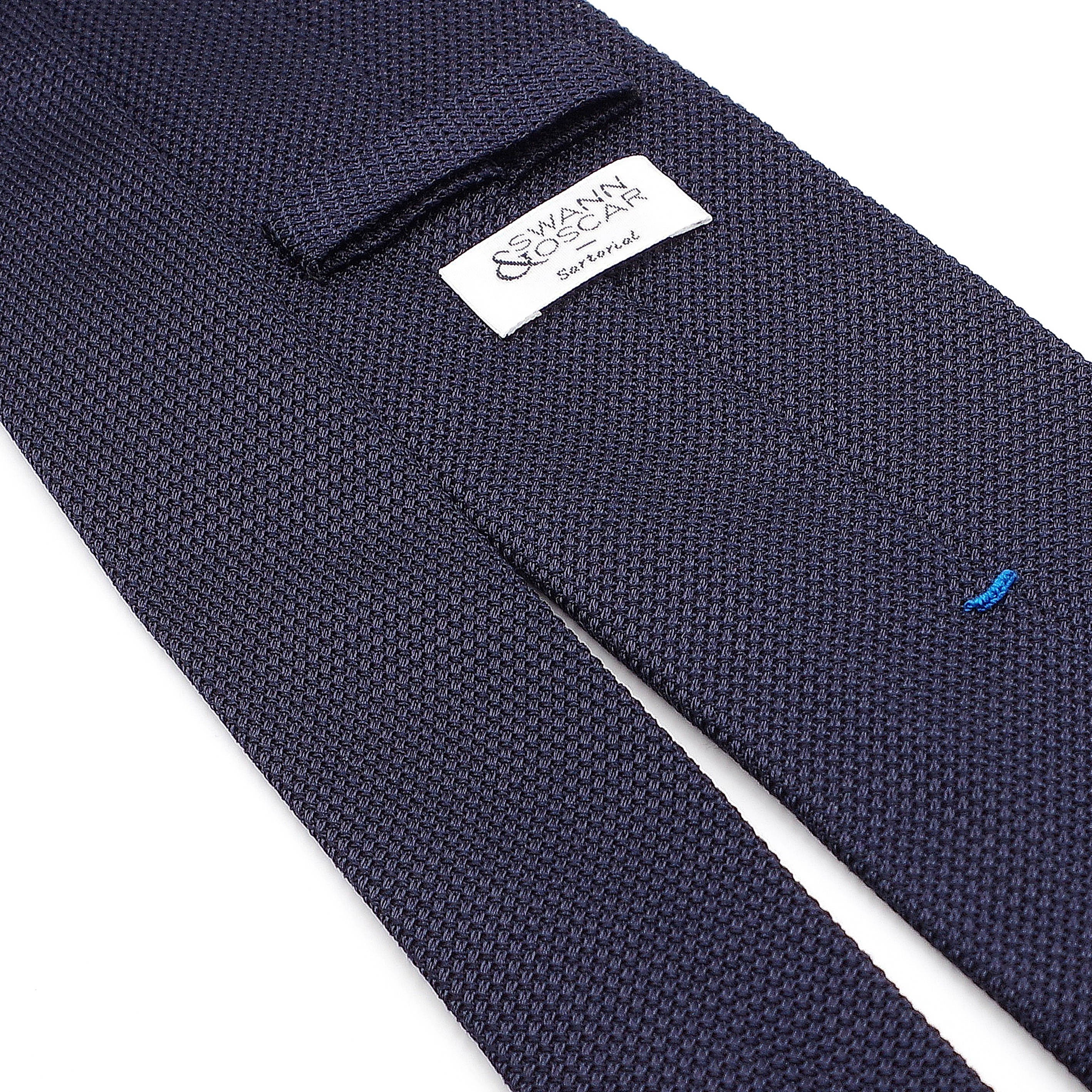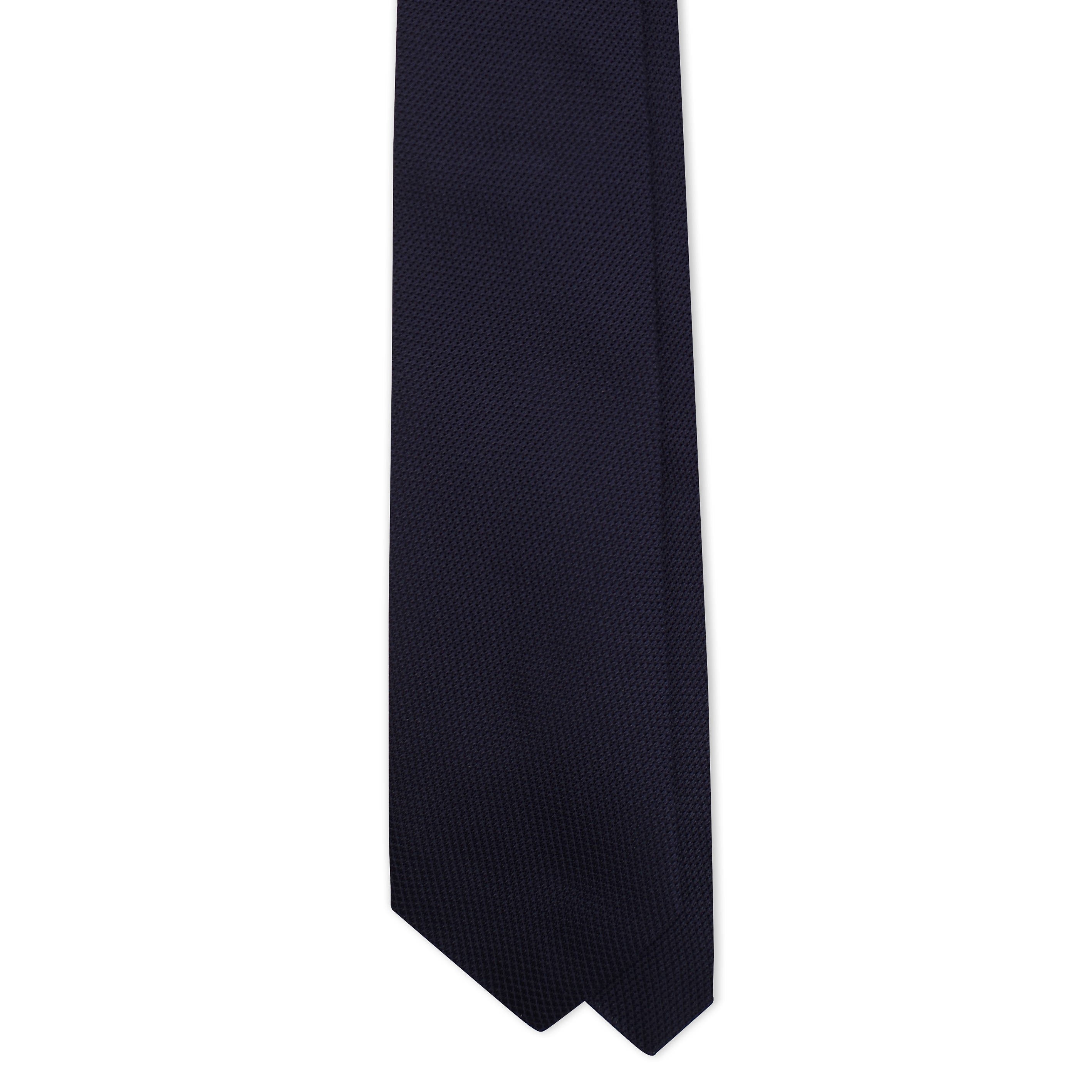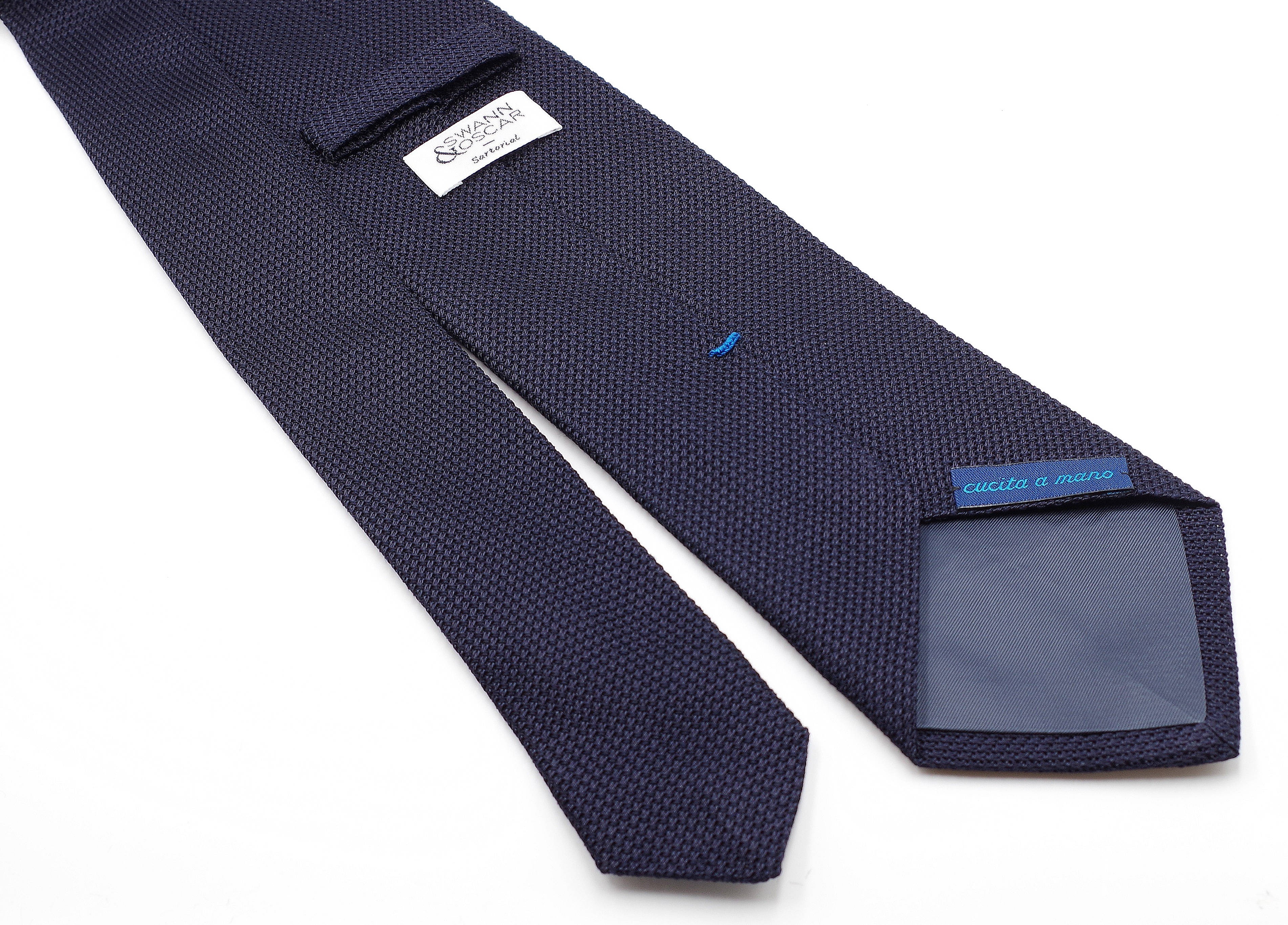 This dark blue grenadine tie is made from a fabric known as "Garza Fina," which is finer and looks almost black in certain lights. It is perfect for simple business outfits, such as a mid-grey suit and a white shirt. However, it can also be used very effectively to tone down a more daring suit, such as brown tweed, with a handkerchief that recalls its blue tones.