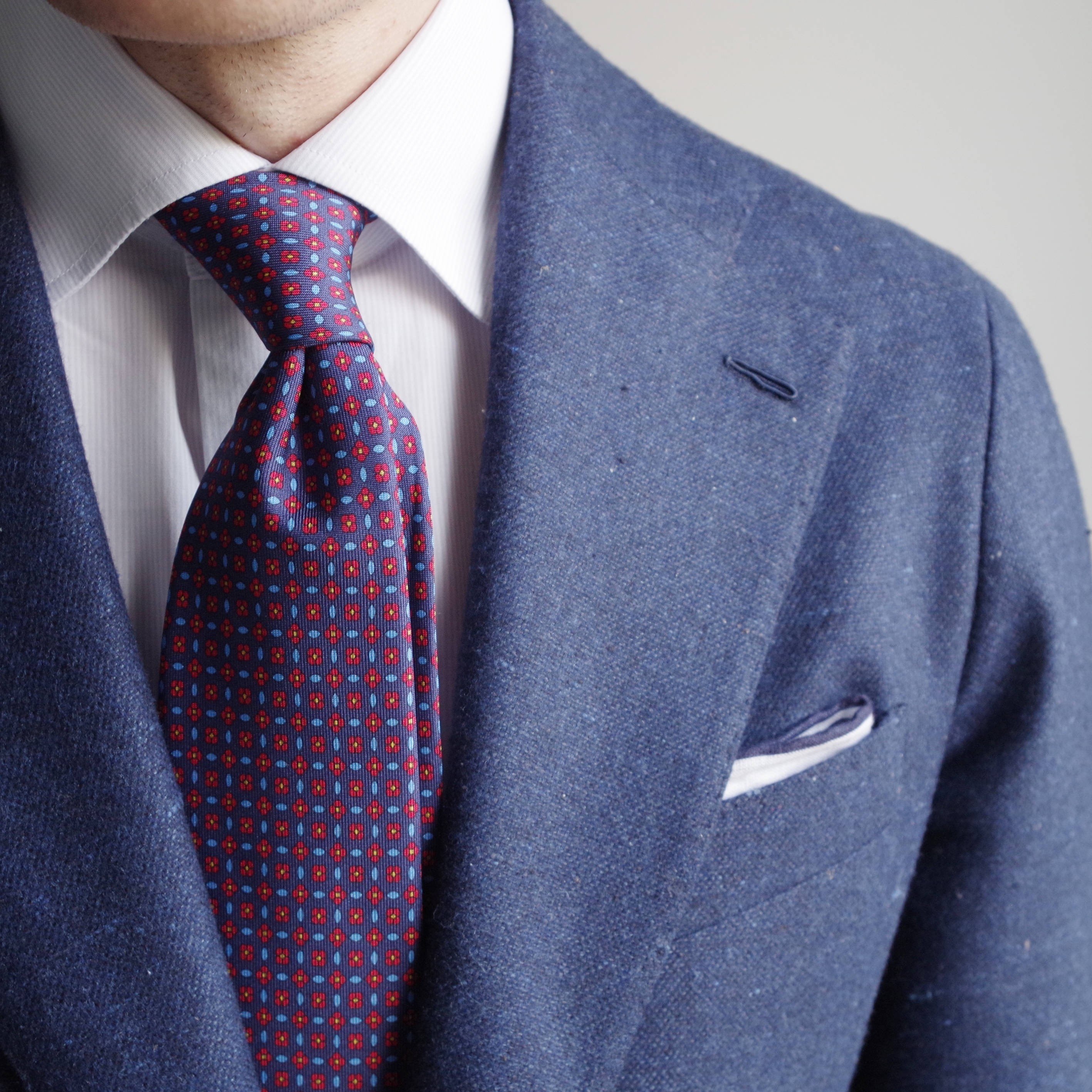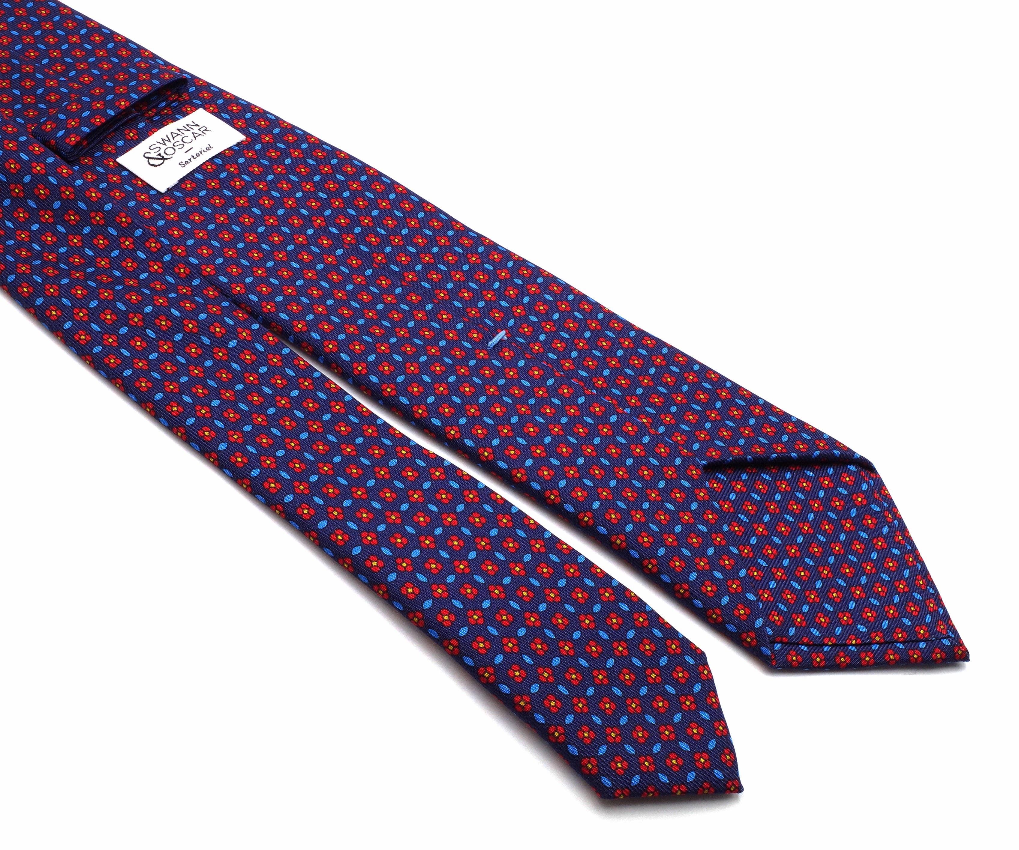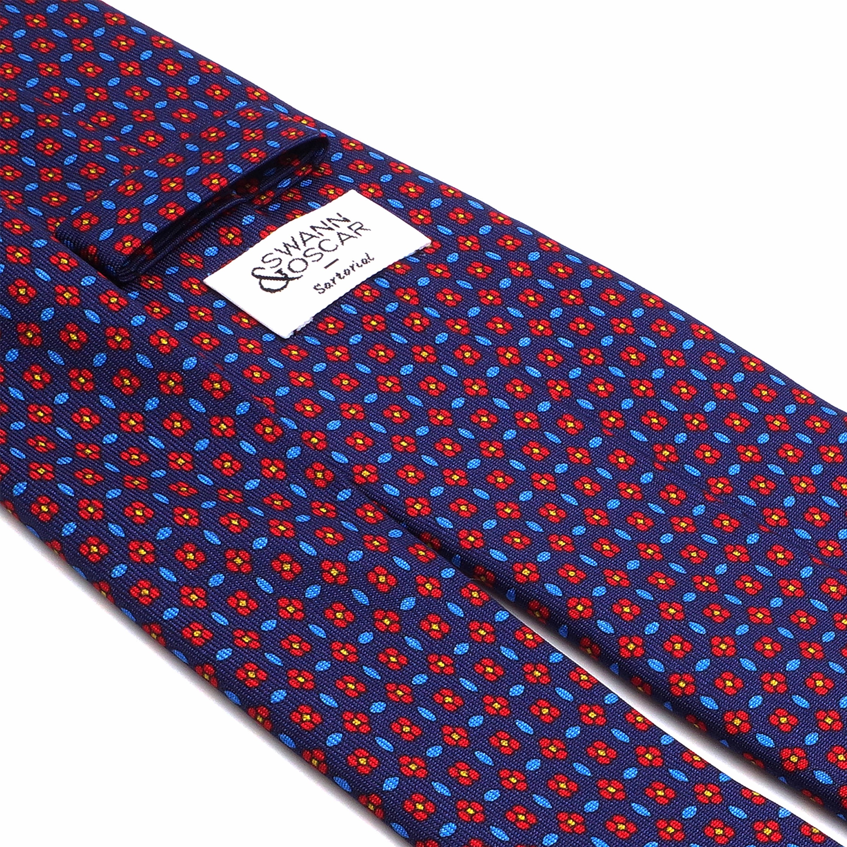 The navy-blue silk of this tie gives it a particularly luxurious character with a floral feel. This tie is ideal in combination with a white shirt to set it off, combined with a discreet and traditional handkerchief. You could also opt for a more daring, casual and Italian style.
