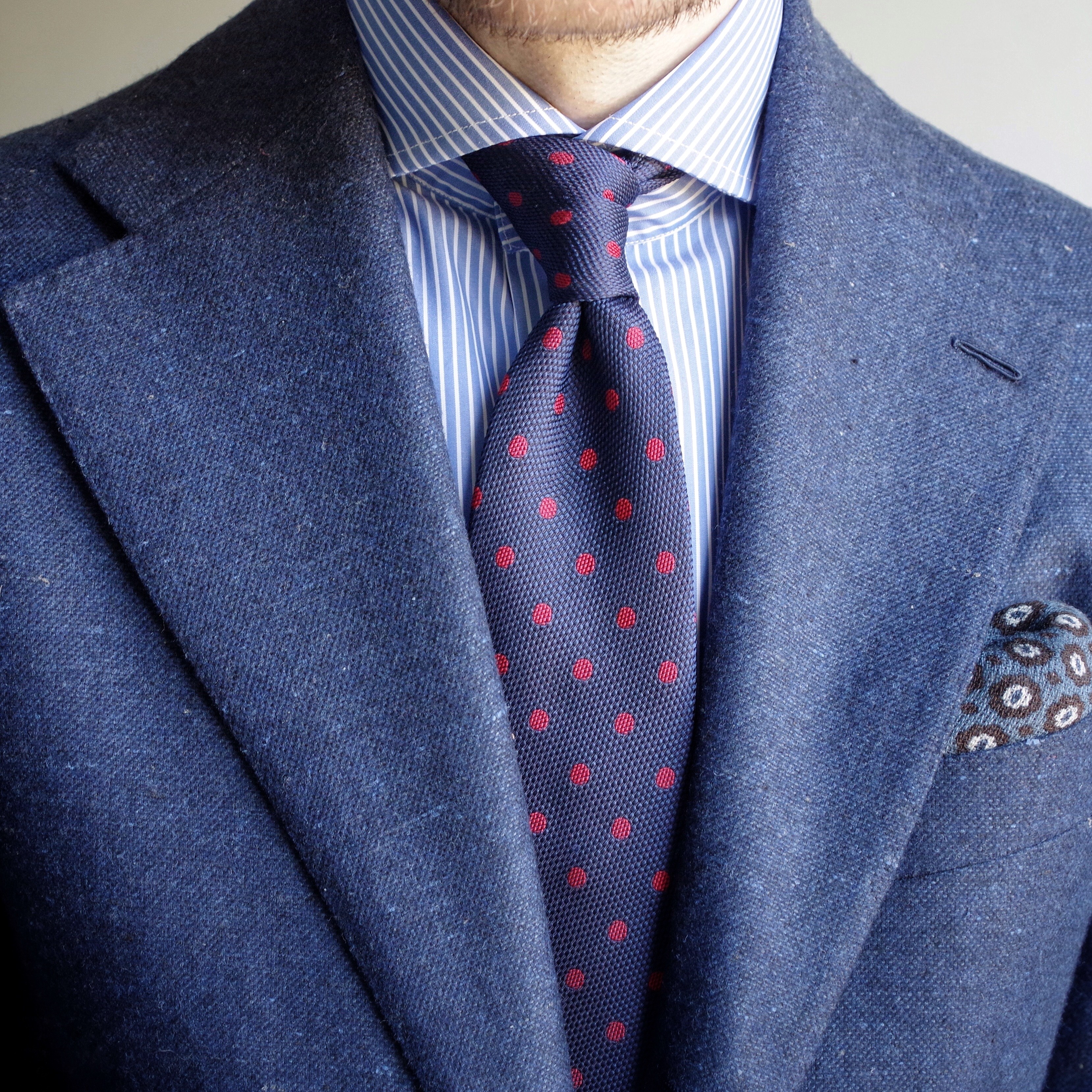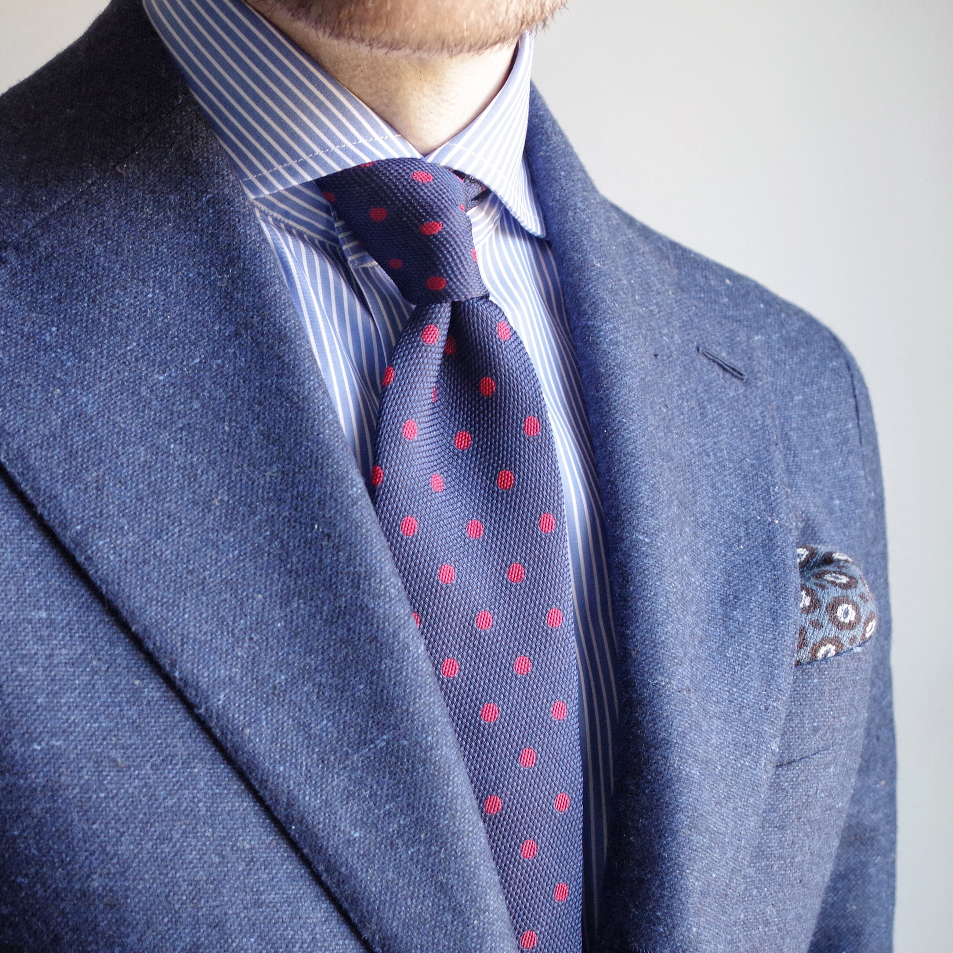 This model features a mixture of materials and designs. The navy blue colour gives it a particularly luxurious touch while retaining a floral pattern. It will go perfectly with a contrasting, pale blue shirt to bring out the colour, combined with a more restrained handkerchief, while you can also consider a more offbeat and daring style if you prefer.