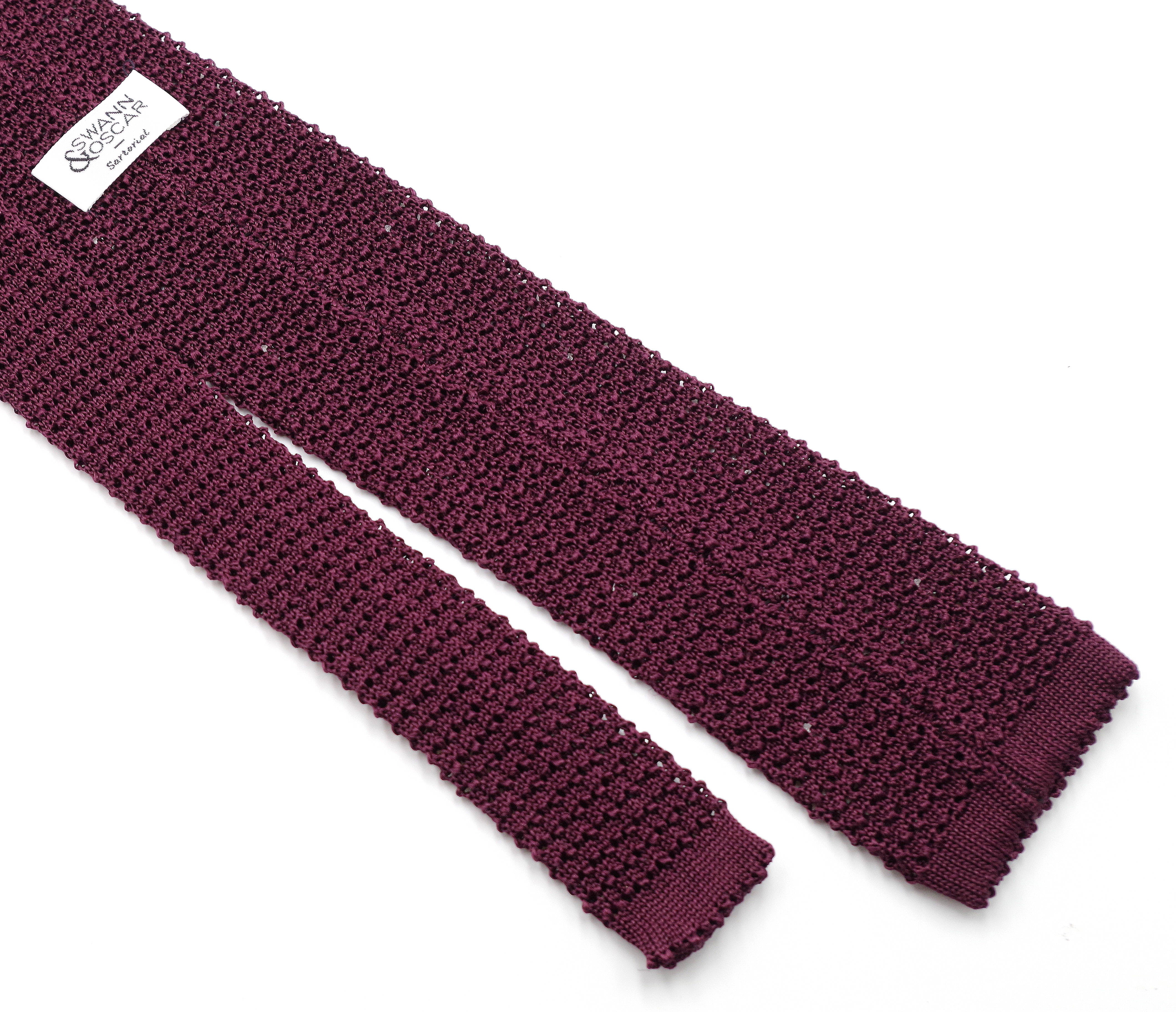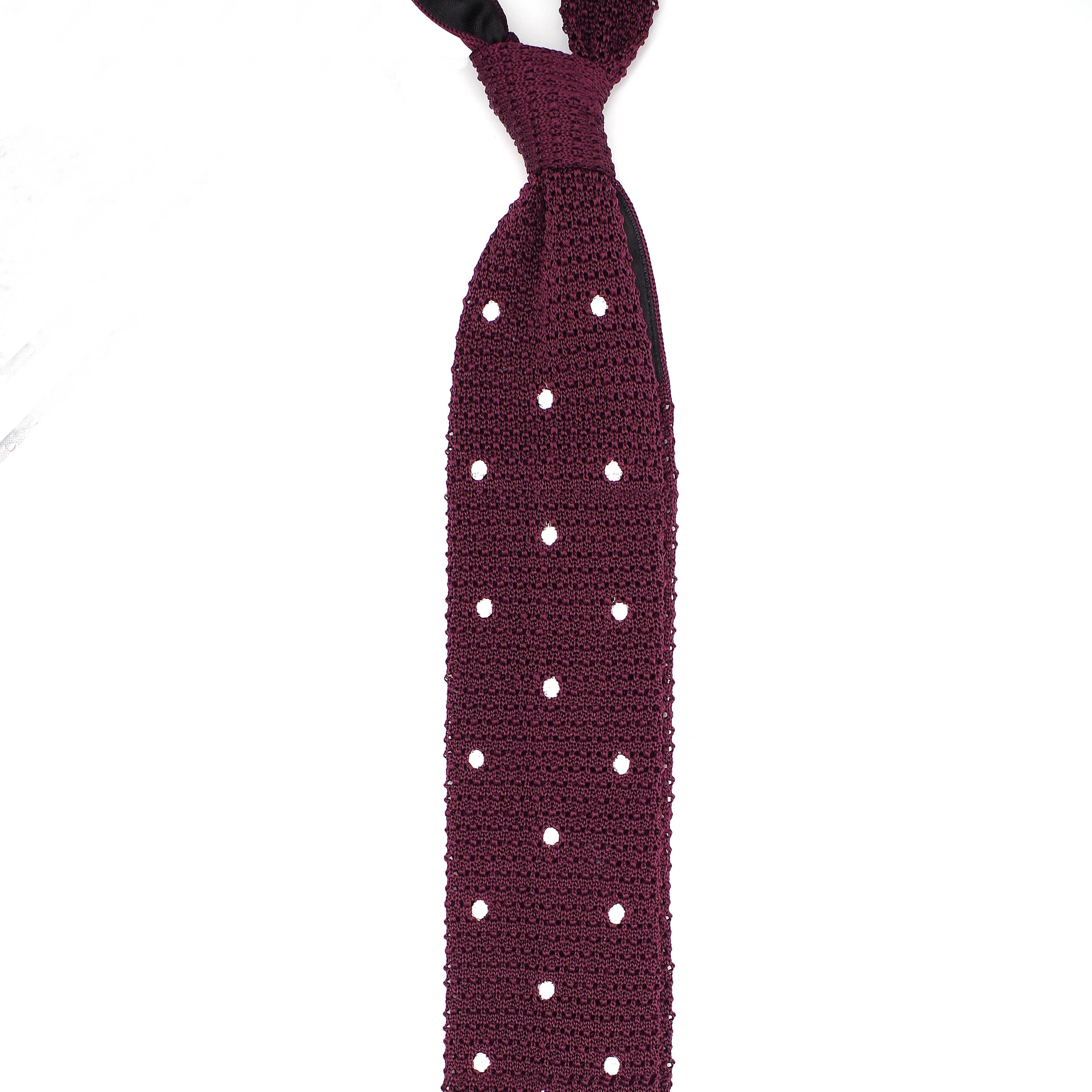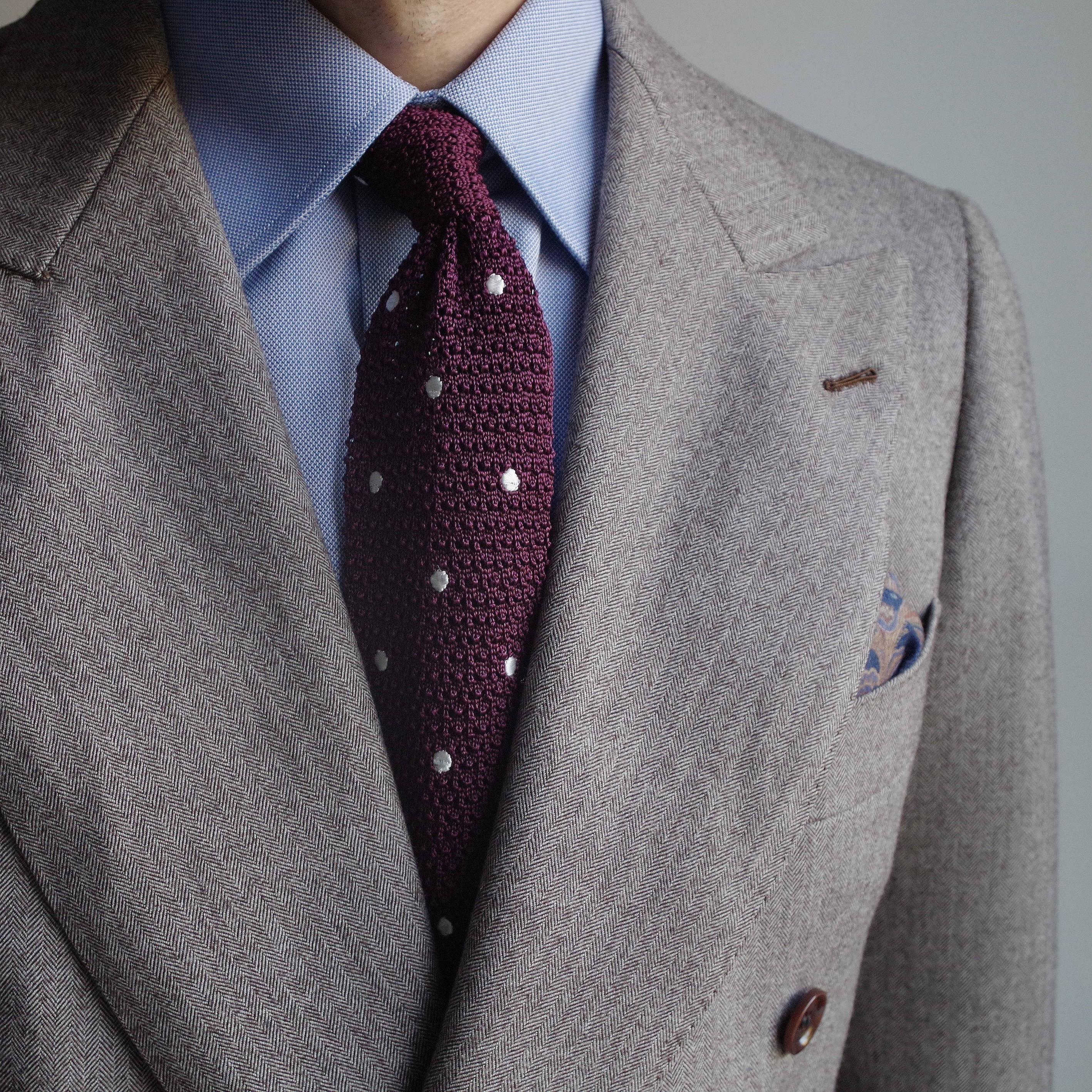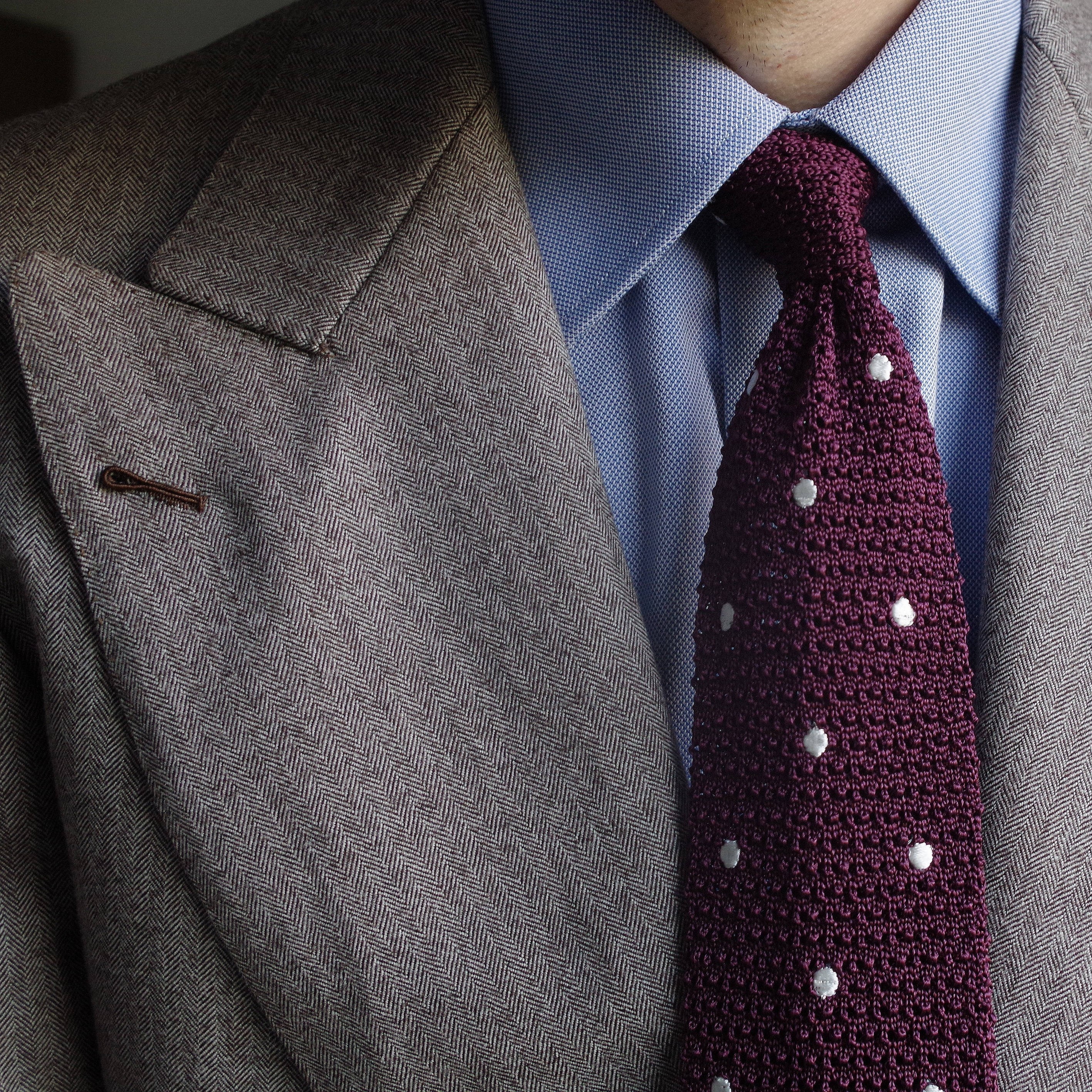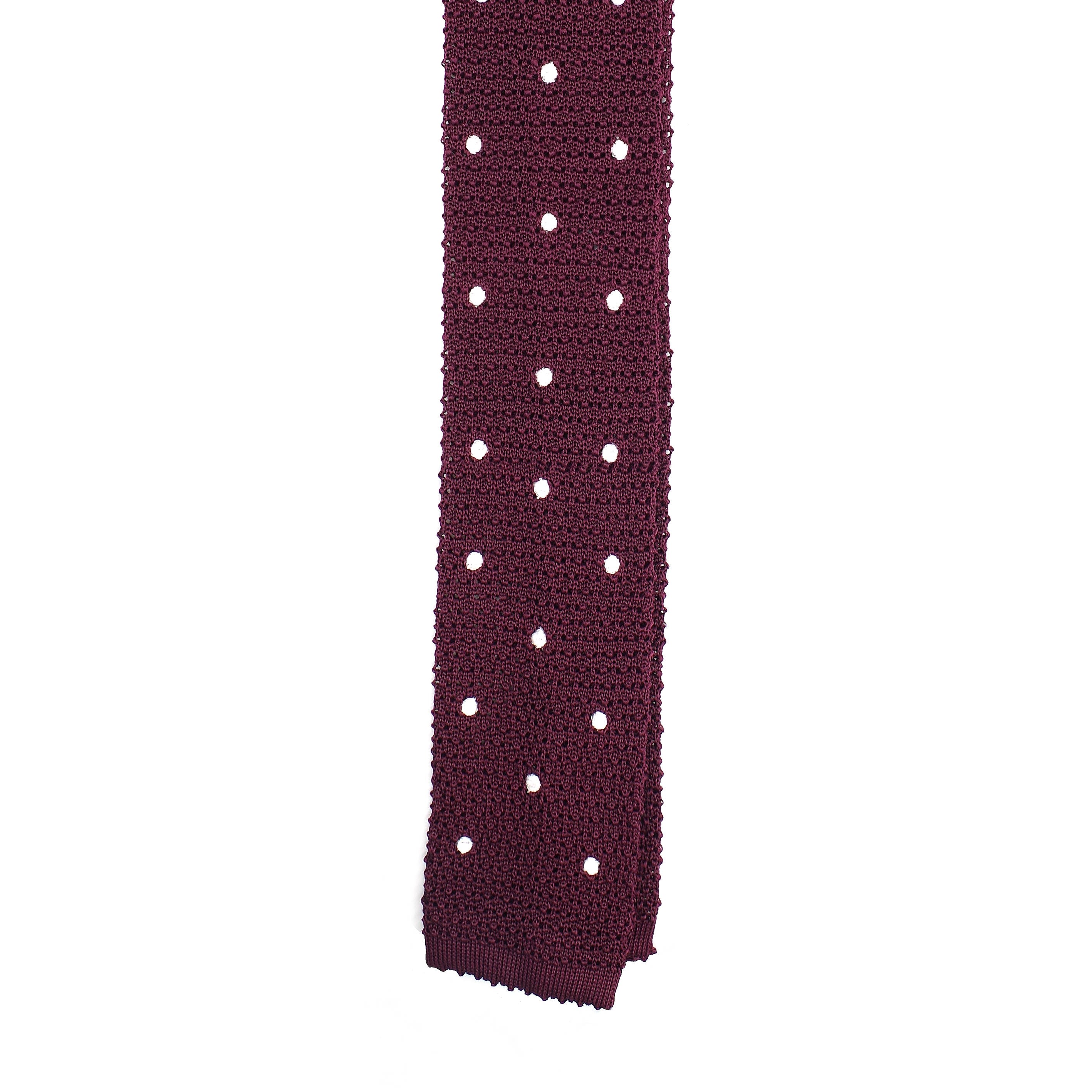 This is a wonderful, essential piece, with plenty of interesting features thanks to the Burgundy red grenadine silk and small, white polka dots. It works very well with a light brown or grey suit, a light blue or white shirt, and a white handkerchief with Burgundy dots.