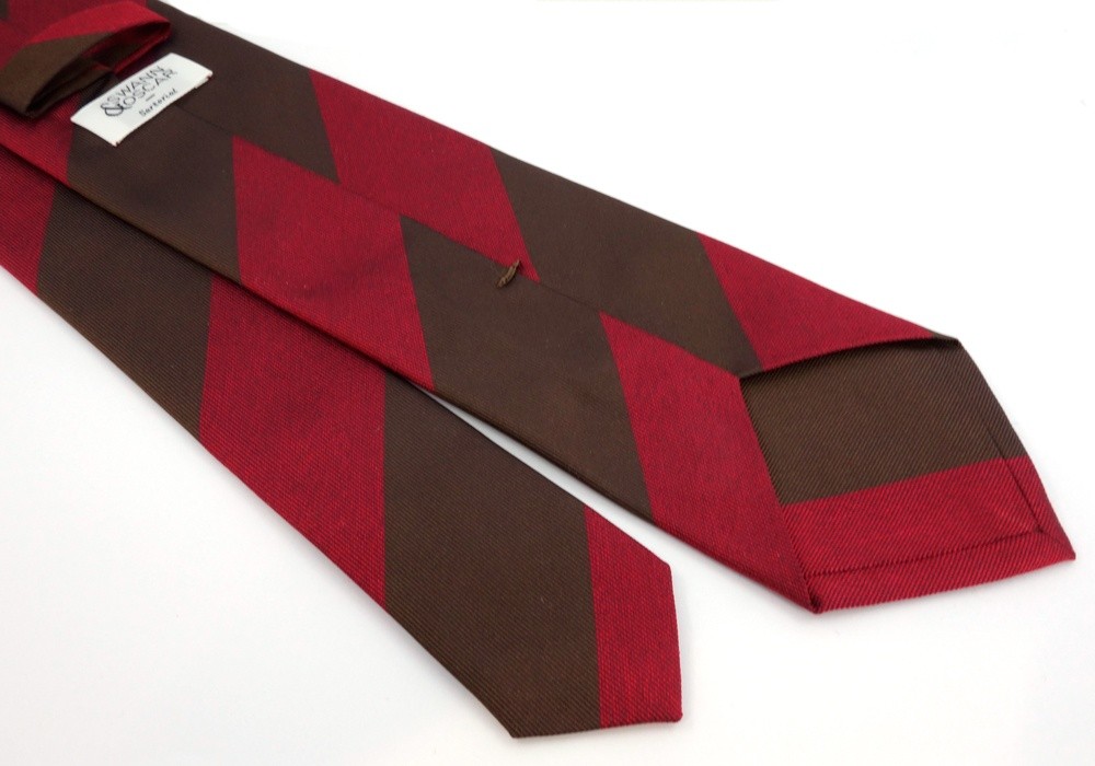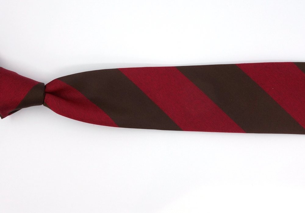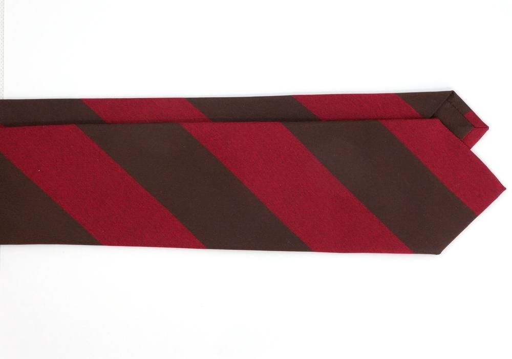 The club tie is back! This silk model will go just as well with your office outfits, your suits or a more relaxed look. Match this red and brown tie with warm, earthy shades: a brown suit or jacket, camel, or light beige trousers, for example.