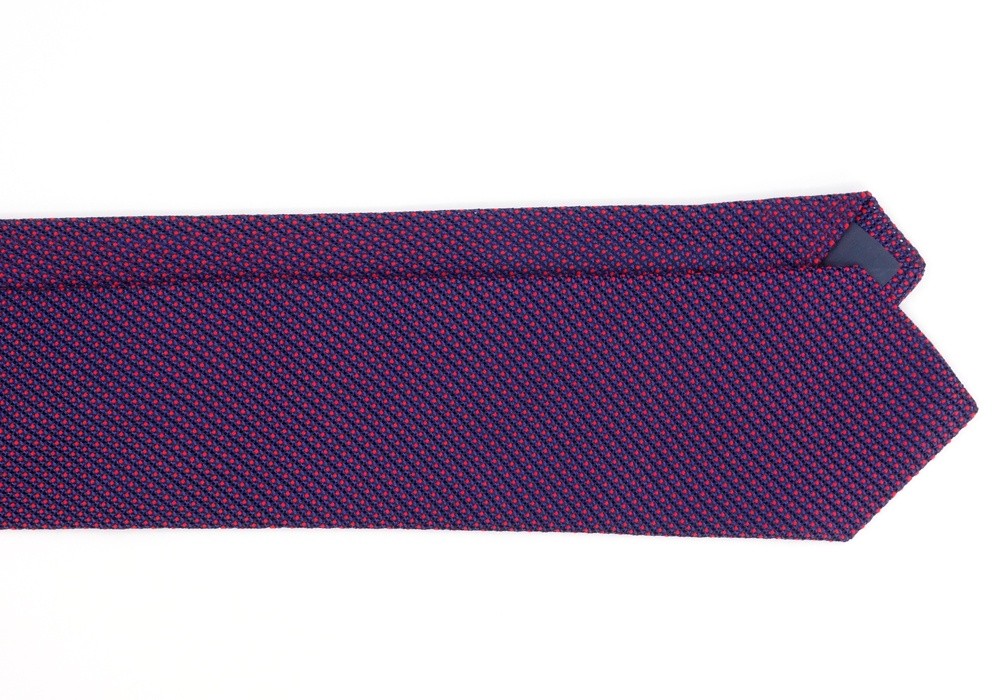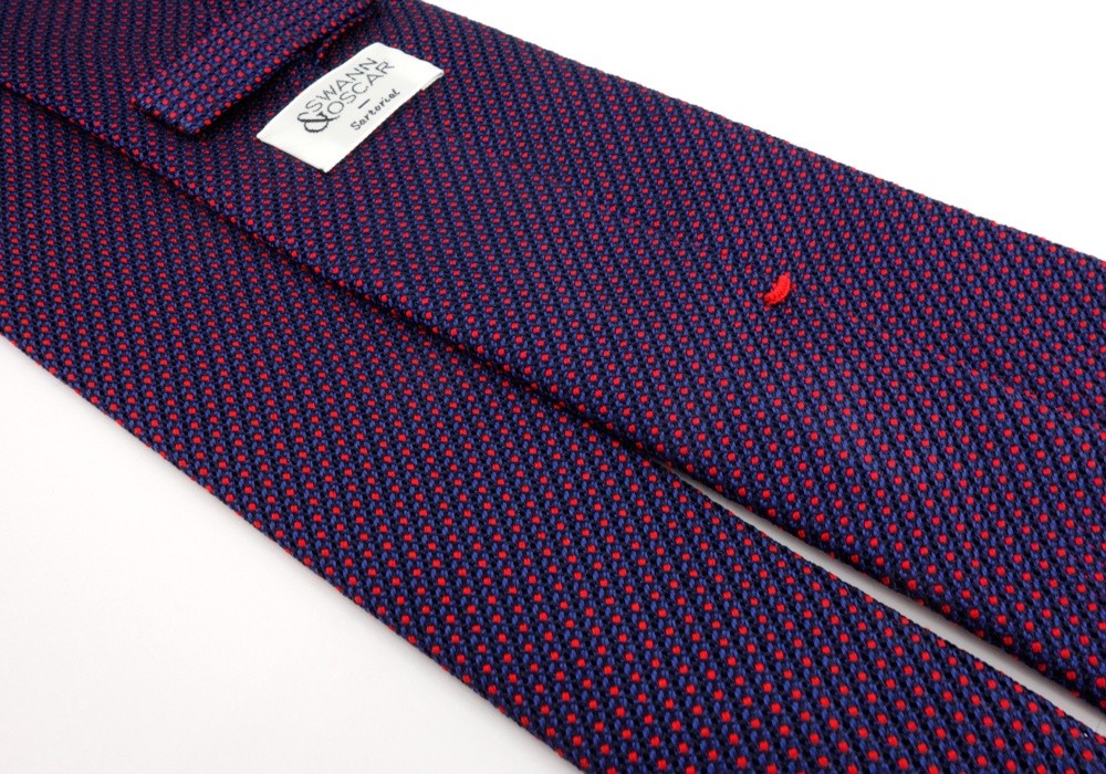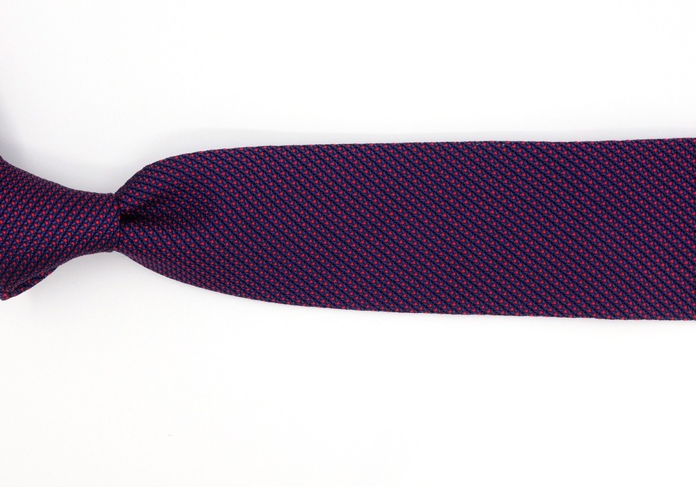 A plain tie that's not really plain and is far from a simple blue tie... which you can see when you look more closely at it. The very airy silk grenadine weave reveals texture and a complementary colour that matches in perfectly: red and blue, the most basic colour association.