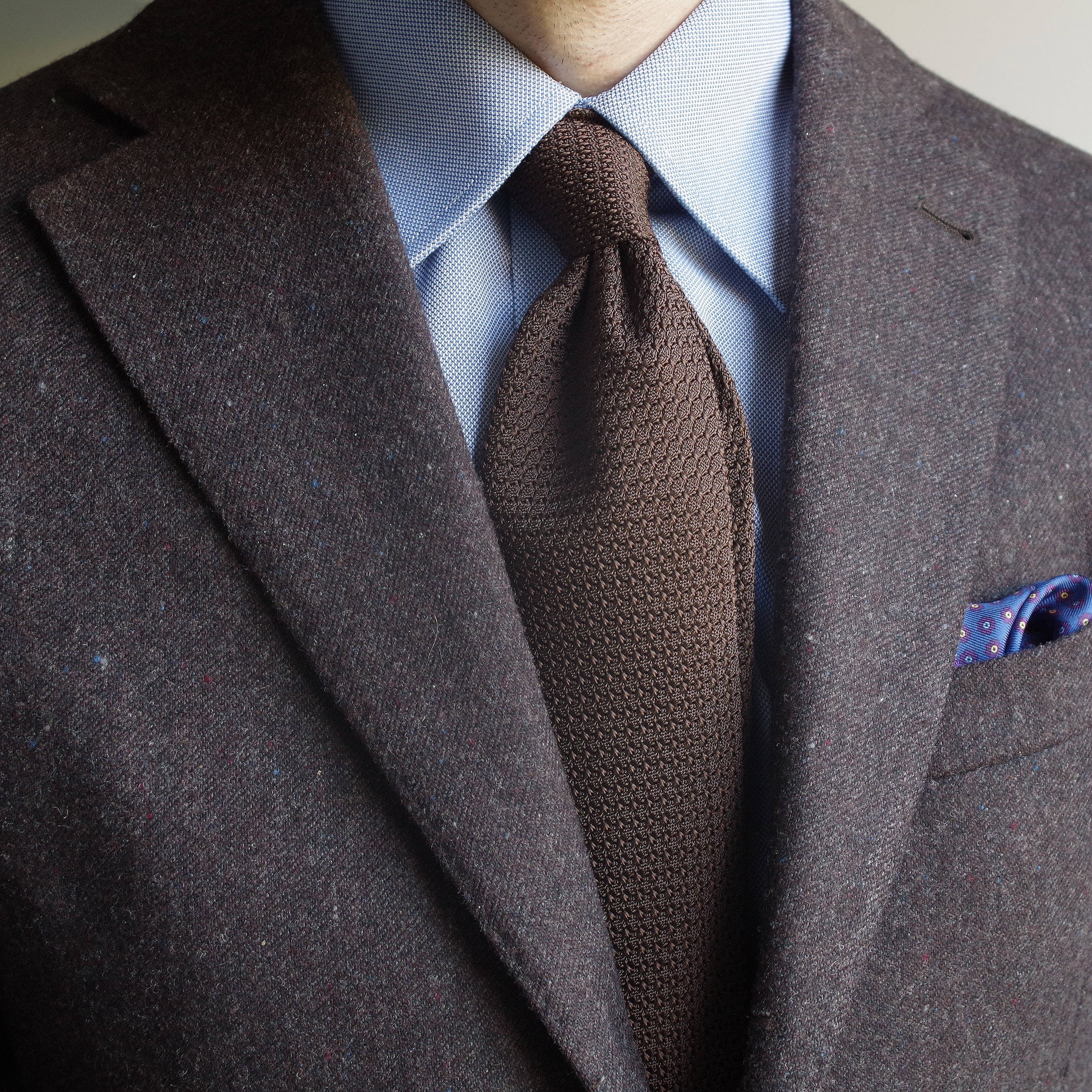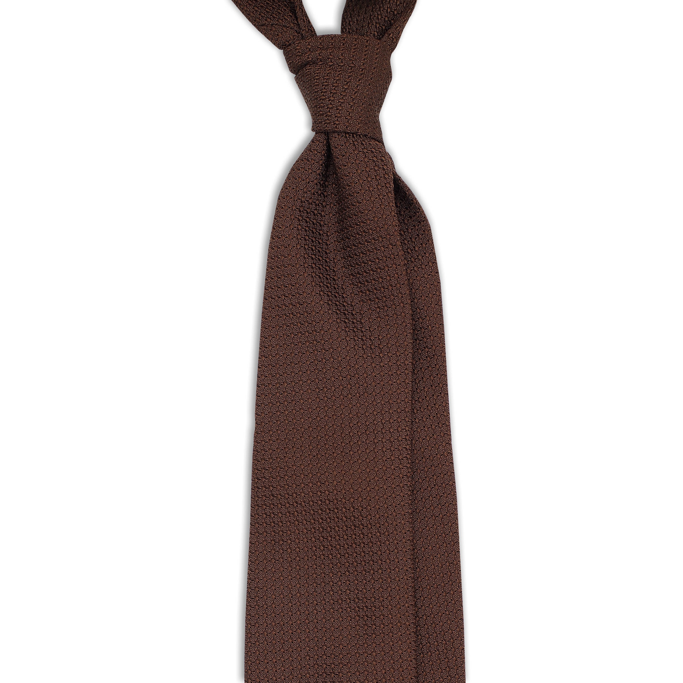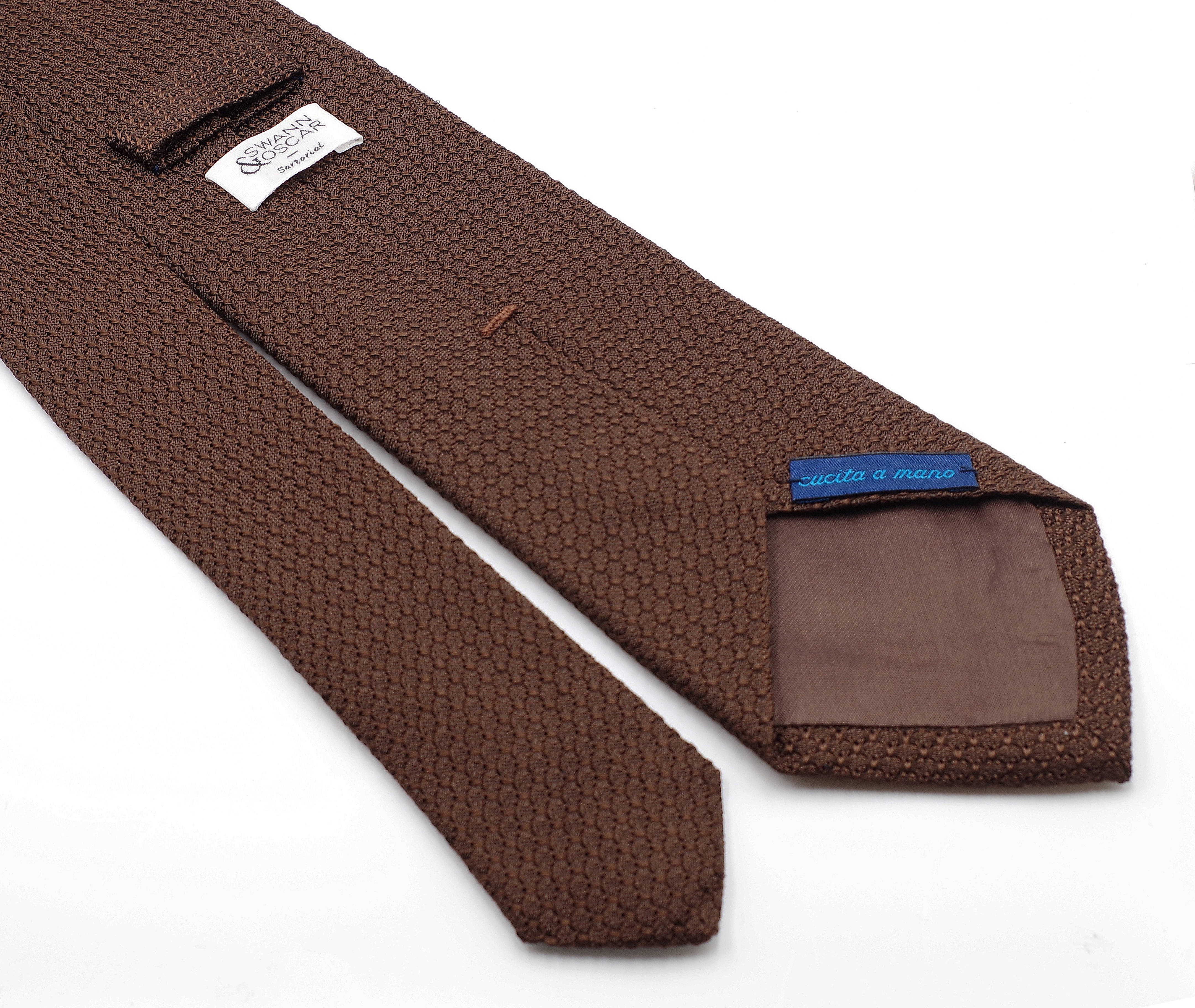 This brown grenadine tie is made from a fabric known as "Garza Grossa." It works just as well with a navy blue suit, a finely-striped white shirt, a white handkerchief with brown patterns, or with a brown jacket, a light blue shirt, and a handkerchief that reflects this colour combination. A collection made with a lining "foderata".