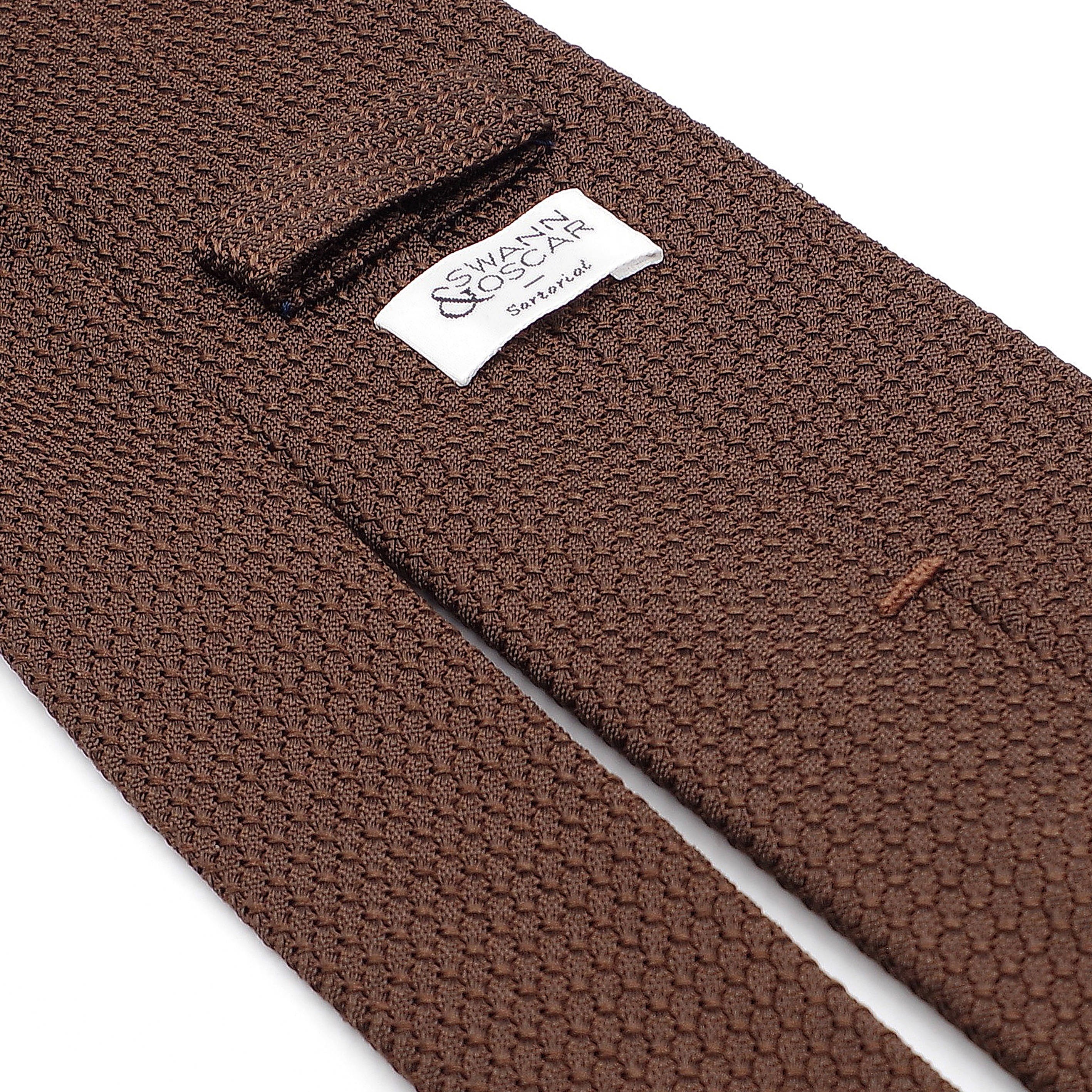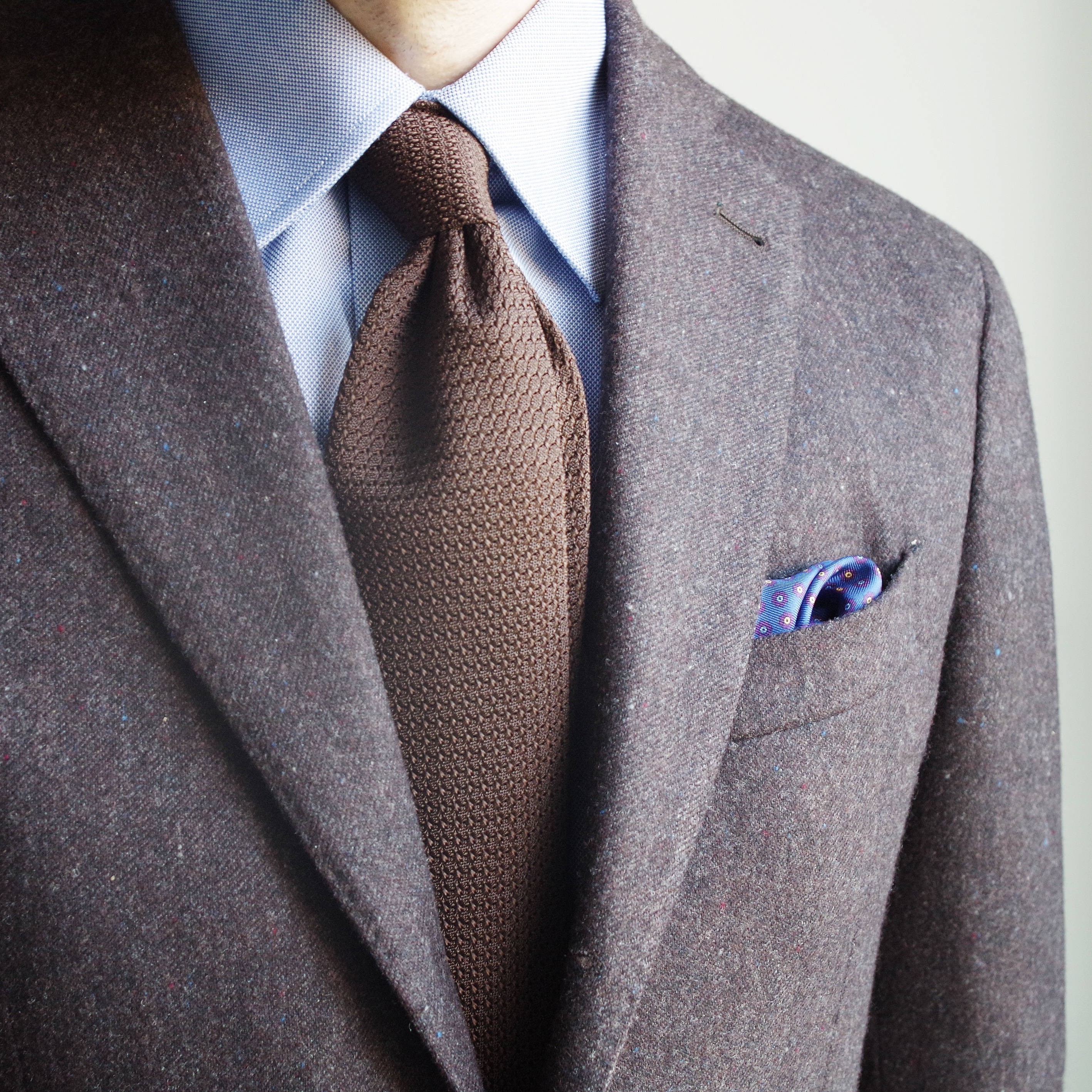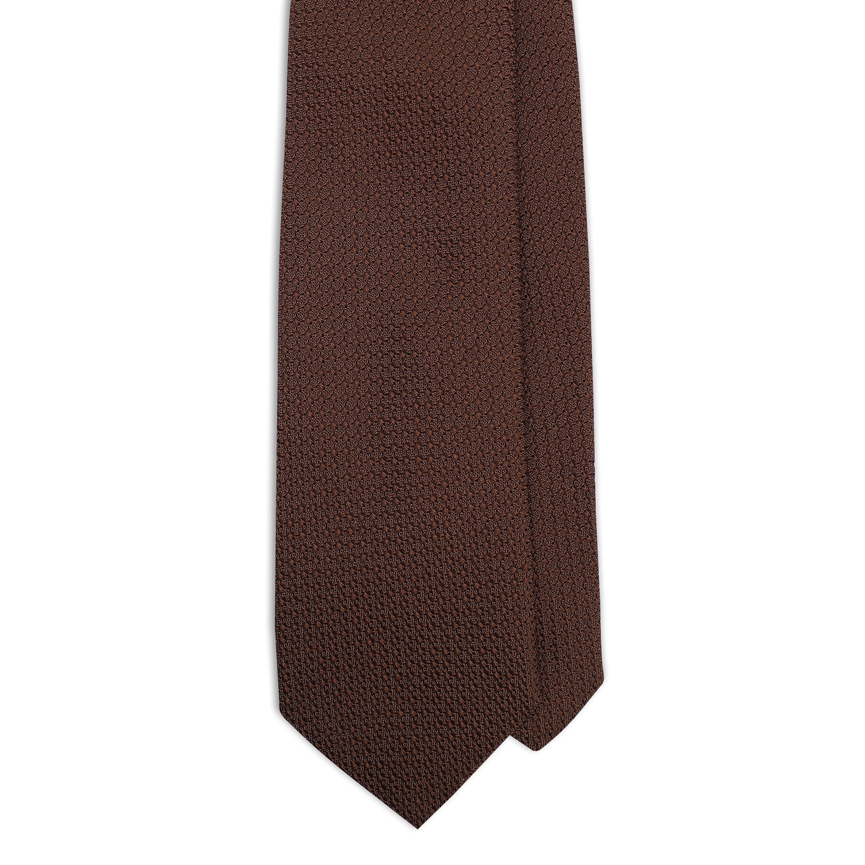 This brown grenadine tie is made from a fabric known as "Garza Grossa." It works just as well with a navy blue suit, a finely-striped white shirt, a white handkerchief with brown patterns, or with a brown jacket, a light blue shirt, and a handkerchief that reflects this colour combination. A collection made with a lining "foderata".