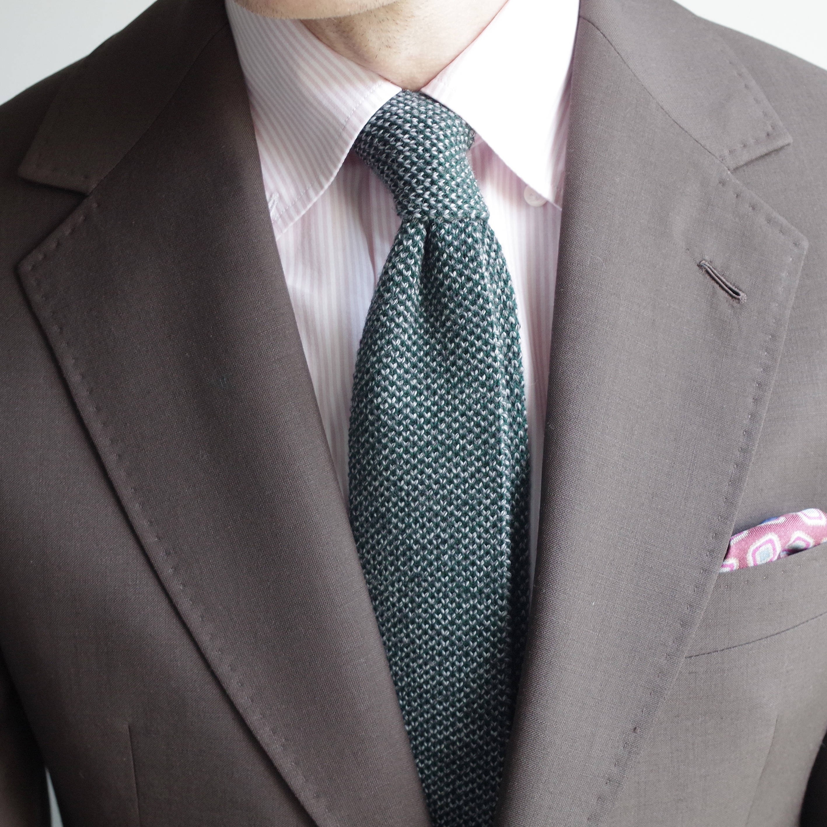 Even though the green colour goes perfectly with blue, we are offering a subtler colour combination this time around. The wool gives it a warm style that you can where anywhere. The green colour works very well with a suit, a brown jacket or a white shirt with pale pink stripes as worn by our model.