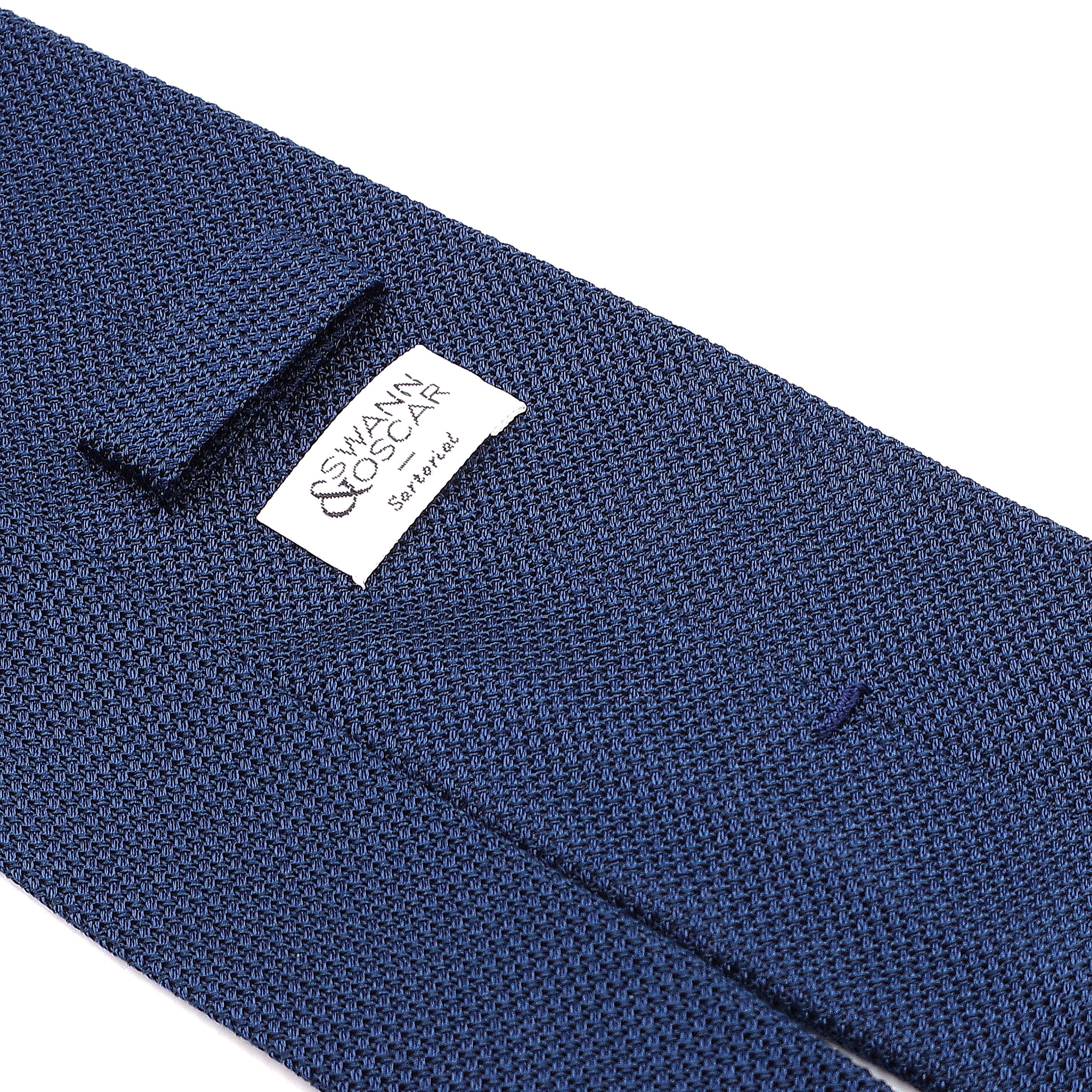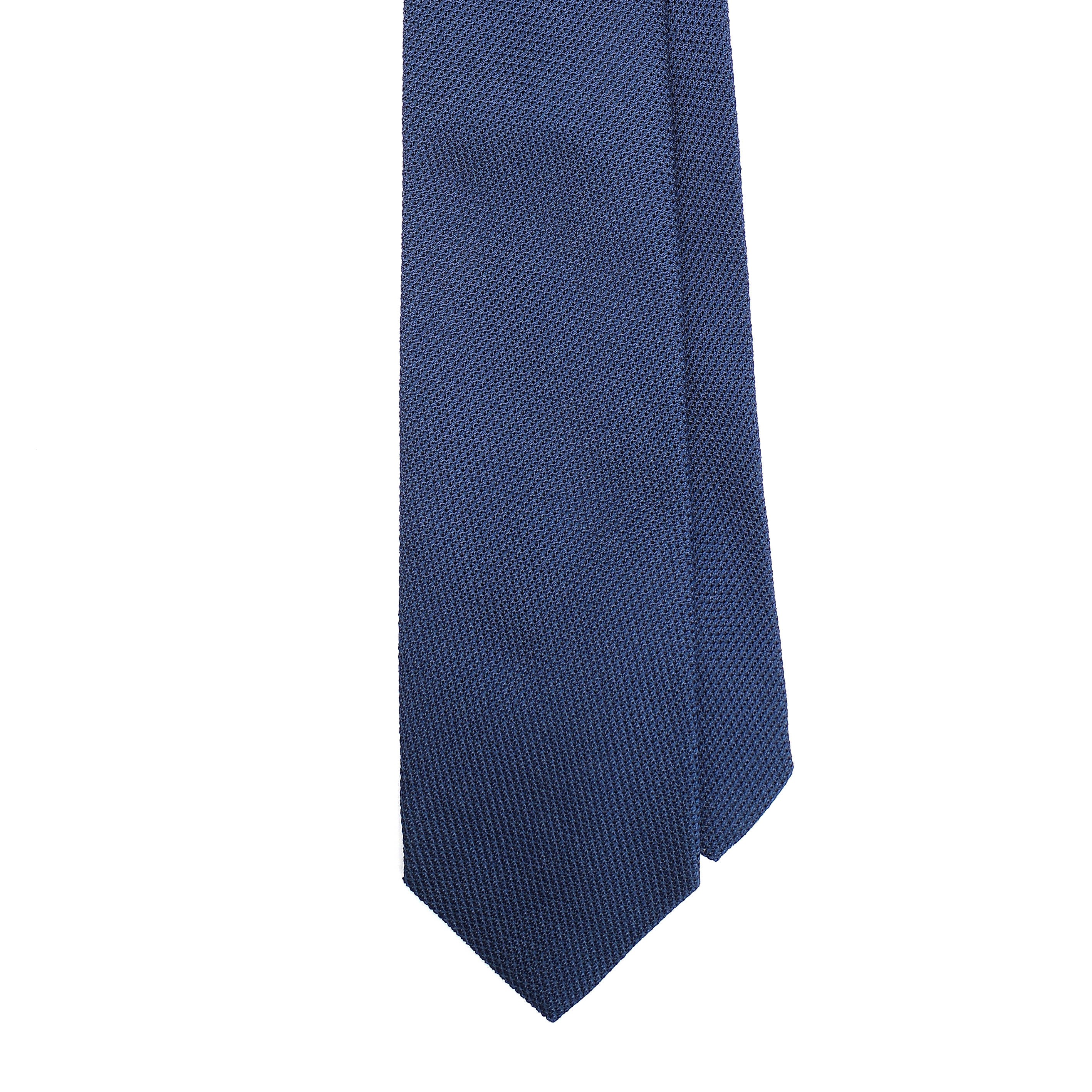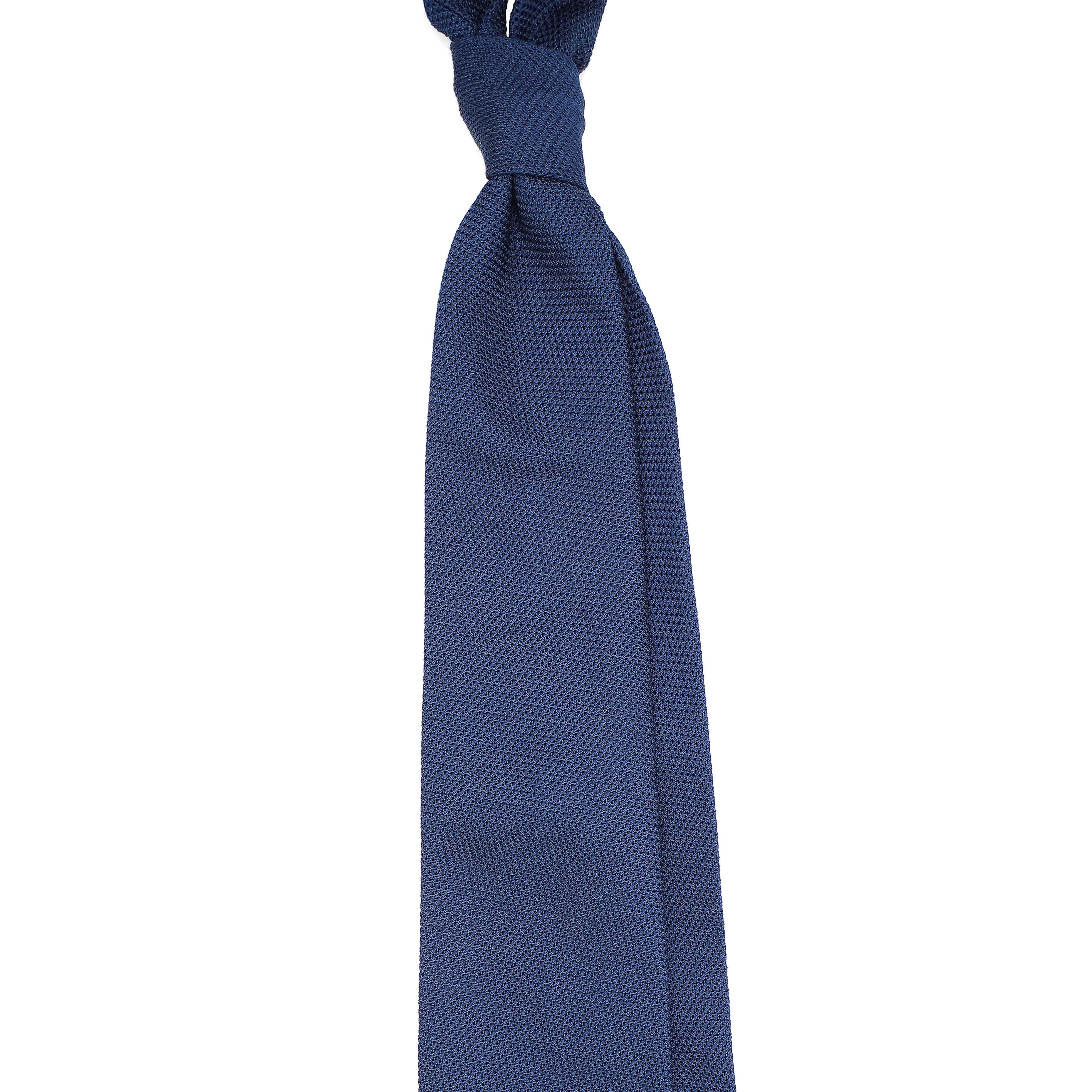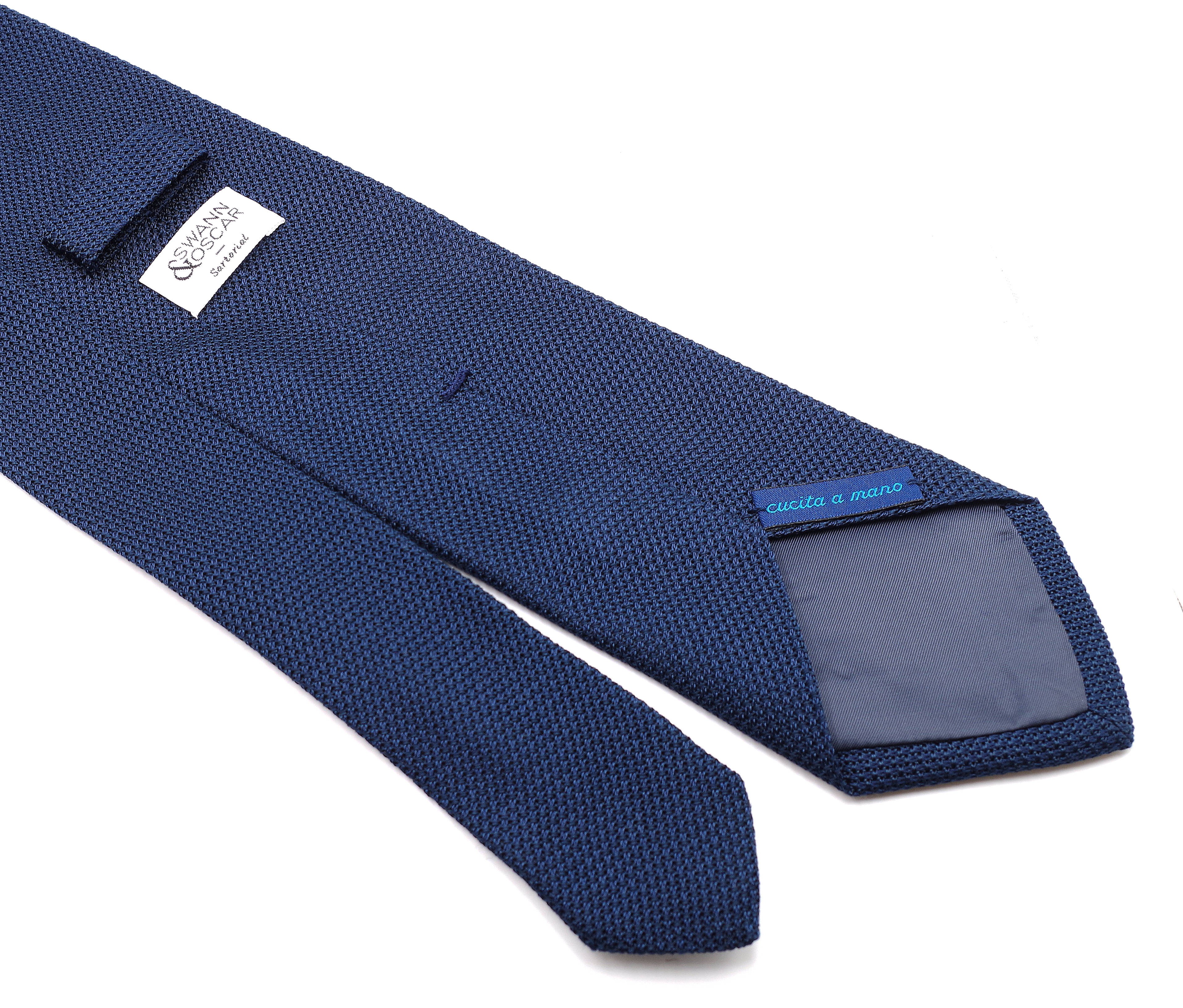 This blue grenadine tie is made from a fabric known as "Garza Fina," which is finer and looks almost turquoise. It's quite straightforward to use, going perfectly with a light grey suit and a white shirt. However, it can also be used very effectively to tone down a more daring suit, such as a thick, brown woollen suit, in combination with a handkerchief that recalls its blue tones.