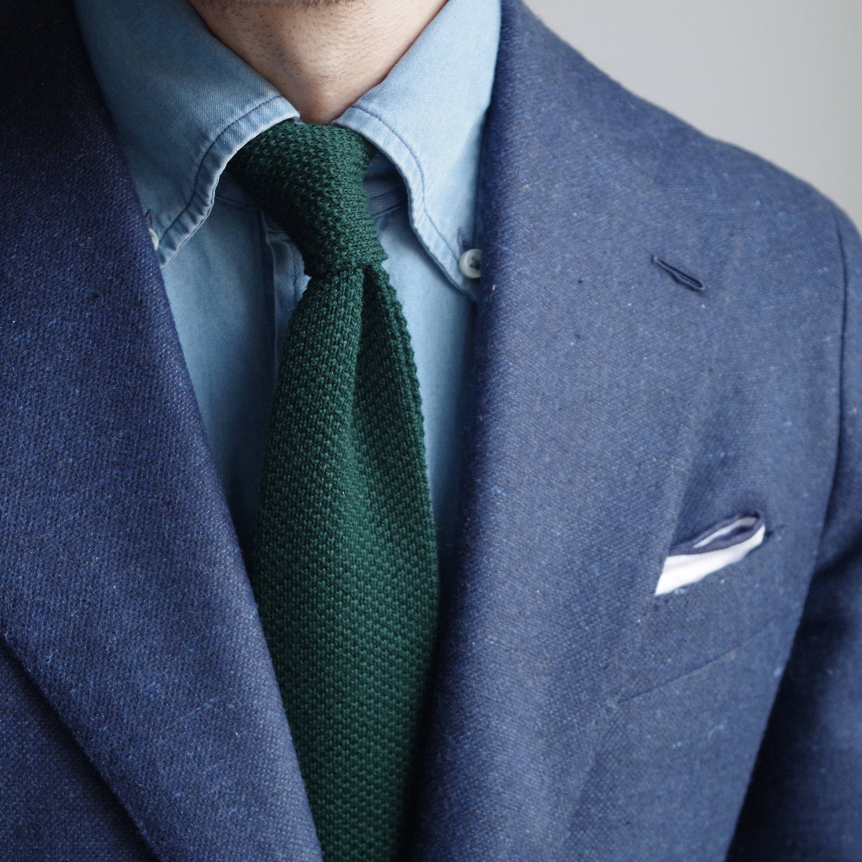 A wool tie with a stylish, sportswear character. The green combines perfectly with the blue, and you can easily imagine it with a button-down denim shirt as worn by our model. A perfect pairing for you.