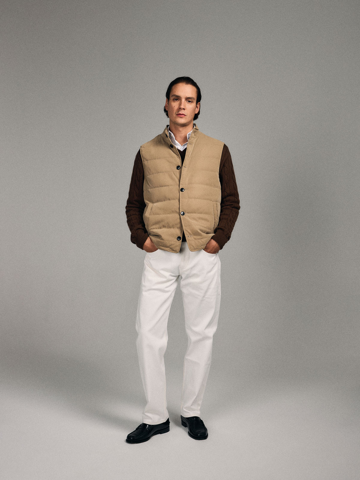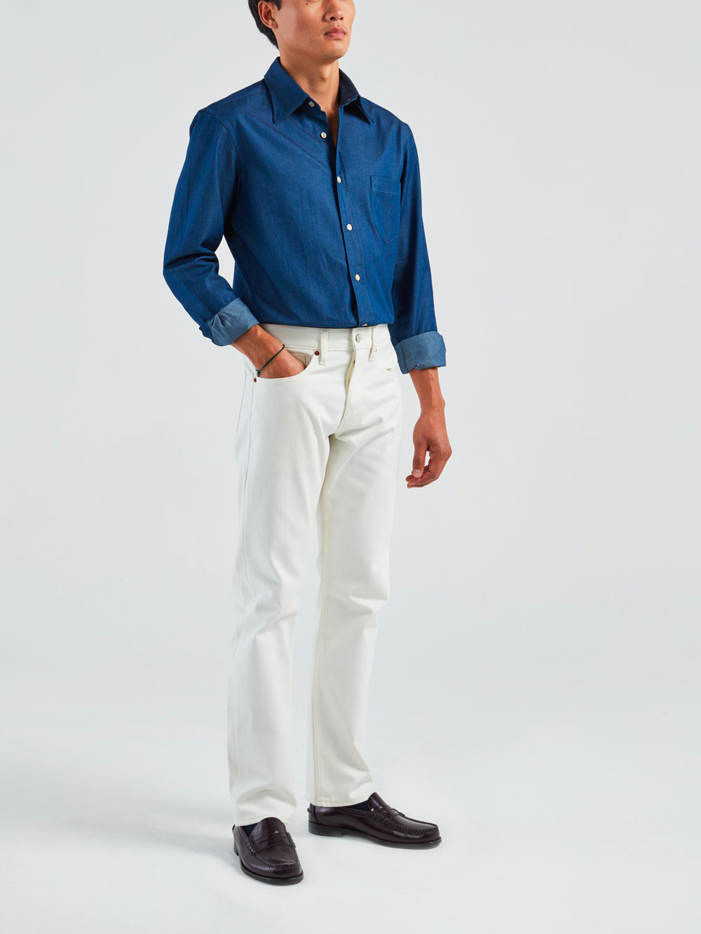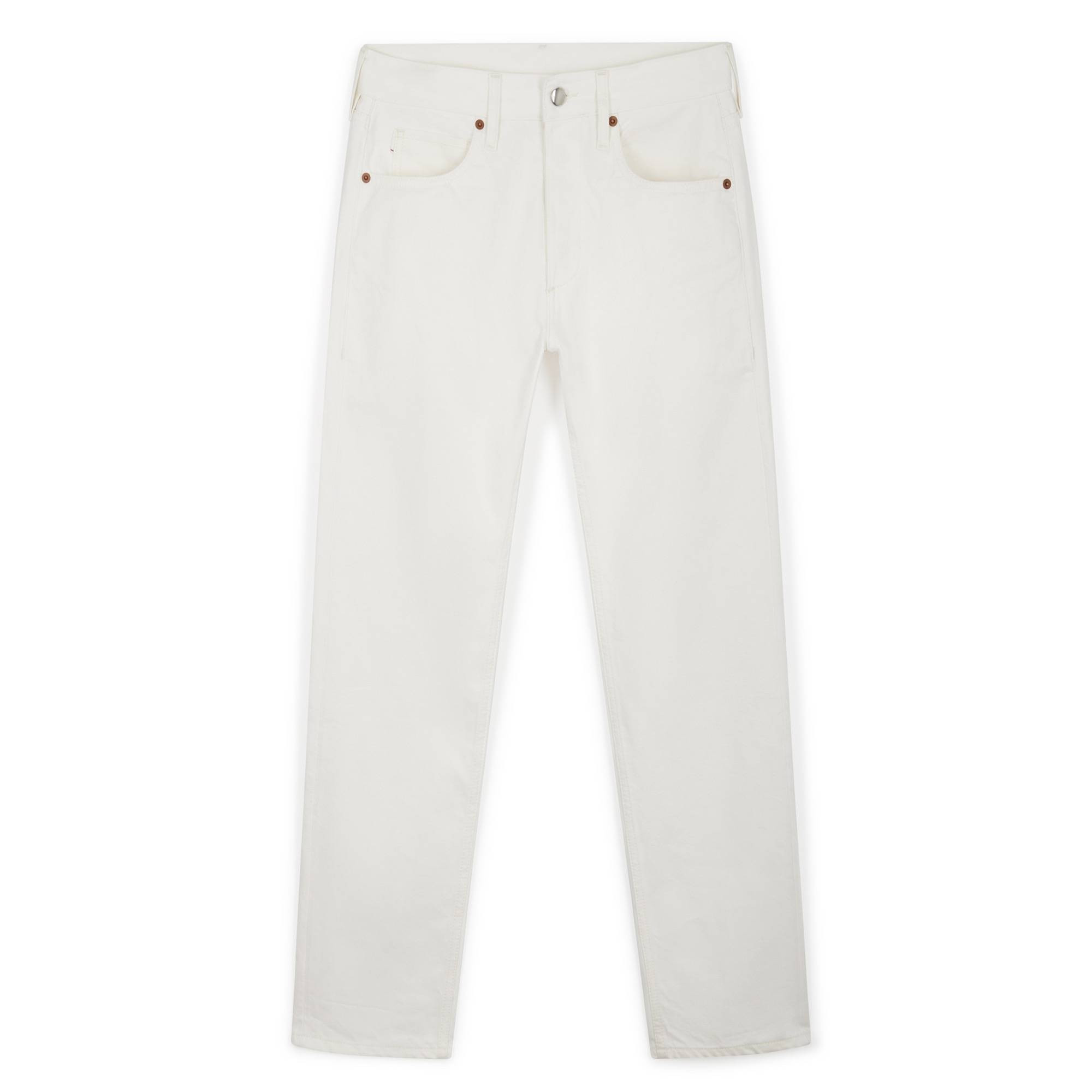 5 pocket jeans, white, made in Italy. These jeans are cut in a classic American-inspired shape with a flattering fit: slightly higher waist and a narrowed leg at the bottom. We use a beautiful quality of Italian denim woven on a handmade shuttle machine. It's the softest and most comfortable fabric in our line, ideal for spring and summer.