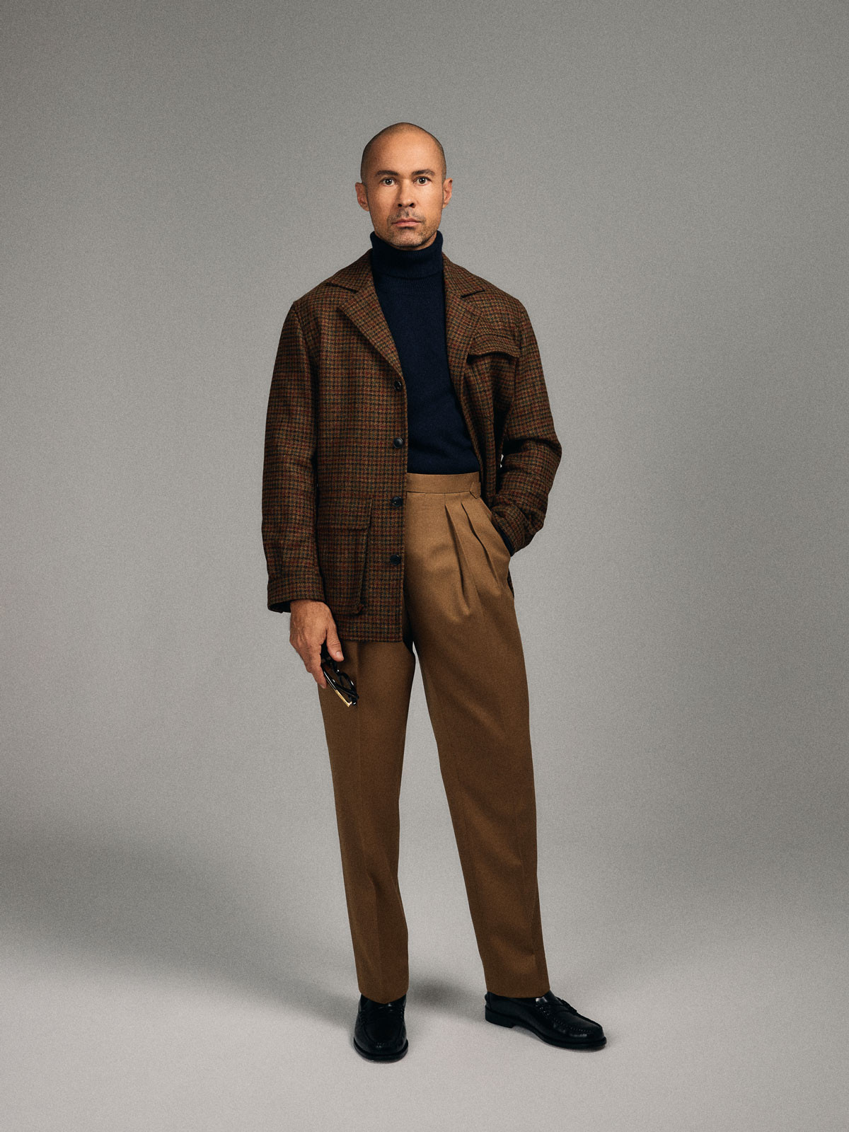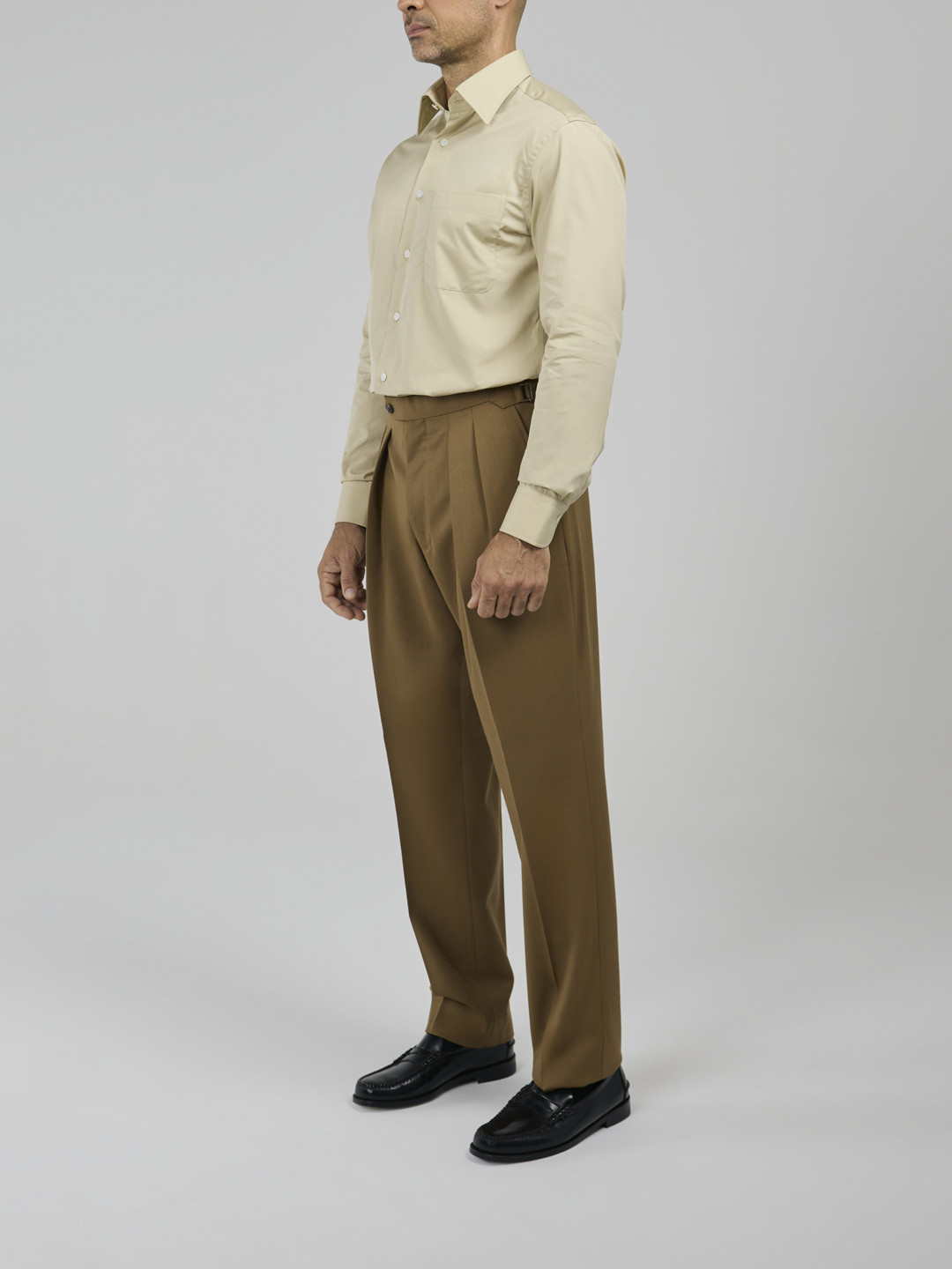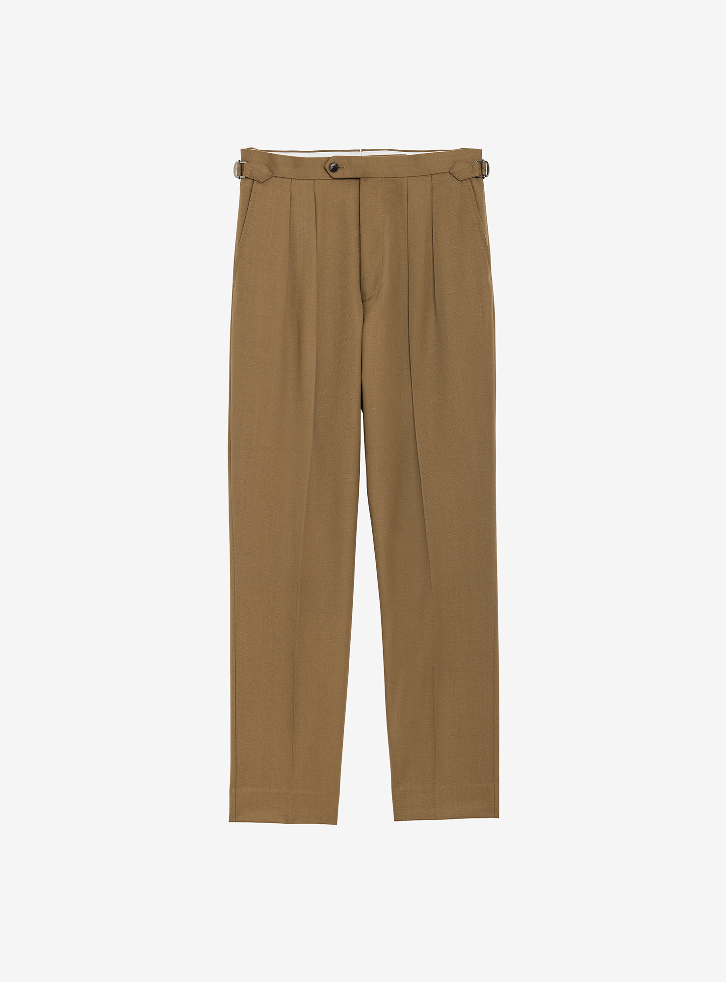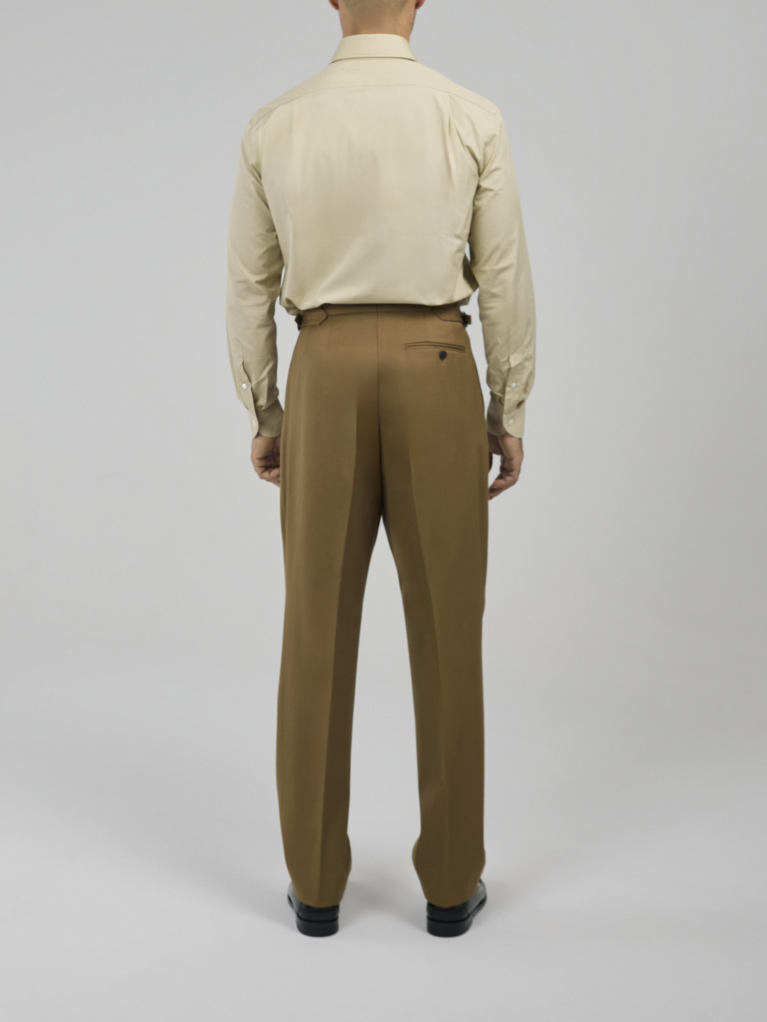 Beige Cavalry Twill Trousers with side adjusters, double inward pleats, plain hem without turn-ups.