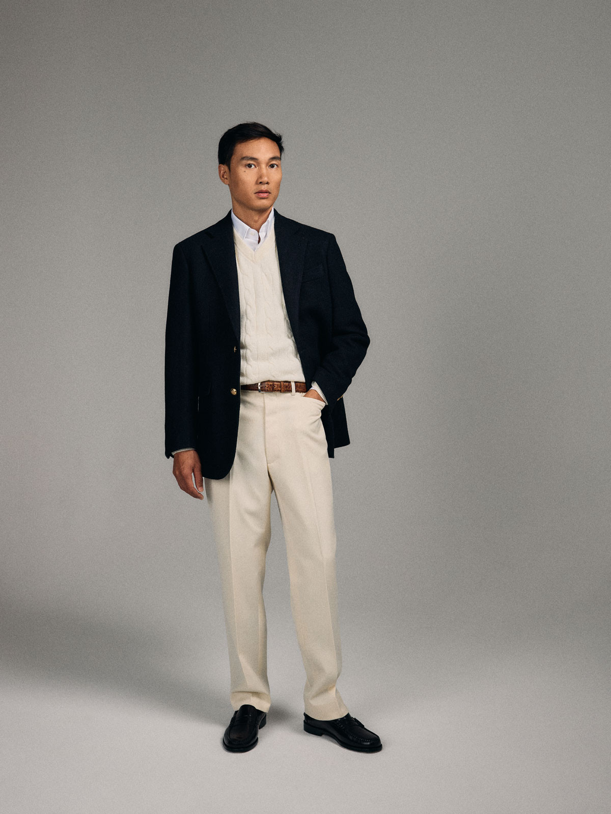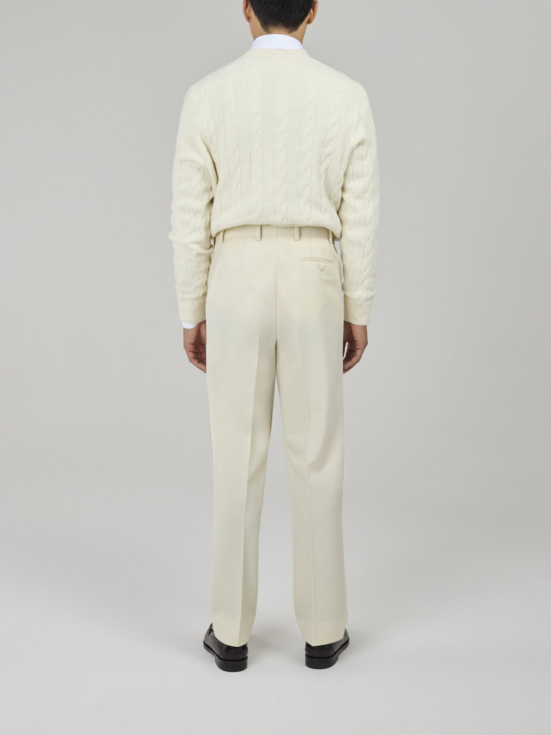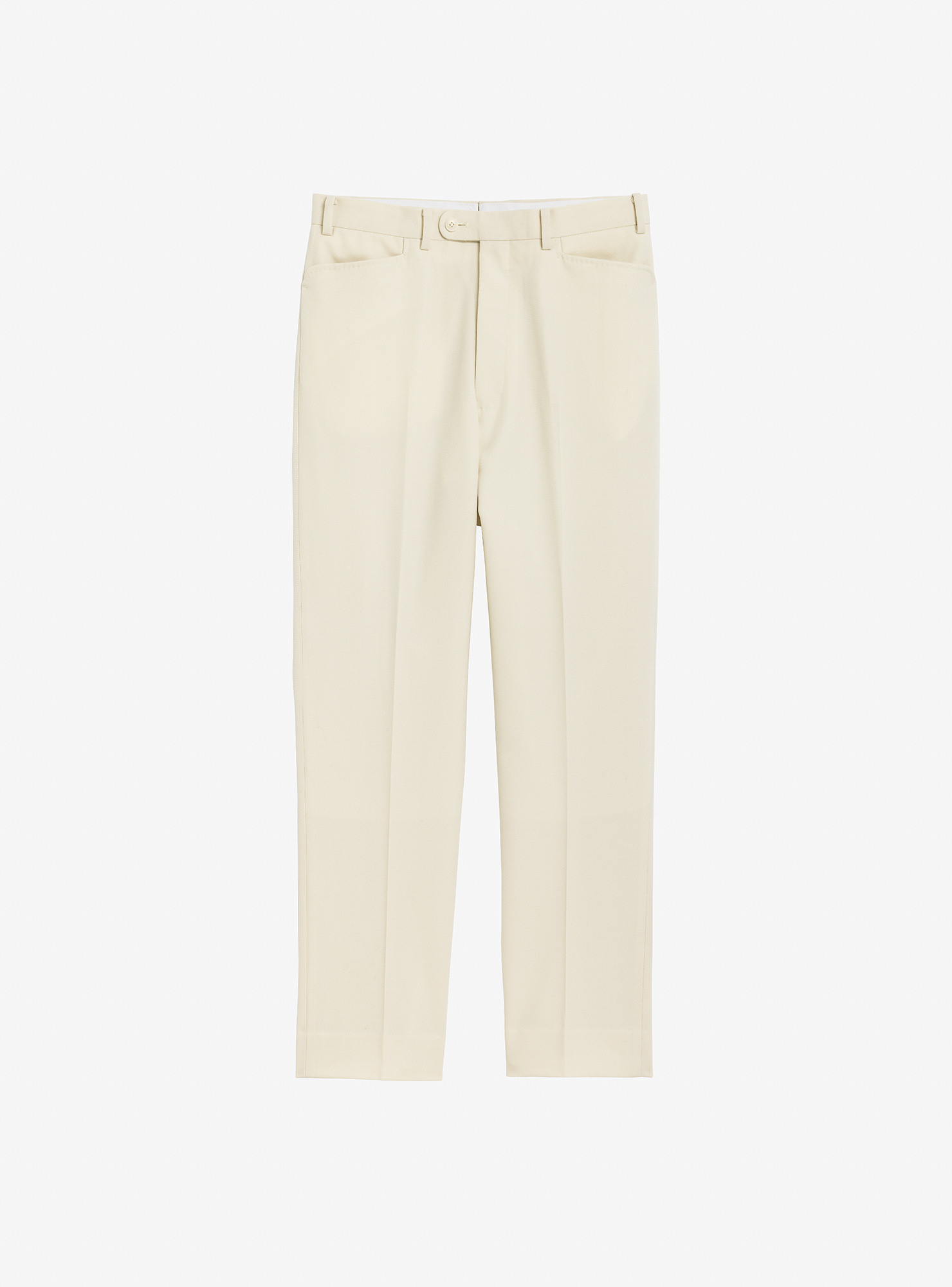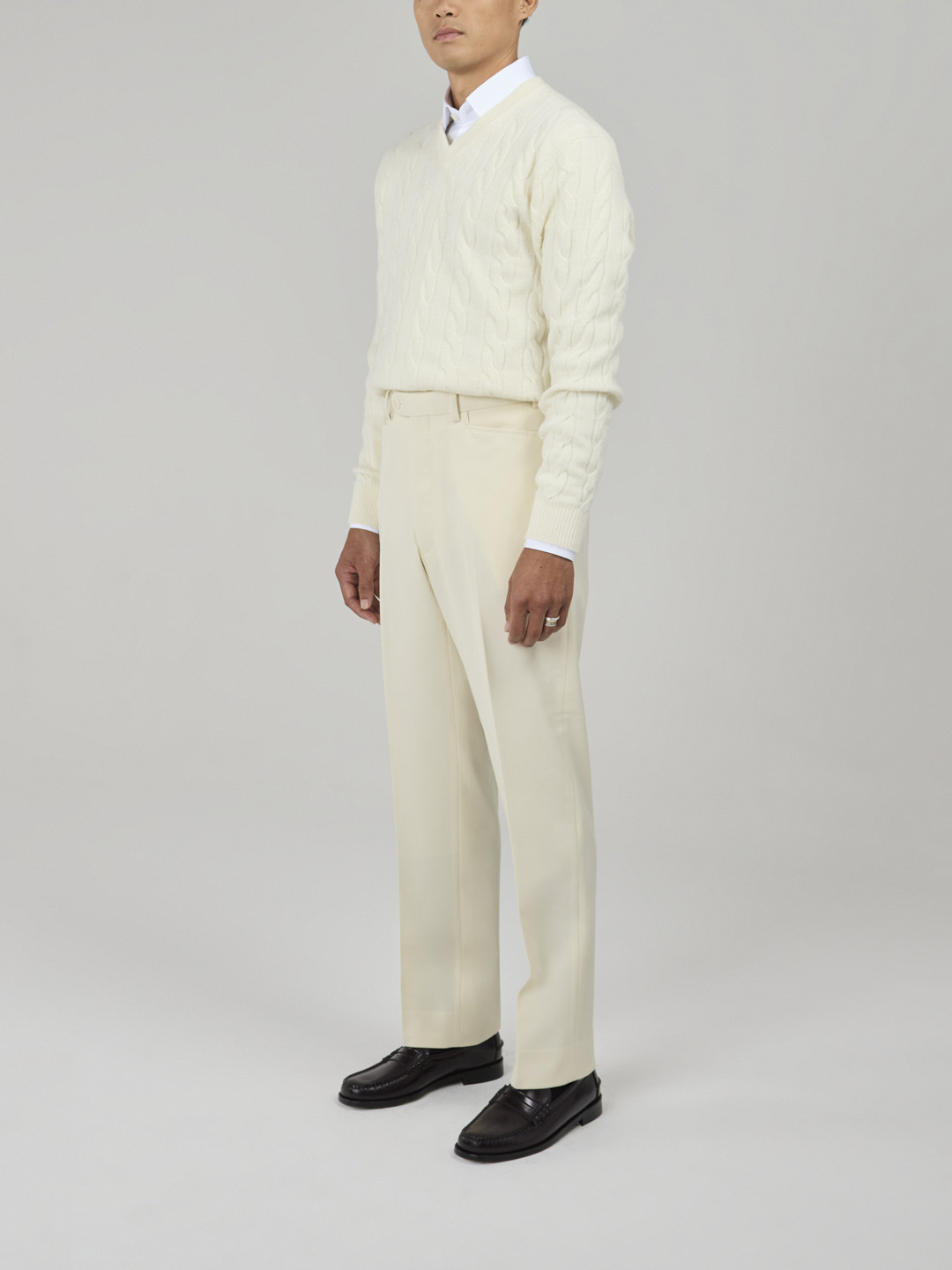 Ecru Cavalry Twill Trousers with belt loops and side adjusters, slanted western pockets, no pleats, plain hem without turn-ups.