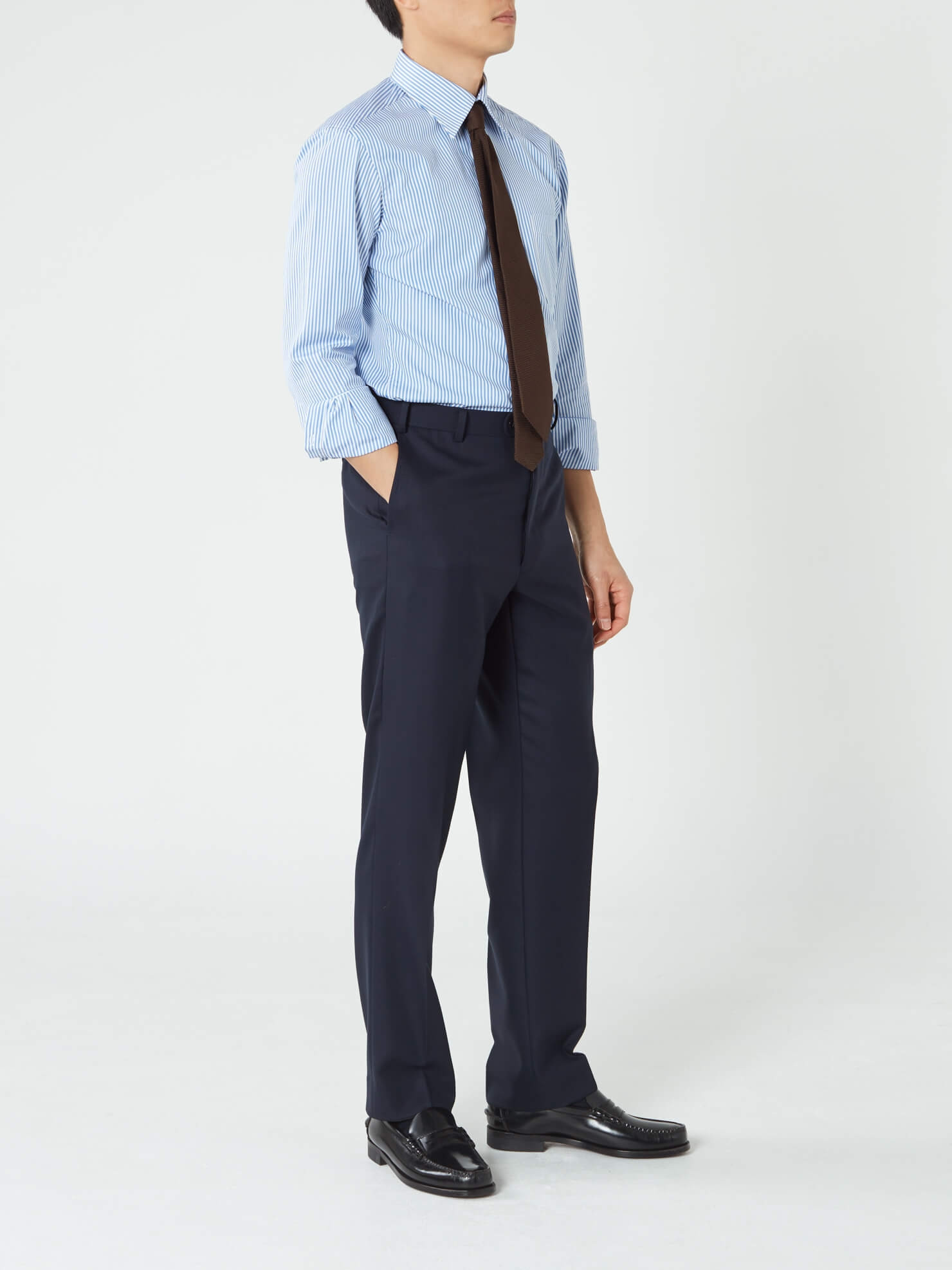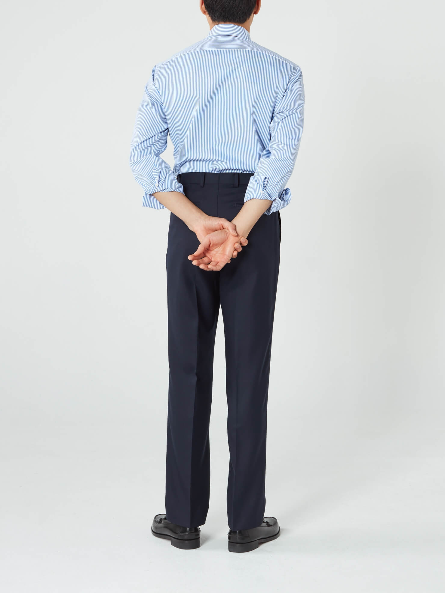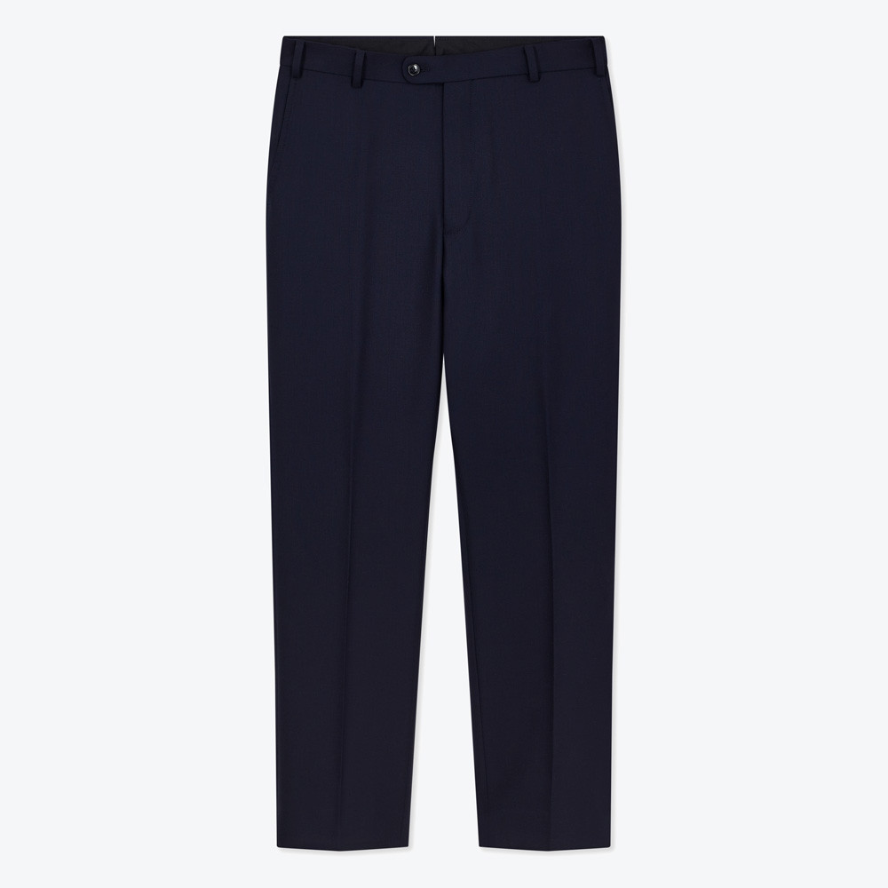 Classic navy wool trousers- Classic pants without pleats, belt loops, slanted side pockets, two welt pockets with buttons in the back, simple bottom without cuffs.