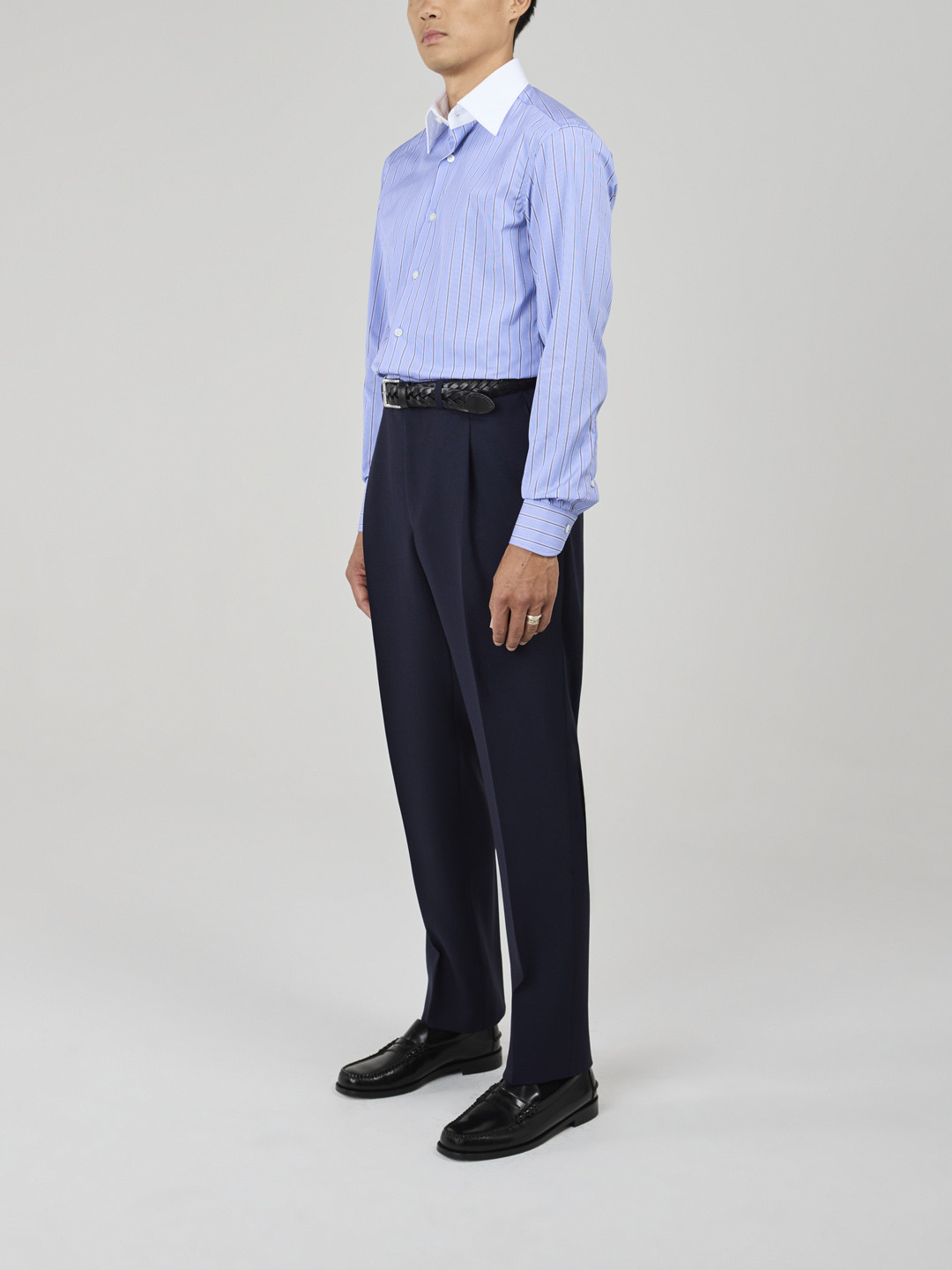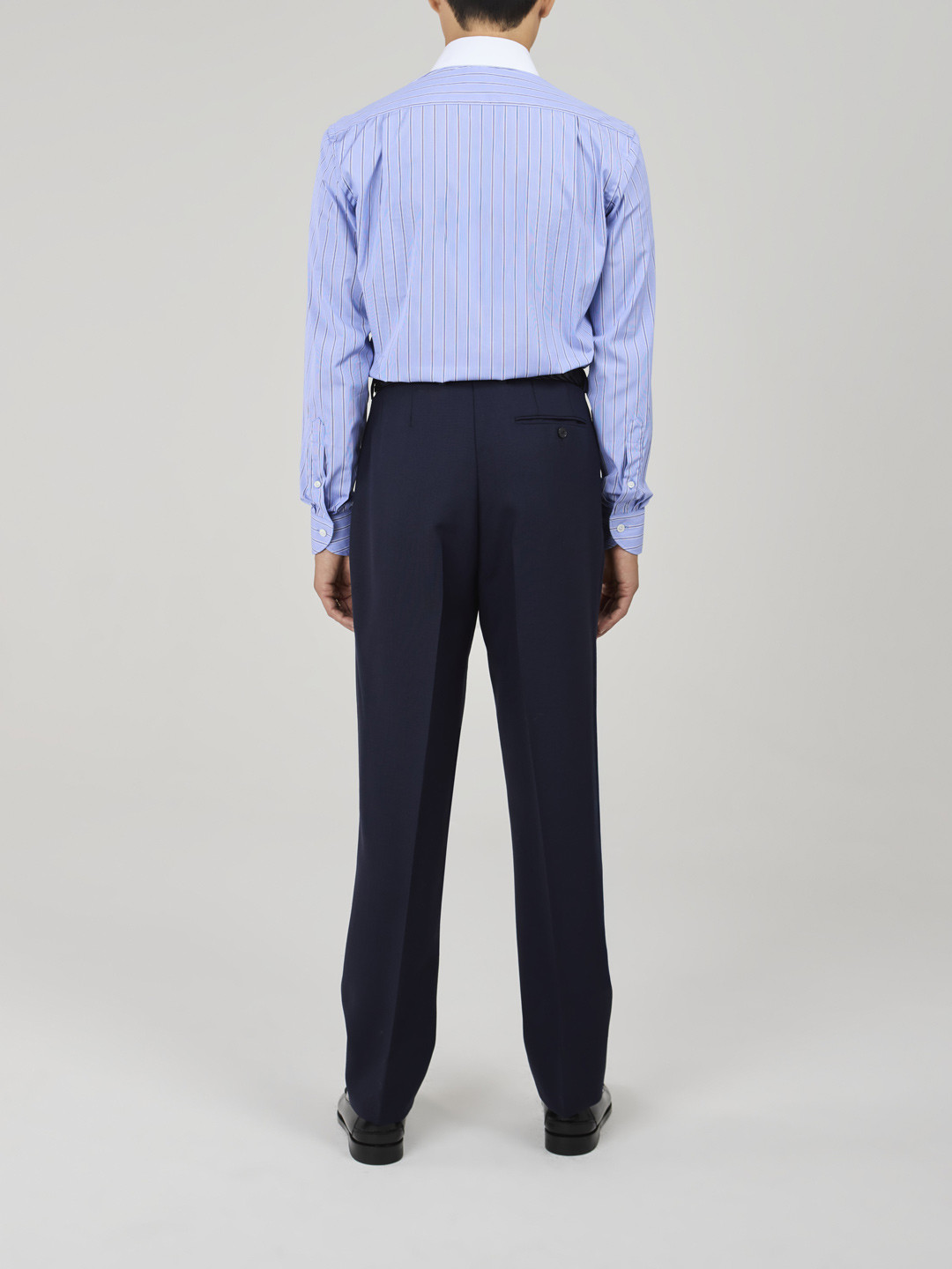 Navy Fresco Trousers with belt loops, single outward pleat, plain hem without turn-ups. Made in Italy.