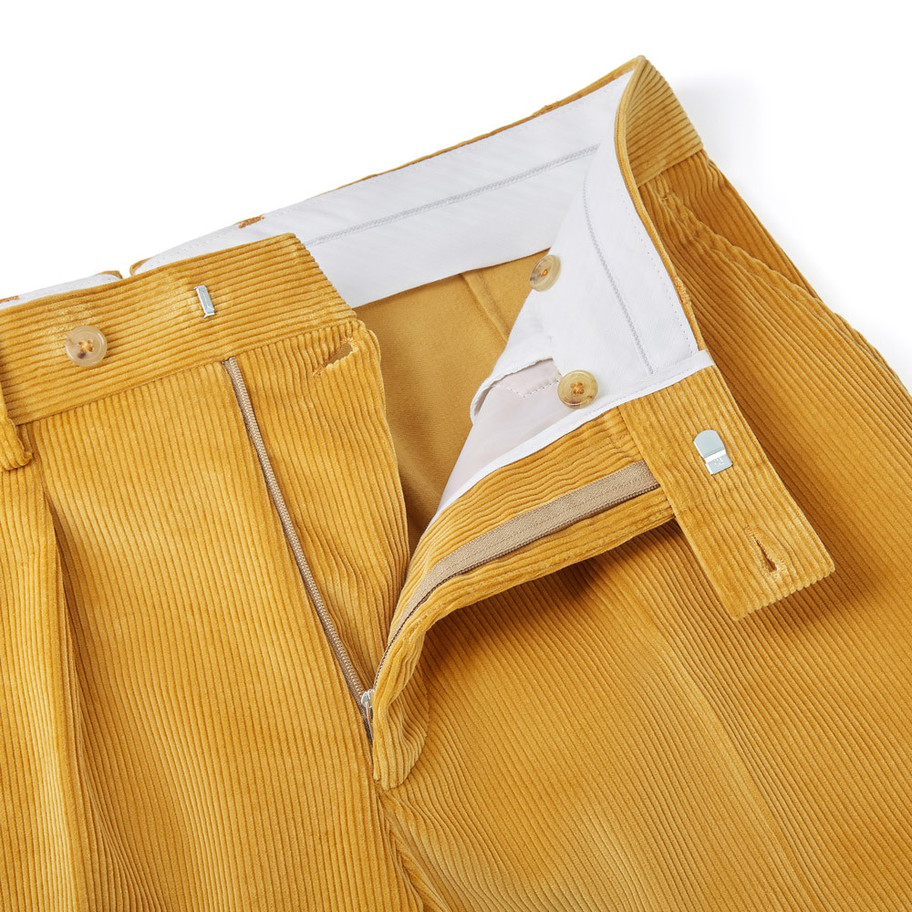 Yellow velvet pants, marked crease at the leg, one pleat, and after dinner split. English fabric with big ribs with a very good hold. The velvet allows you to be both chic and casual. It can be worn with a sports jacket, a shirt or a turtleneck. The pants are delivered with a lapel at the chosen length (3 sizes to choose from). If you want unfinished pants or a hem rather than a lapel, you send us an email after your order and we will take care of it!