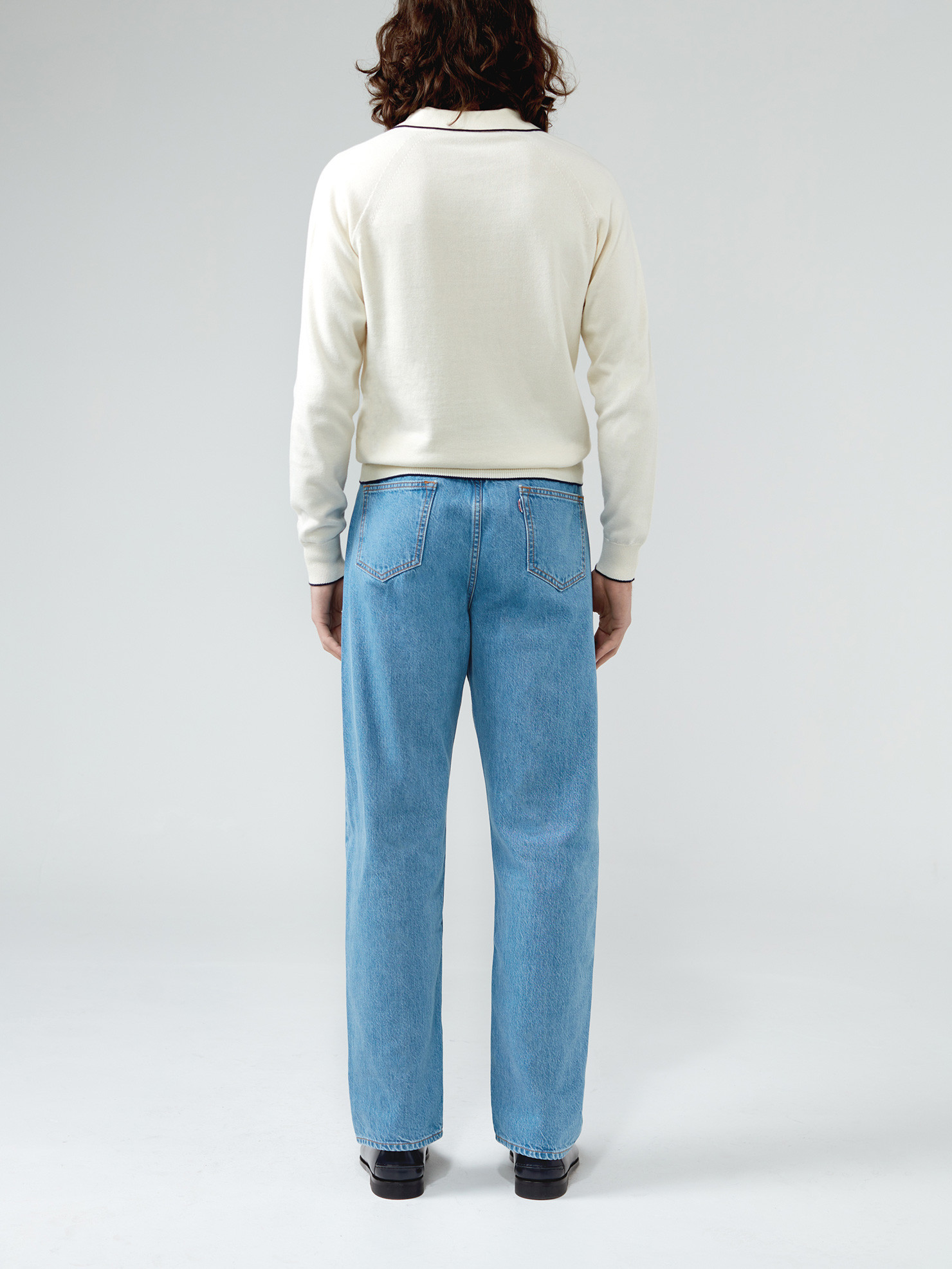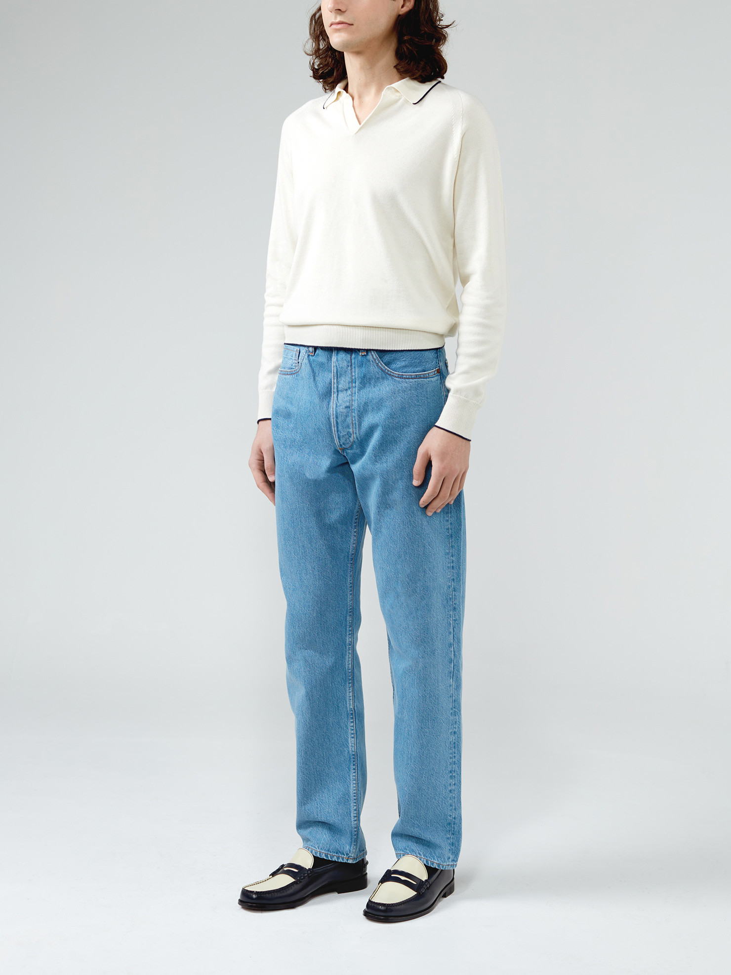 Cotton cashmere ecru polo shirt, collar piping, cuffs and bottom navy, collar without button, long sleeves, woven in Italy.