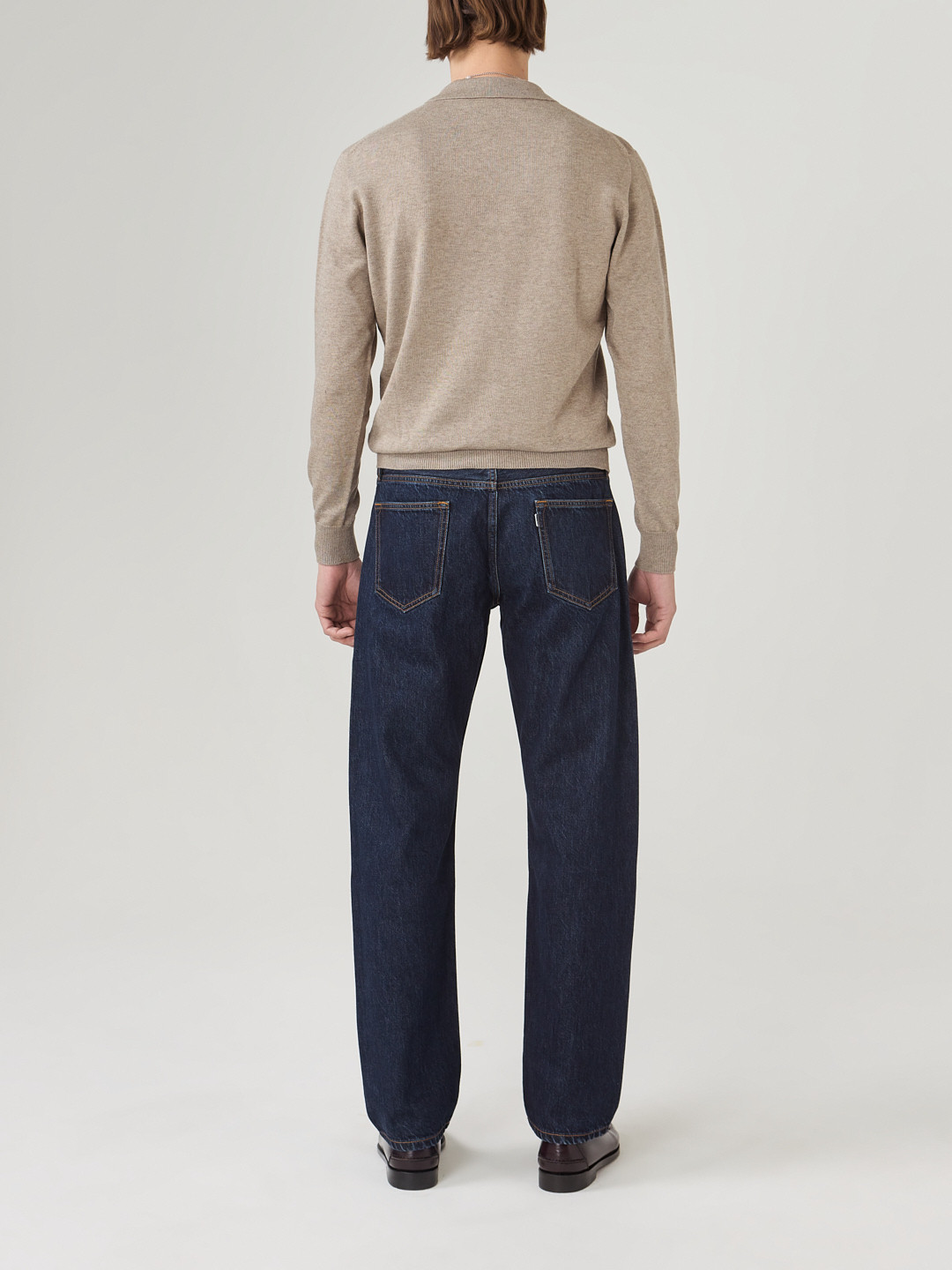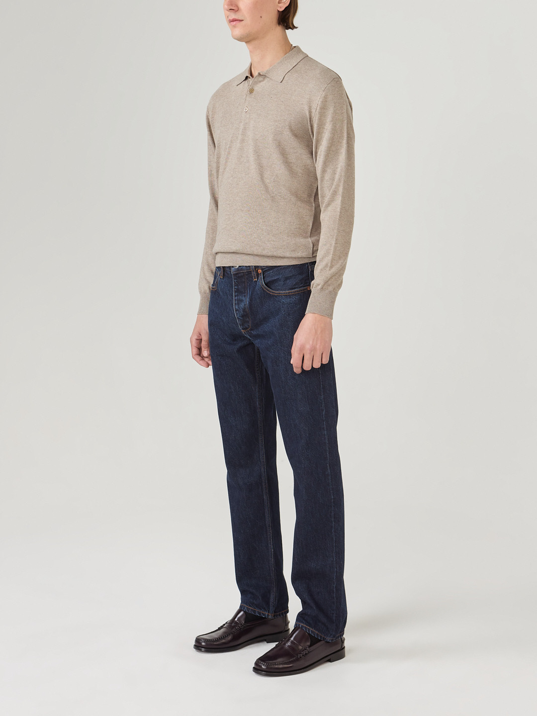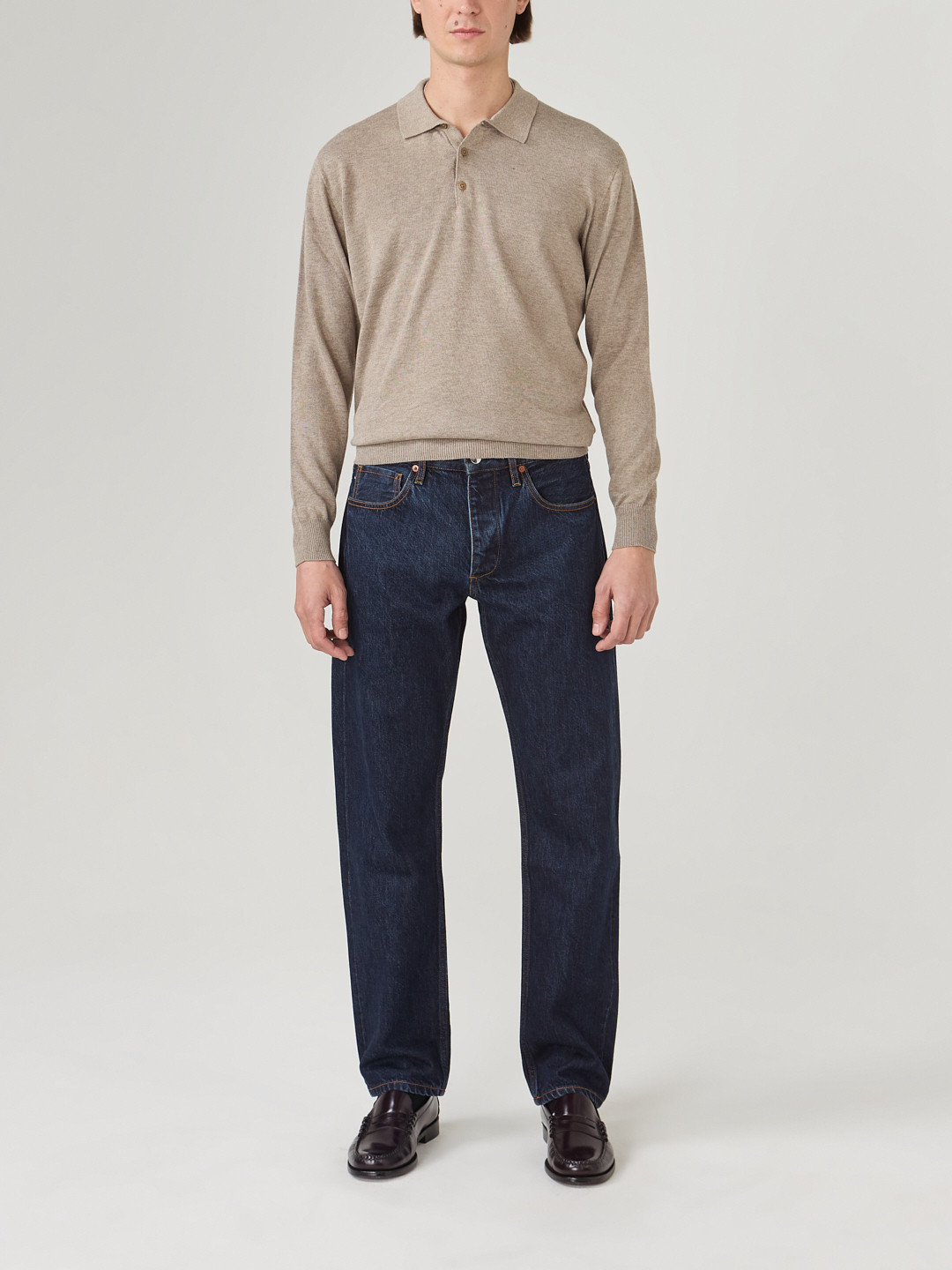 Polo shirt in taupe cashmere cotton, 3-button collar, long sleeves, woven in Italy.
