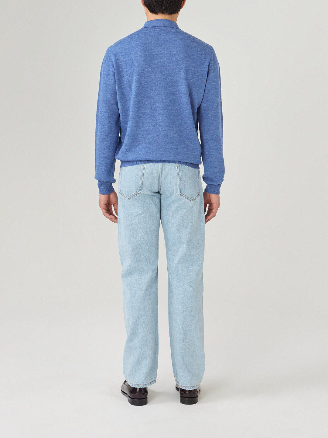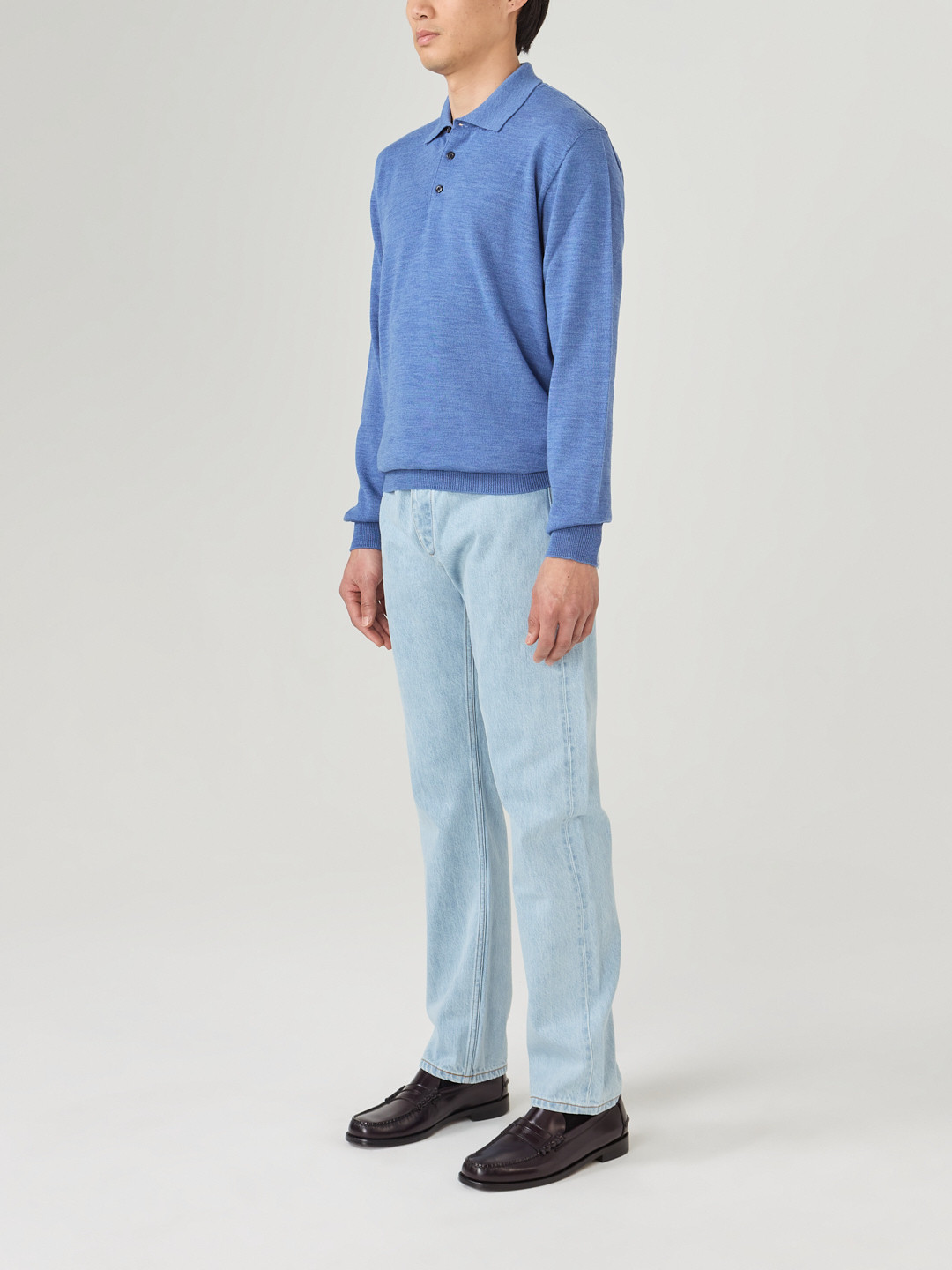 Polo shirt in extra fine light blue merino wool, 3-button collar, long sleeves, woven in Italy.