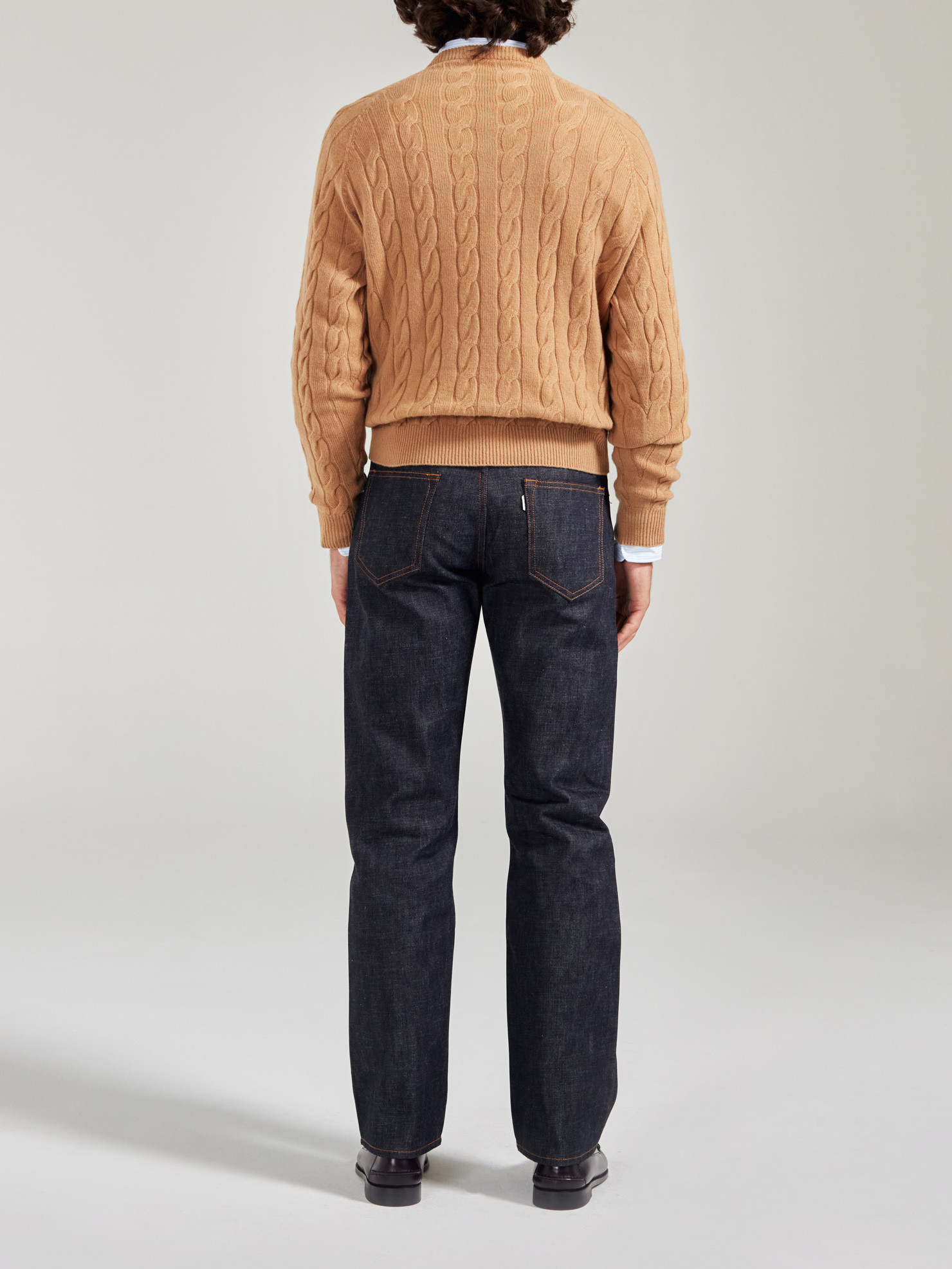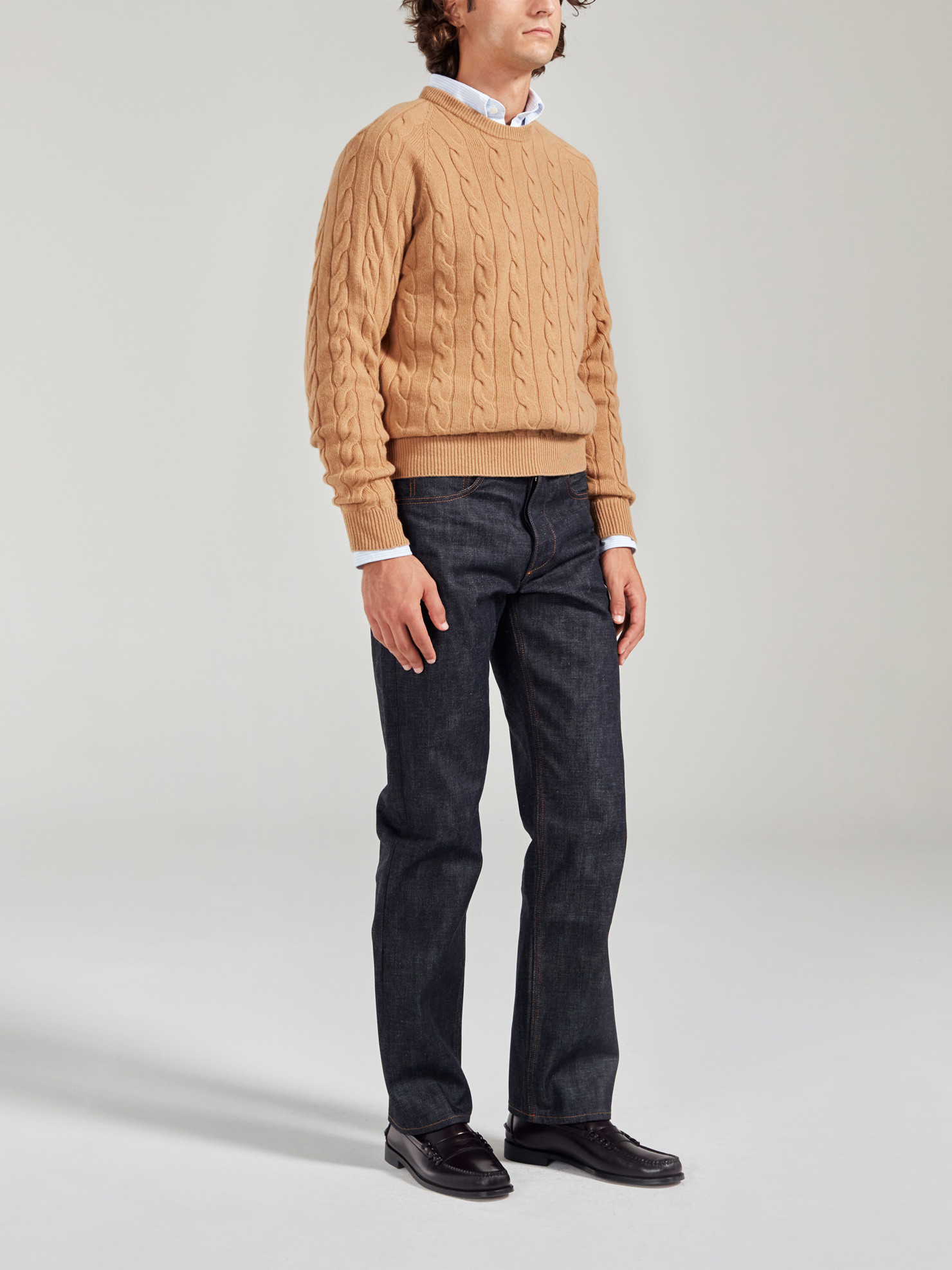Camel wool and cashmere round-neck Pullover, cable knit pattern, long sleeves.