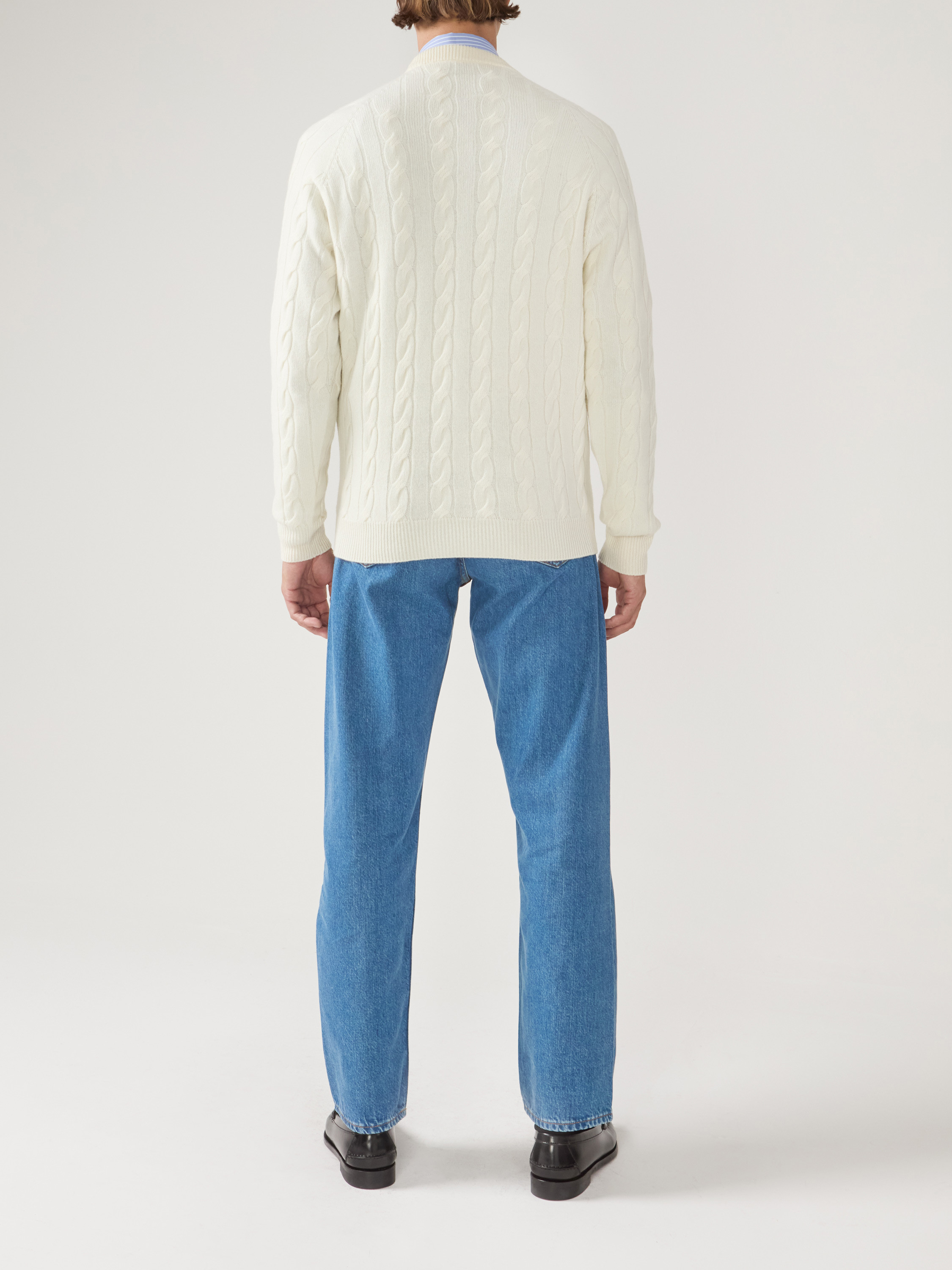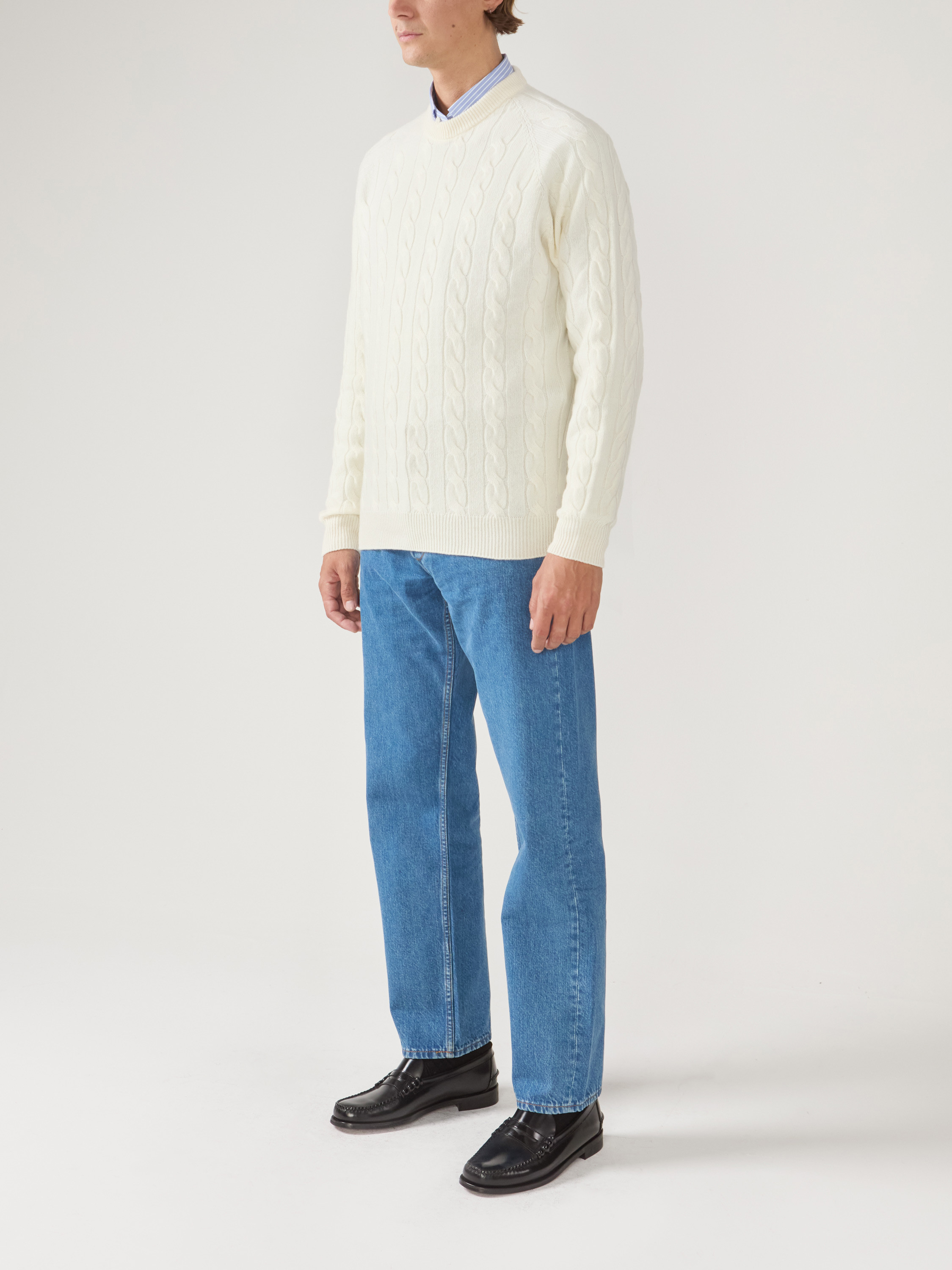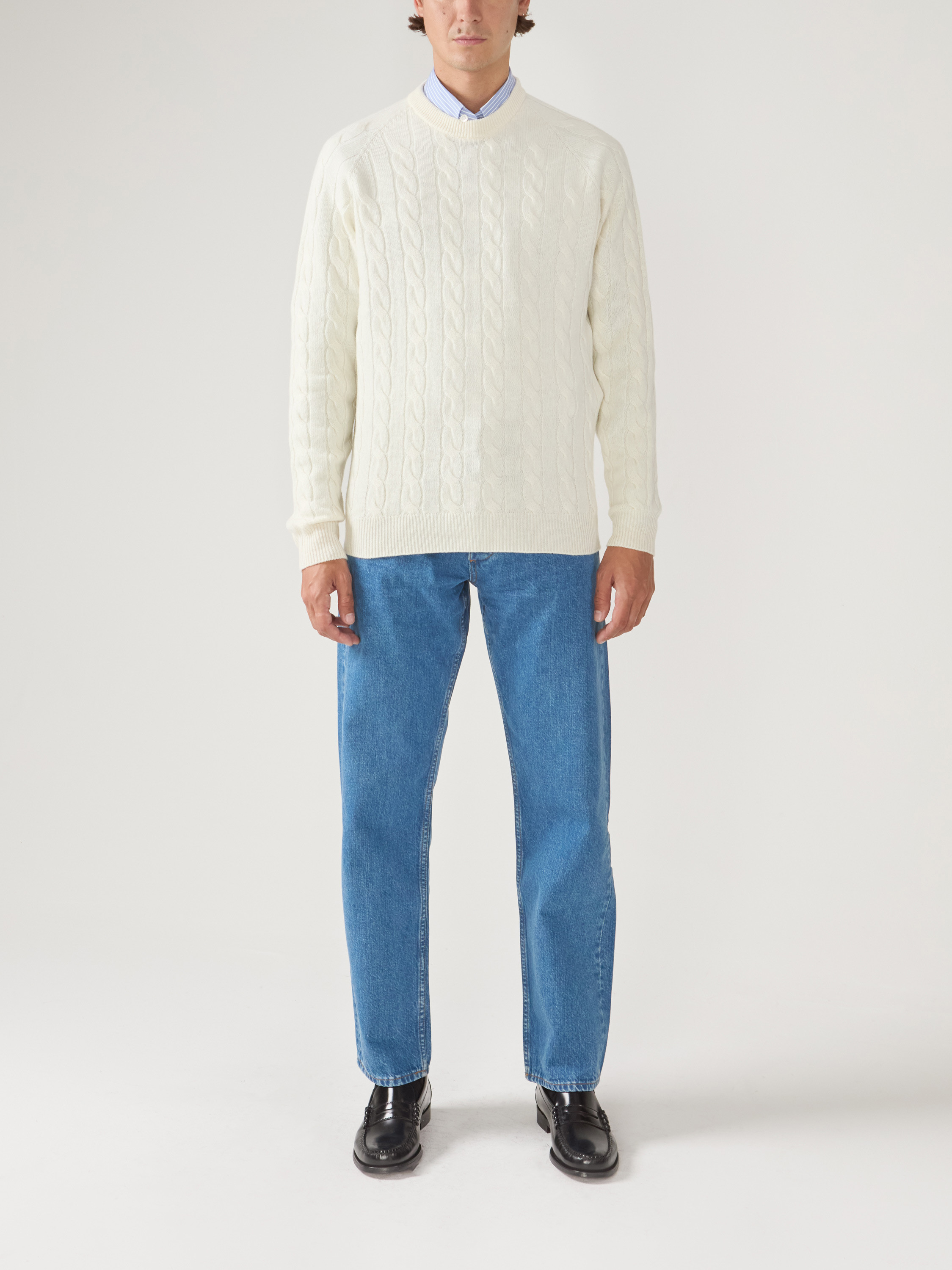Ecru wool and cashmere round-neck Pullover, cable knit pattern, long sleeves.